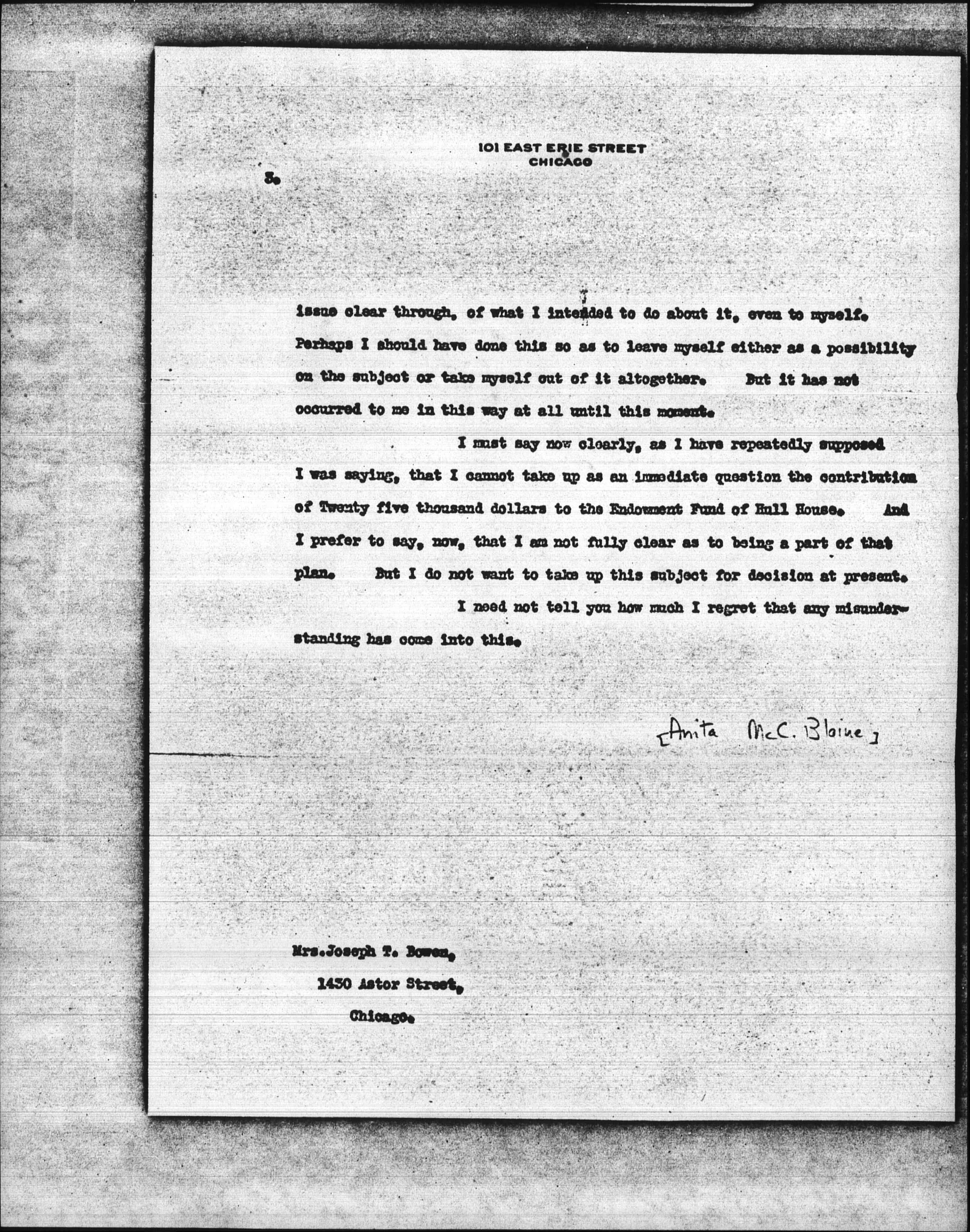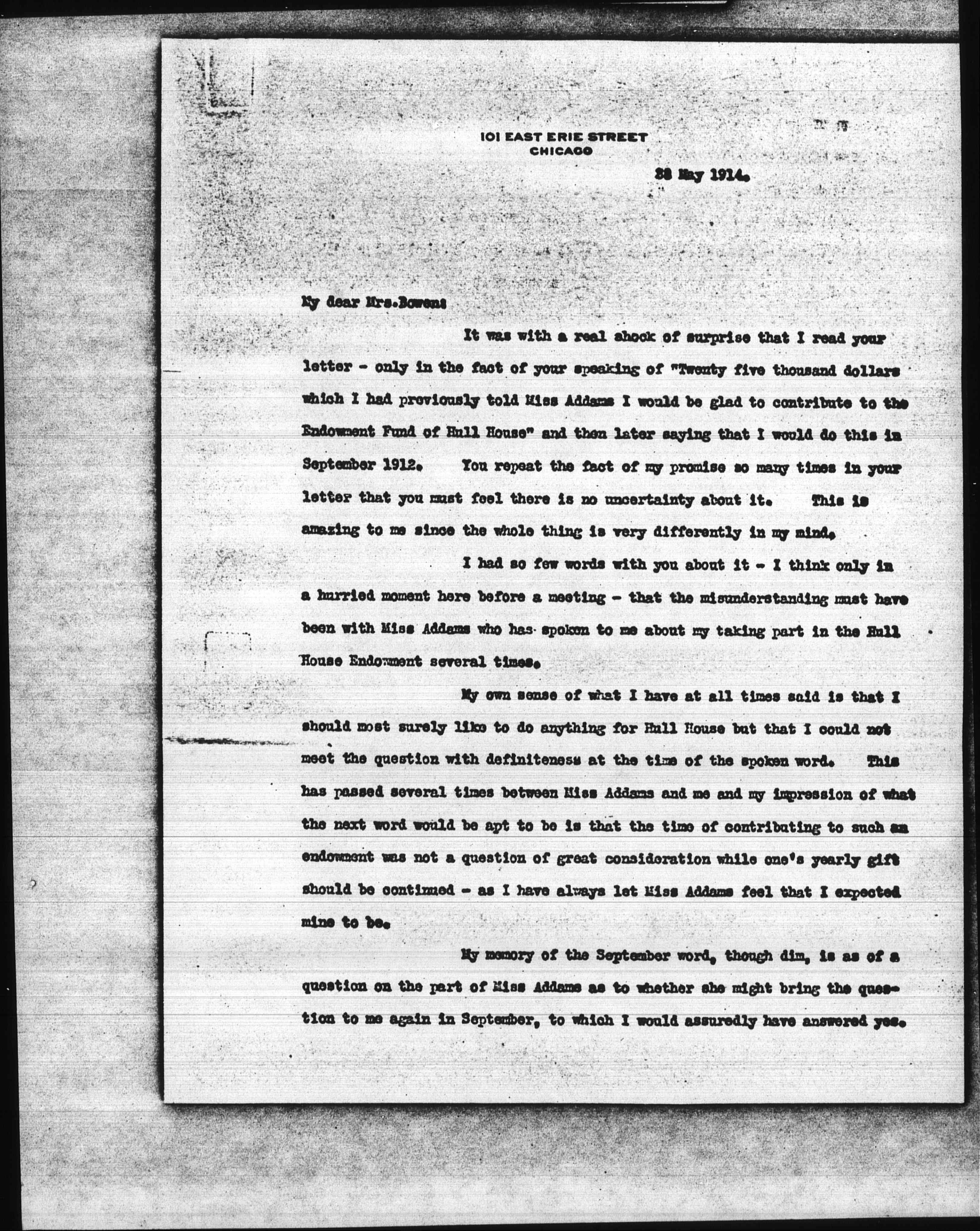 It was with a real shock of surprise that I read your letter -- only in the fact of your speaking of "Twenty-five thousand dollars which I had previously told Miss Addams I would be glad to contribute to the Endowment Fund of Hull House" and then later saying that I would do this in September 1912. You repeat the fact of my promise so many times in your letter that you must feel there is no uncertainty about it. This is amazing to me since the whole thing is very different in my mind.