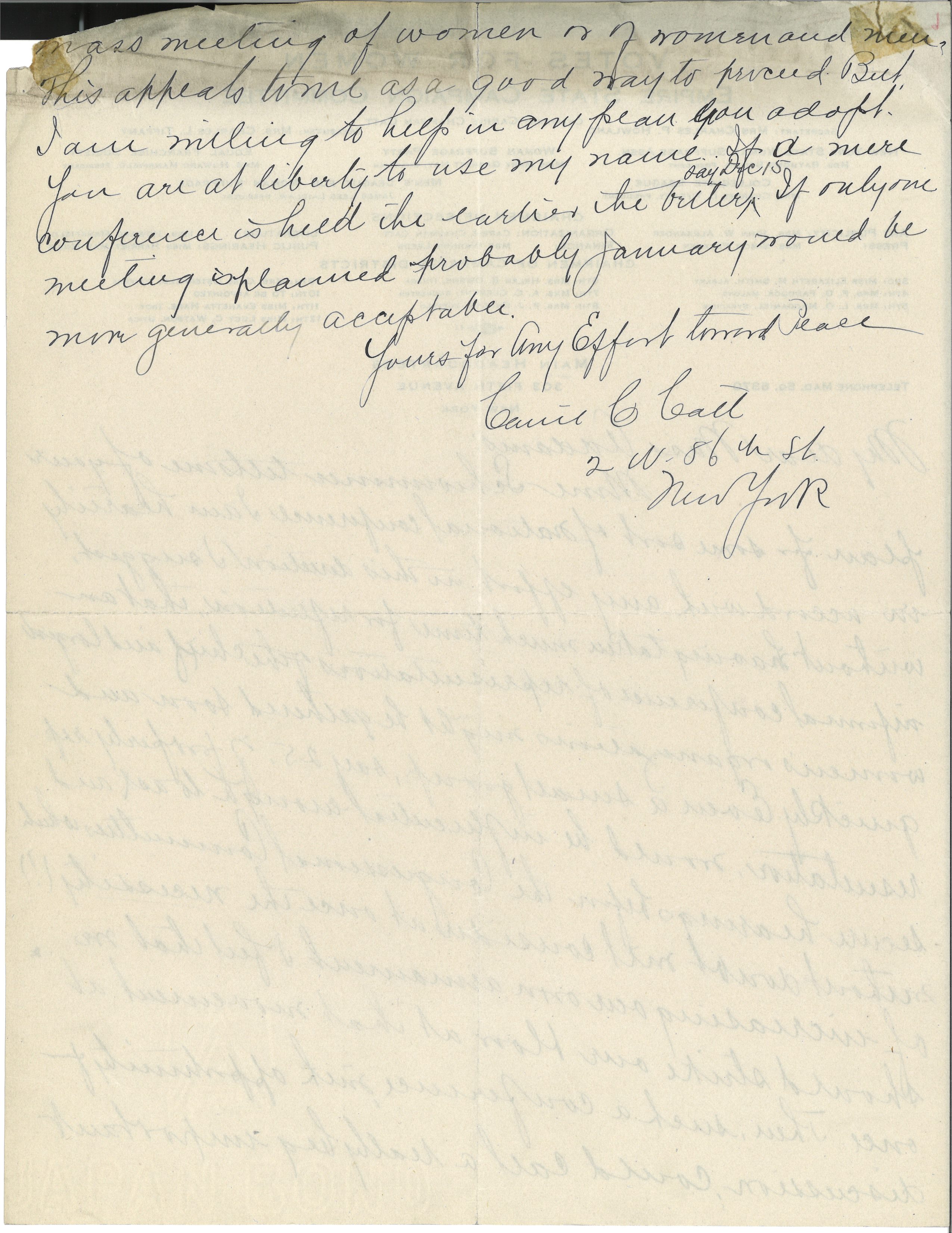 Mme Schwimmer tells me of your plan for some sort of national conference. I am heartily in accord with any effort in this direction. I suggest, without having taken much time for reflection, that an informal conference of representatives of the chief and largest women's organizations might be gathered soon and quickly. Even a small group, say 25, of properly representative, would be influential enough to ask and secure hearings before the Congressional Committees which without doubt will consider at once the necessity (!) of increasing our own armament. I feel that we should strike our blow at that movement at once. Then, such a conference, with opportunity for discussion, could call a really big important [page 2] mass meeting of women or of women and men.