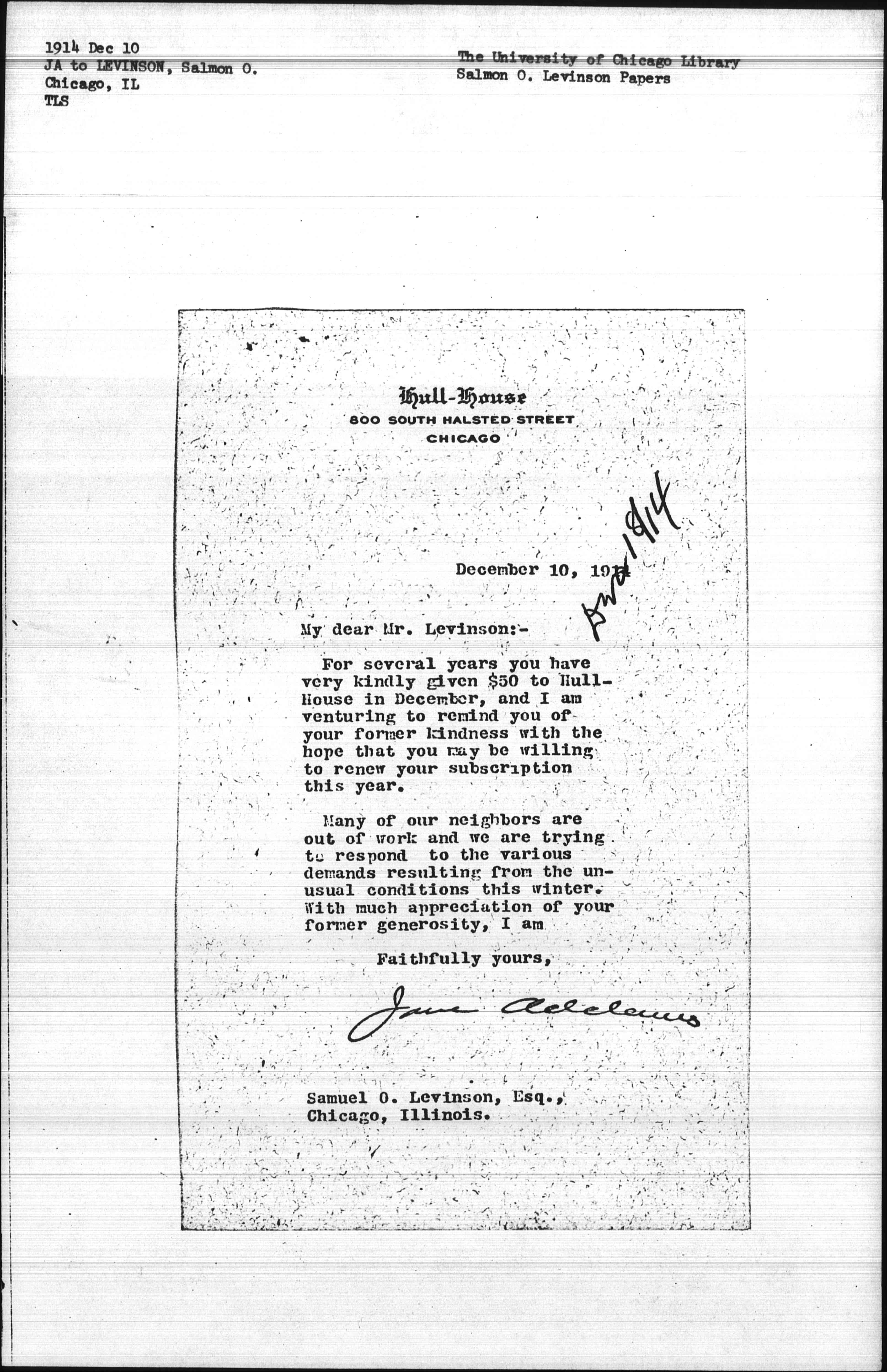 For several years you have very kindly given $50 to Hull-House in December, and I am venturing to remind you of your former kindness with the hope that you may be willing to renew your subscription this year.