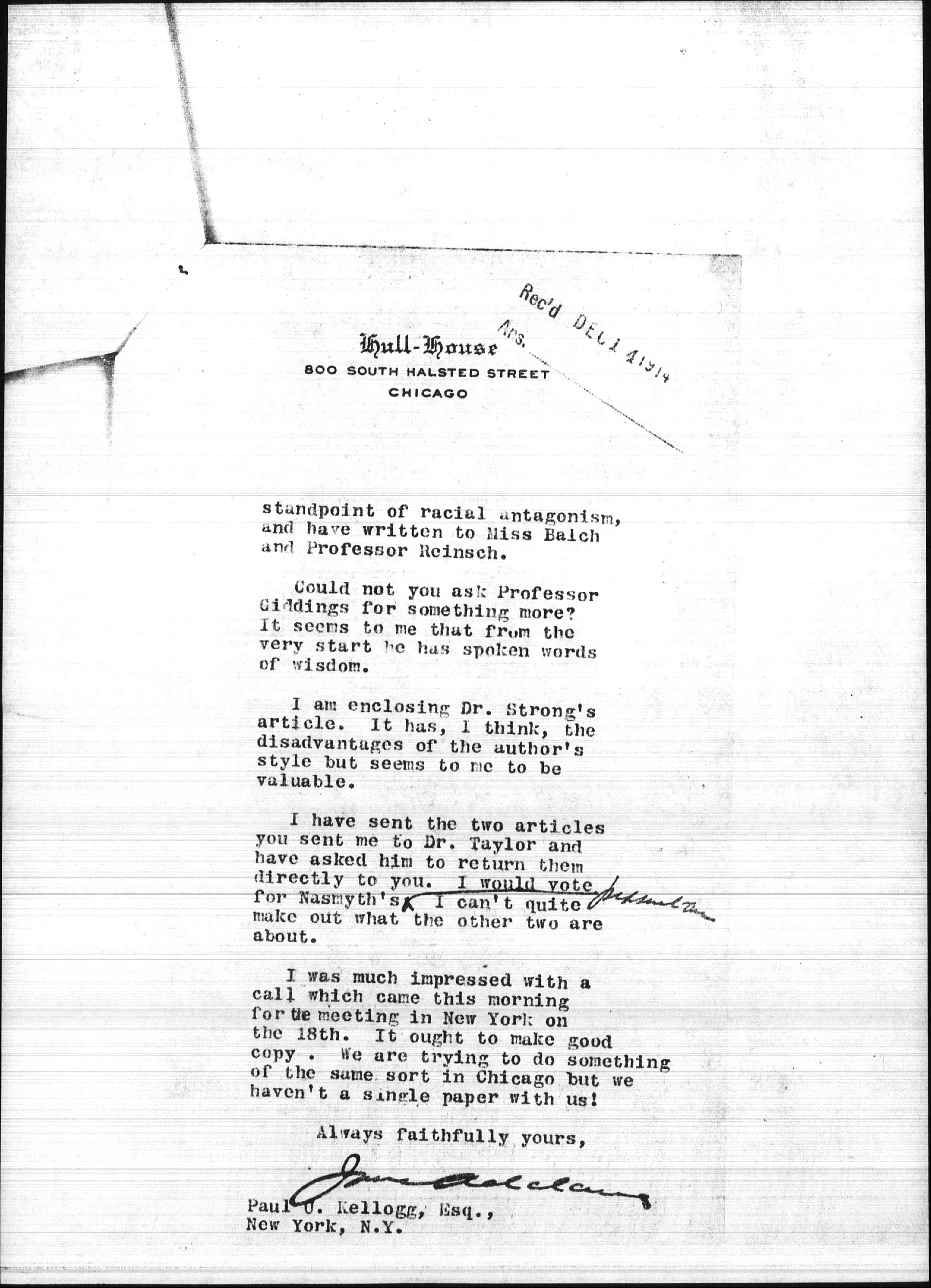 I have also asked Professor W. I. Thomas to write something from the [page 2] standpoint of racial antagonism, and have written to Miss Balch and Professor Reinsch.