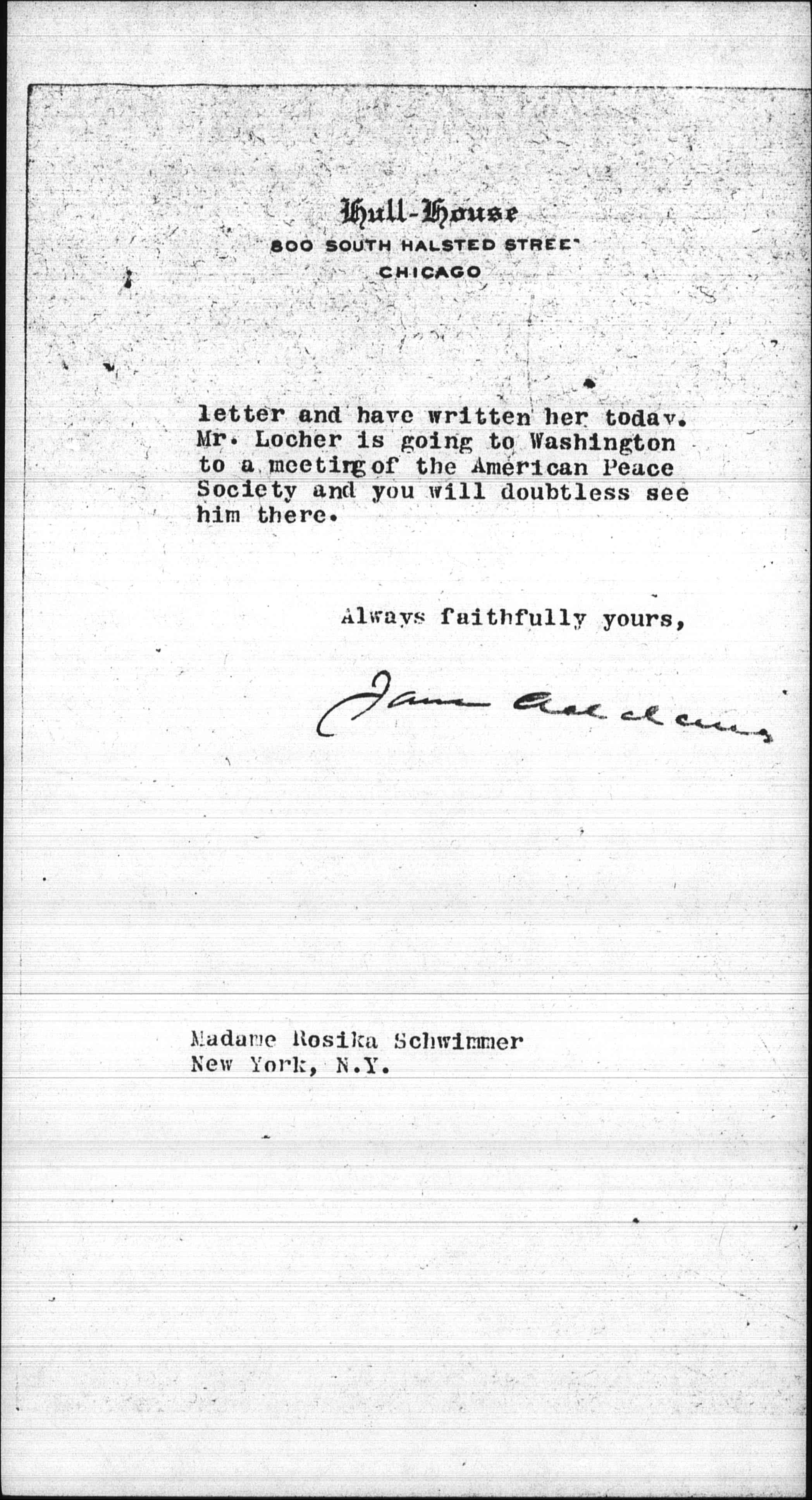 I received Mrs. Catt's kind [page 2] letter and have written her today. Mr. [Lochner] is going to Washington to a meeting of the American Peace Society and you will doubtless see him there.