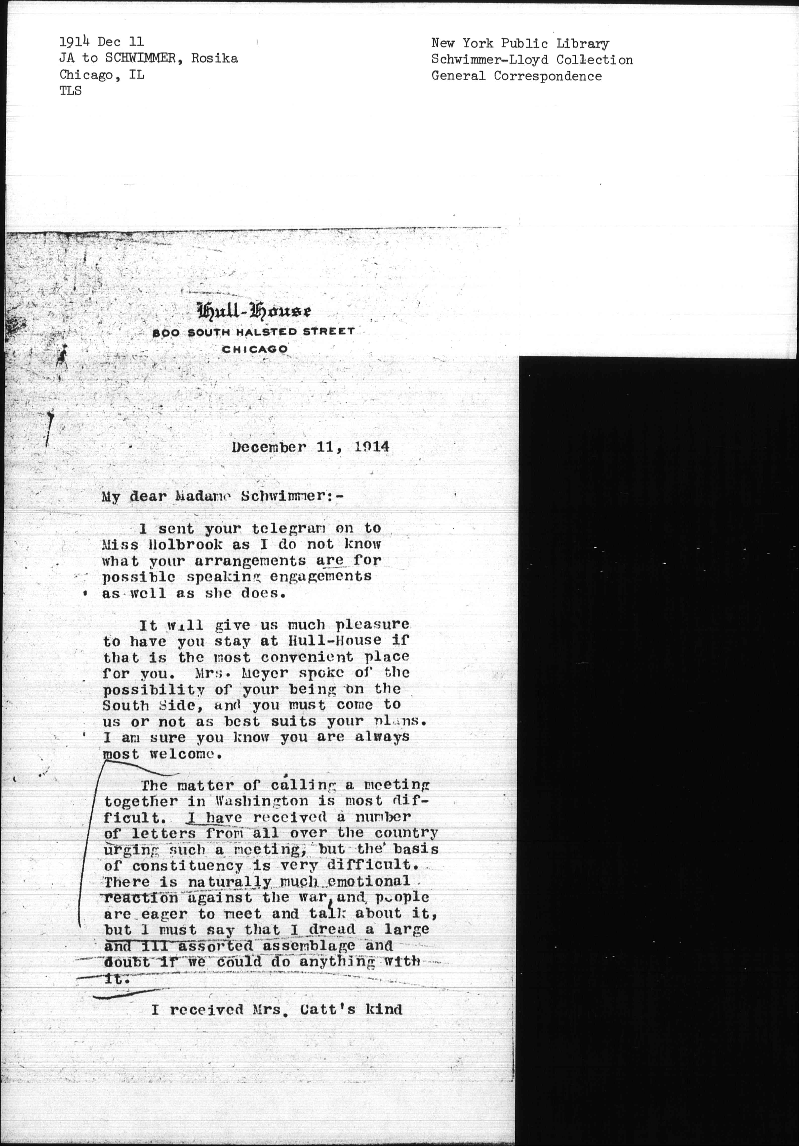 It will give us much pleasure to have you stay at Hull-House if that is the most convenient place for you. Mrs. Meyer spoke of the possibility of your being on the South Side, and you must come to us or not as best suits your plans. I am sure you know you are always most welcome.
