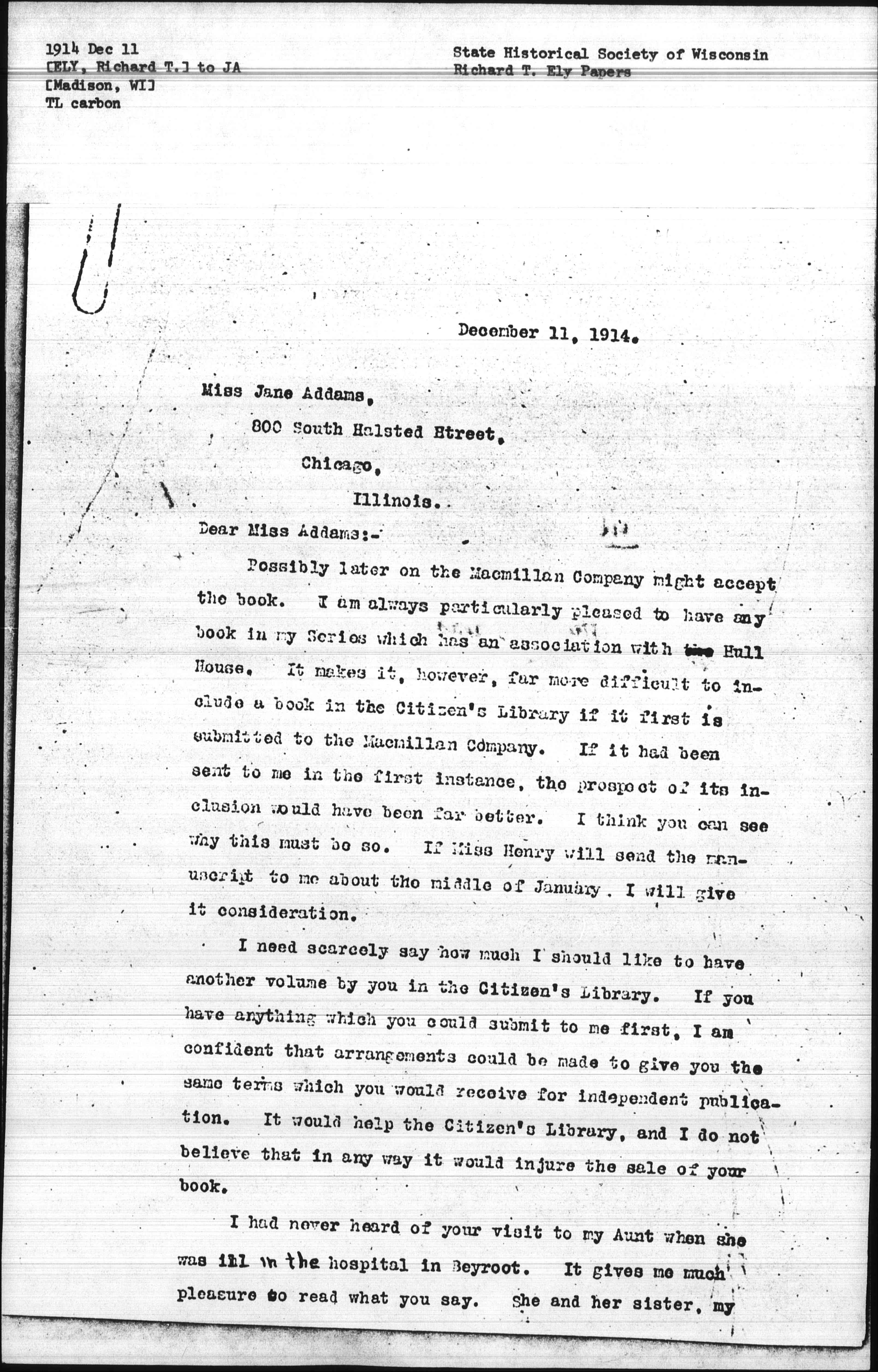 Possibly later on the Macmillan Company might accept the book. I am always particularly pleased to have any book in my Series which has an association with the Hull House. It makes it, however, far more difficult to include a book in the Citizen's Library if it first is submitted to the Macmillan Company. If it had been sent to me in the first instance, the prospect of its inclusion would have been far better. I think you can see why this must be so. If Miss Henry will send the manuscript to me about the middle of January I will give it consideration.