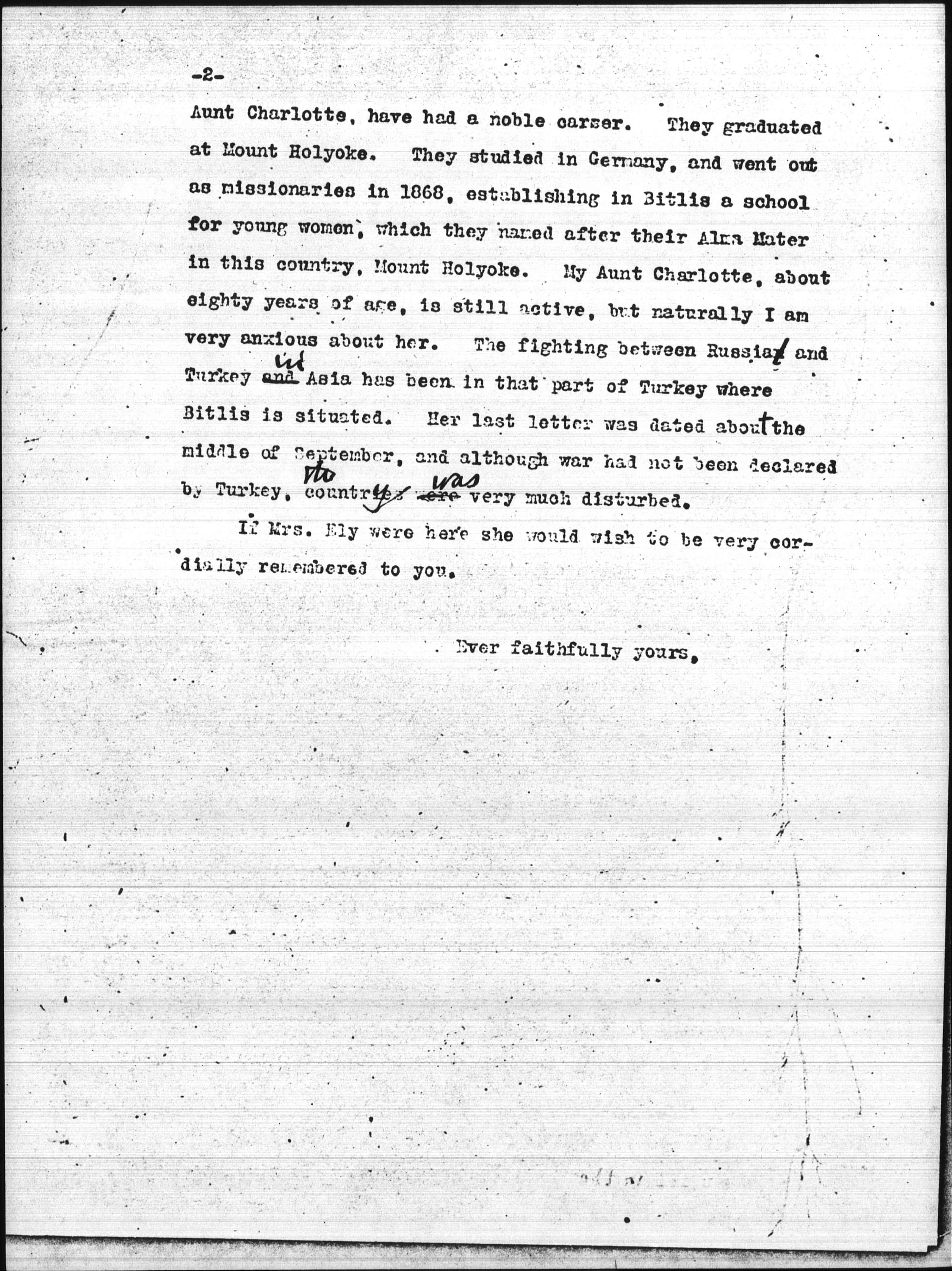 I had never heard of your visit to my Aunt when she was ill in the hospital in [Beirut]. It gives me much pleasure to read what you say. She and her sister, my [page 2] Aunt Charlotte, have had a noble career. They graduated at Mount Holyoke. They studied in Germany, and went out as missionaries in 1868, establishing in Bitlis a school for young women, which they named after their Alma Mater in this country, Mount Holyoke. My Aunt Charlotte, about eighty years of age, is still active, but naturally I am very anxious about her. The fighting between Russia and Turkey and <in> Asia has been in that part of Turkey where Bitlis is situated. Her last letter was dated about the middle of September, and although war had not been declared by Turkey, <the> [country] were <was> very disturbed.