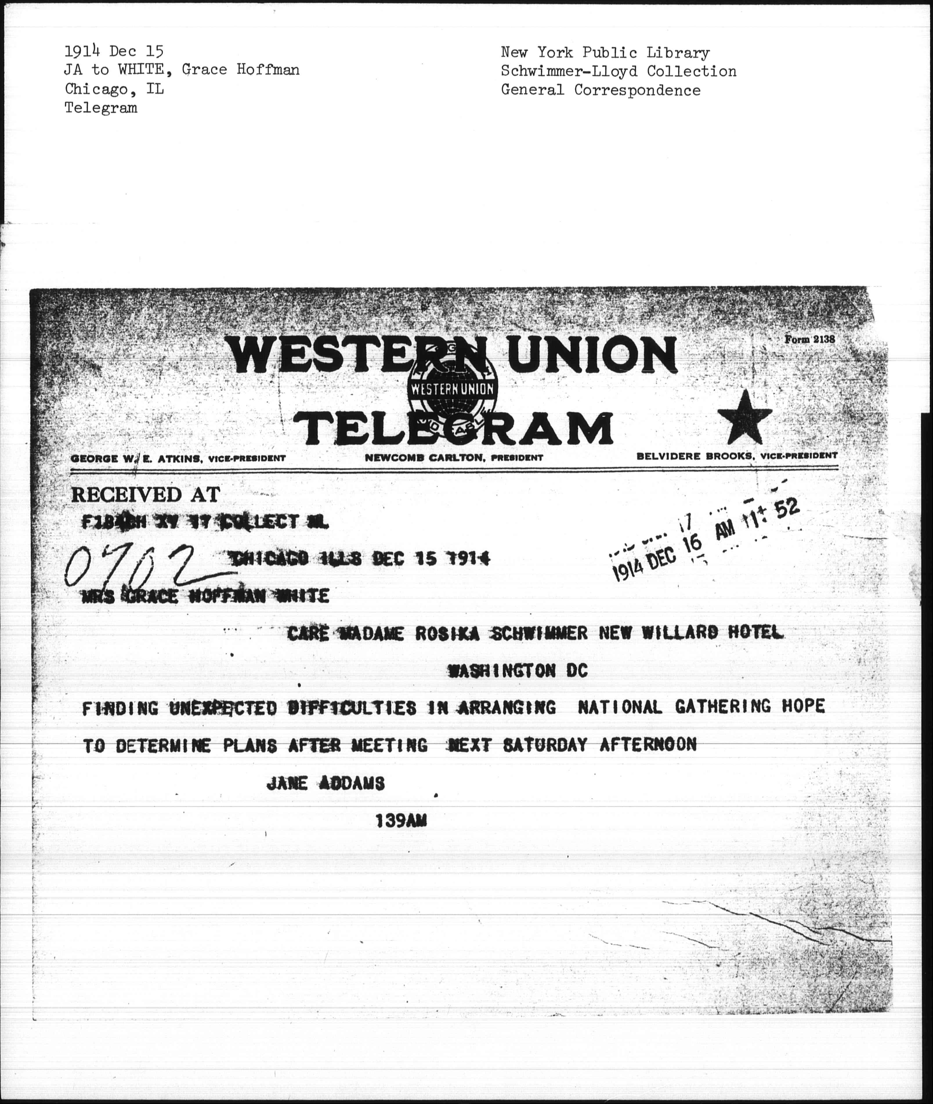 CARE MADAME ROSIKA SCHWIMMER NEW WILLARD HOTEL