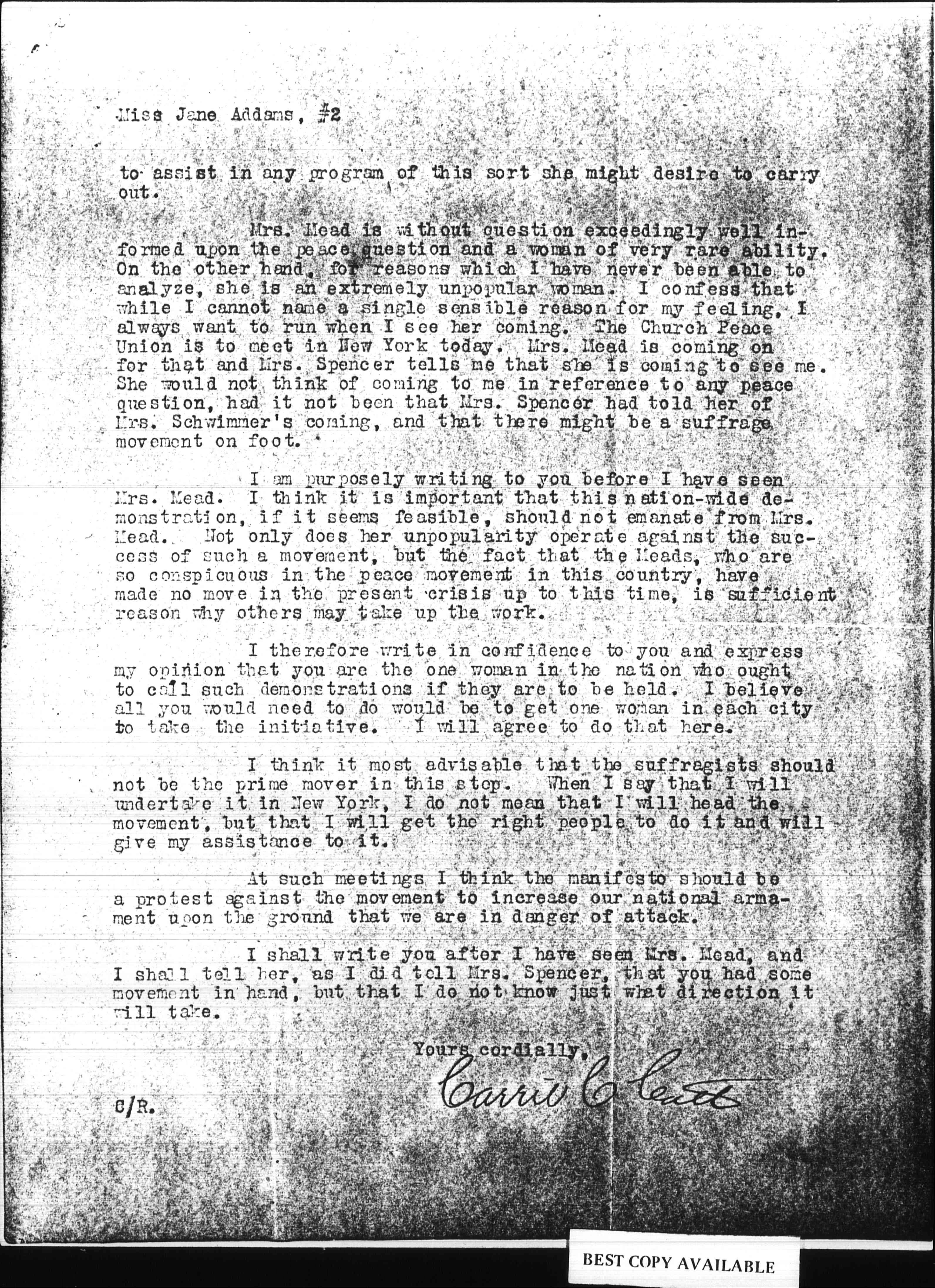 I am purposely writing to you before I have seen Mrs. Mead. I think it is important that this nation-wide demonstration, if it seems feasible, should not emanate from Mrs. Mead. Not only does her unpopularity operate against the success of such a movement, but the fact that the Meads, who are so conspicuous in the peace movement in this country, have made no move in the present crisis up to this time, is sufficient reason why others may take up the work.