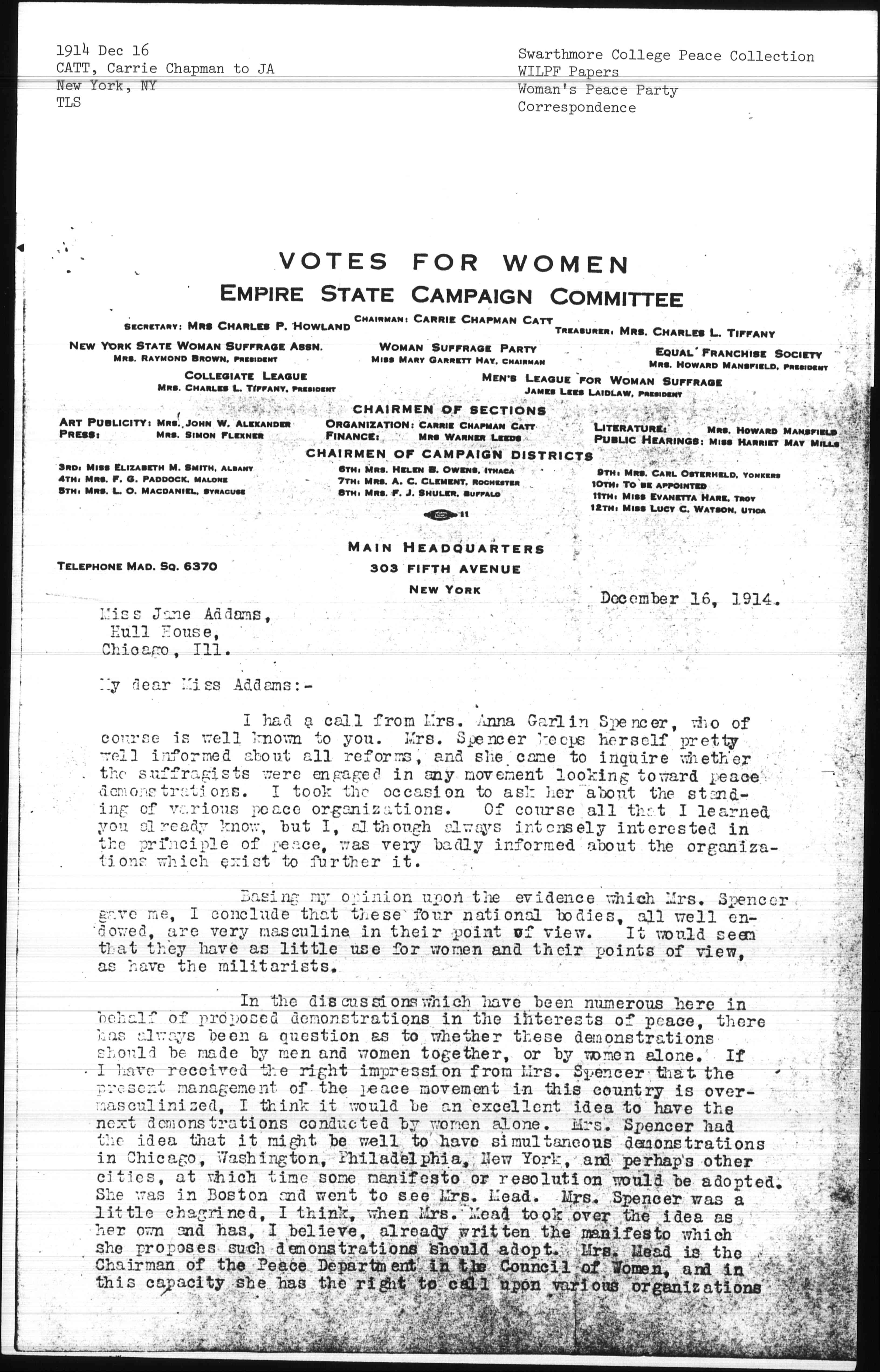 In the discussions which have been numerous here in behalf of proposed demonstrations in the interests of peace, there has always been a questions as to whether these demonstrations should be made by men and women together, or by women alone. If I have received the right impression from Mrs. Spencer that the present management of the peace movement in this country is overmasculinized, I think it would be an excellent idea to have the next demonstrations conducted by women alone. Mrs. Spencer had the idea that it might be well to have simultaneous demonstrations in Chicago, Washington, Philadelphia, New York, and perhaps other cities, at which time some manifesto or resolution would be adopted. She was in Boston and went to see Mrs. Mead. Mrs. Spencer was a little chagrined, I think, when Mrs. Mead took over the idea as her own and has, I believe, already written the manifesto which she proposes such demonstrations should adopt. Mrs. Mead is the Chairman of the Peace Department in the Council of Women, and in this capacity she has the right to call upon various organizations [page 2] to assist in any program of this sort she might desire to carry out.
