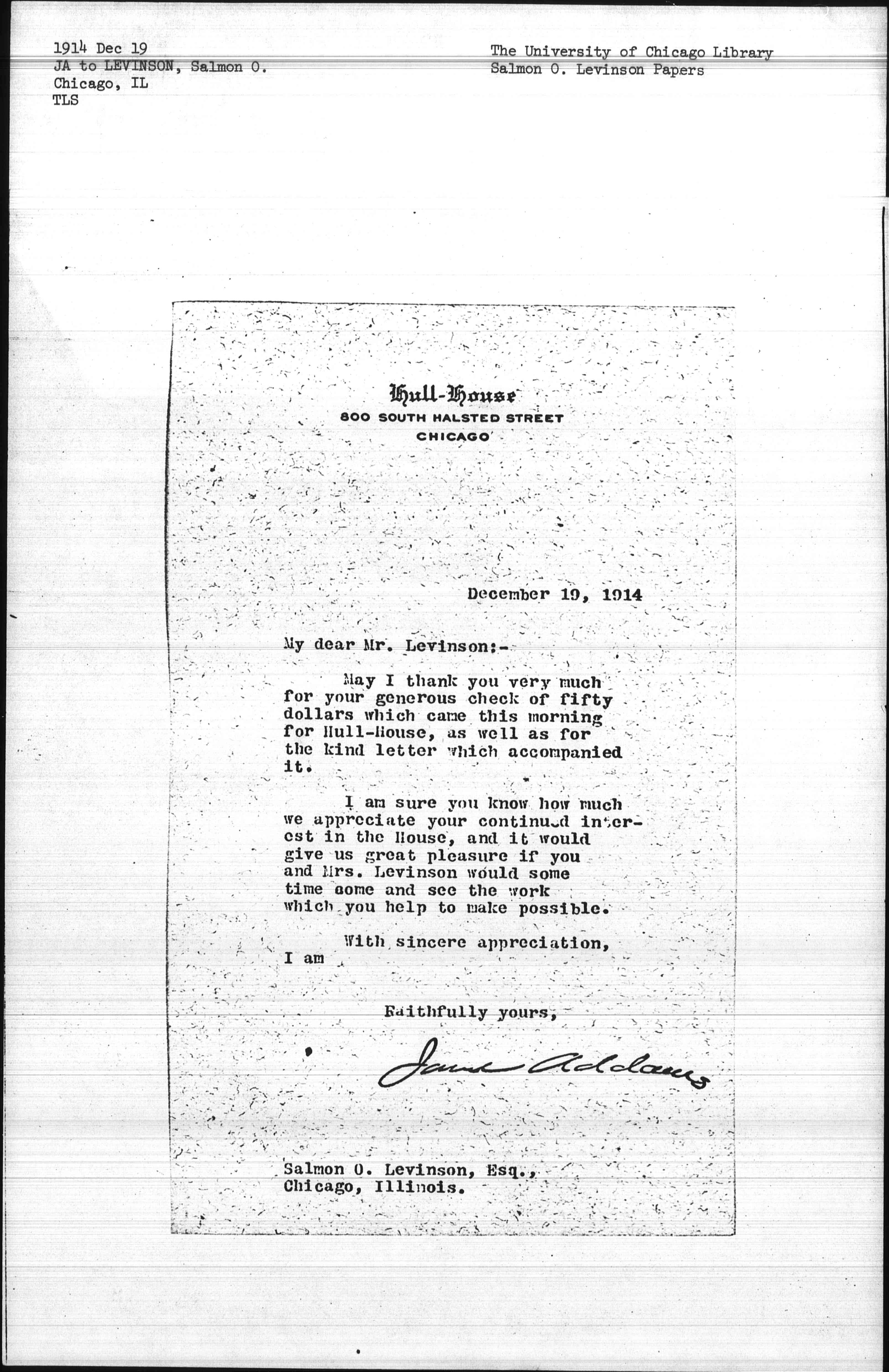 May I thank you very much for your generous check of fifty dollars which came this morning for Hull-House, as well as for the kind letter which accompanied it.
