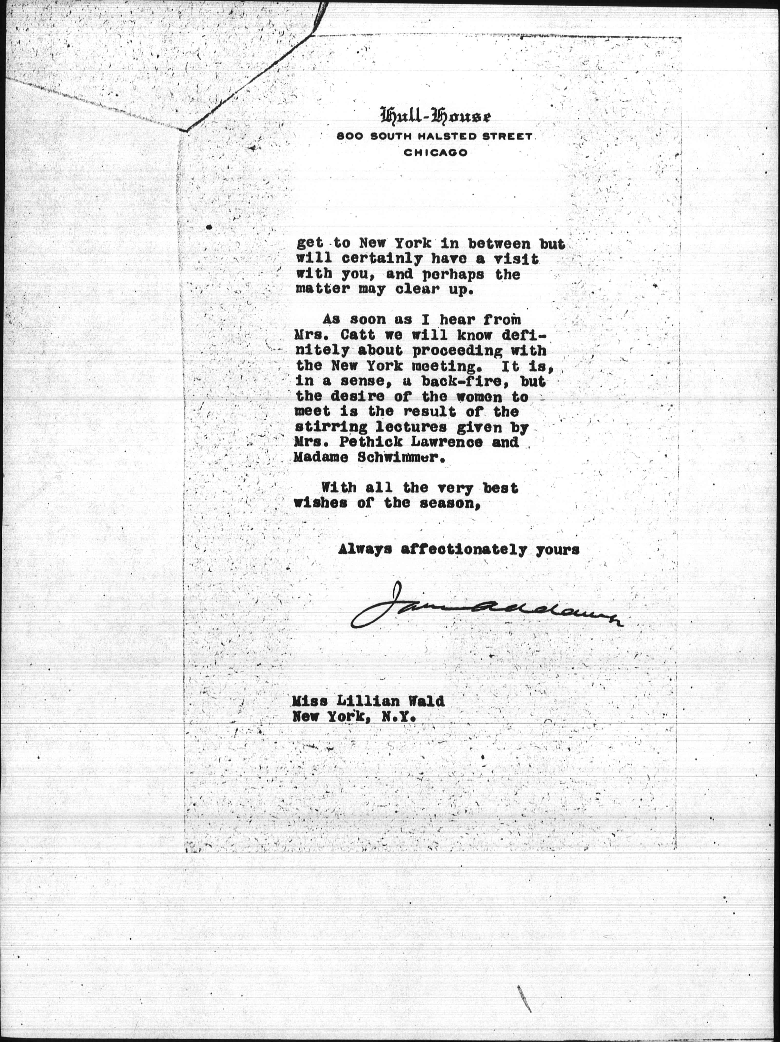 As soon as I hear from Mrs. Catt we will know definitely about proceeding with the New York meeting. It is, in a sense, a back-fire, but the desire of the women to meet is the result of the stirring lectures given by Mrs. Pethick Lawrenc and Madame Schwimmer.