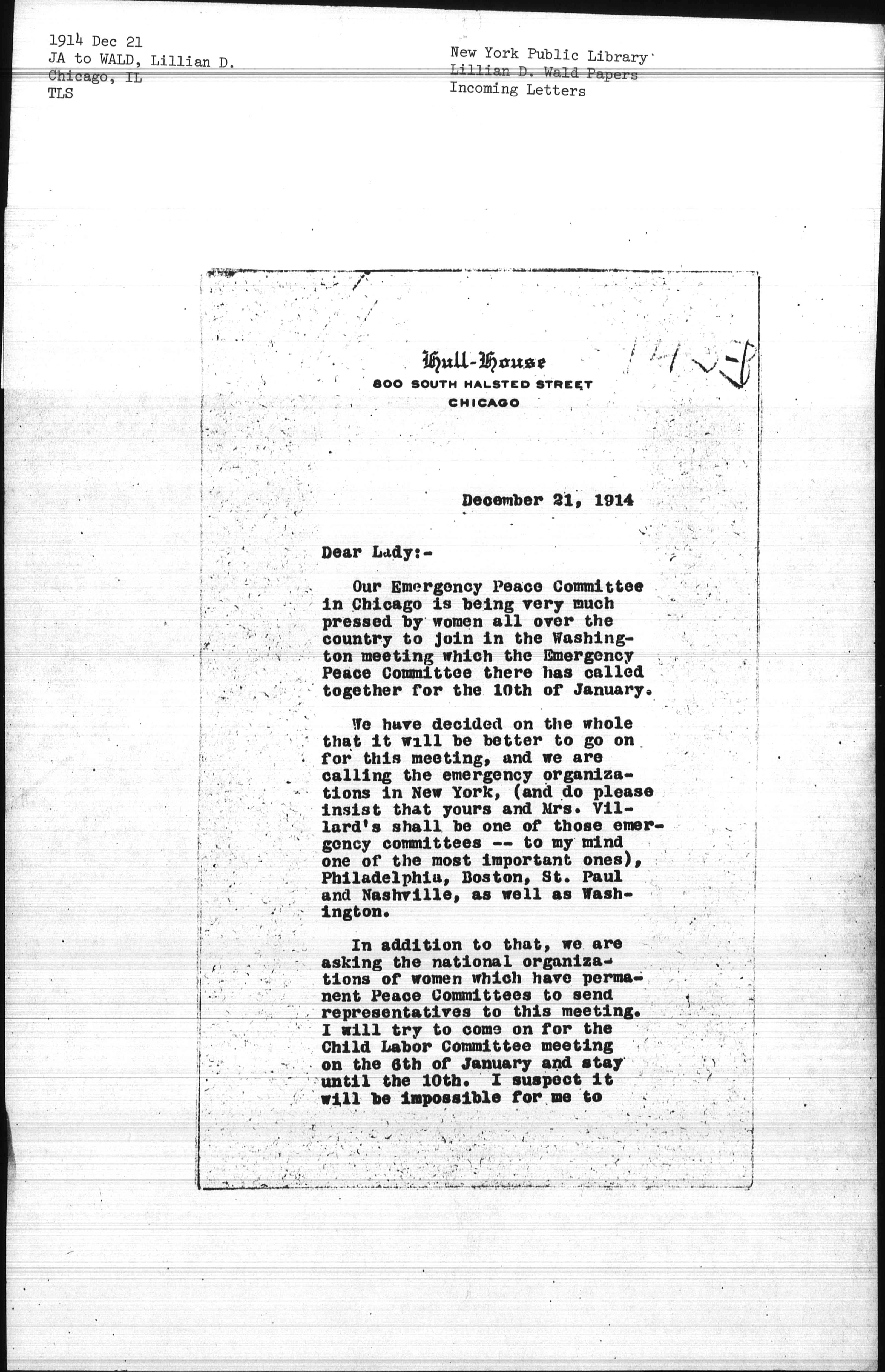 In addition to that, we are asking the national organizations of women which have permanent Peace Committees to send representatives to this meeting. I will try to come on for the Child Labor Committee meeting on the 6th of January and stay until the 10th. I suspect it will be impossible for me to [page 2] get to New York in between but will certainly have a visit with you, and perhaps the matter may clear up.
