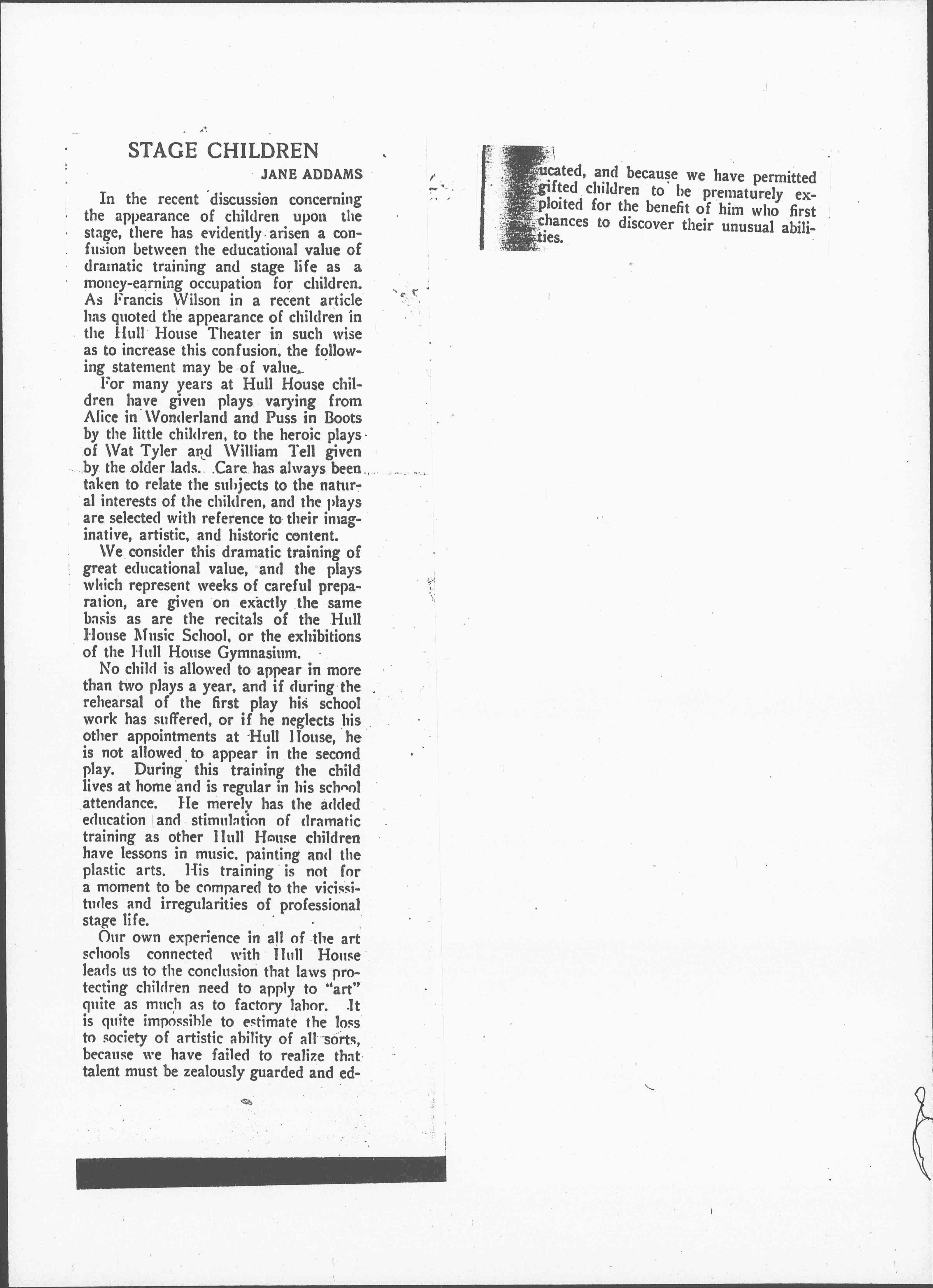 Our own experience in all of the art schools connected with Hull House leads us to the conclusion that laws protecting children need to apply to "art" quite as much as to factory labor. It is quite impossible to estimate the loss to society of artistic ability of all sorts, because we have failed to realize that talent must be zealously guarded and educated, and because we have permitted gifted children to be prematurely exploited for the benefit of him who first chances to discover their unusual abilities.