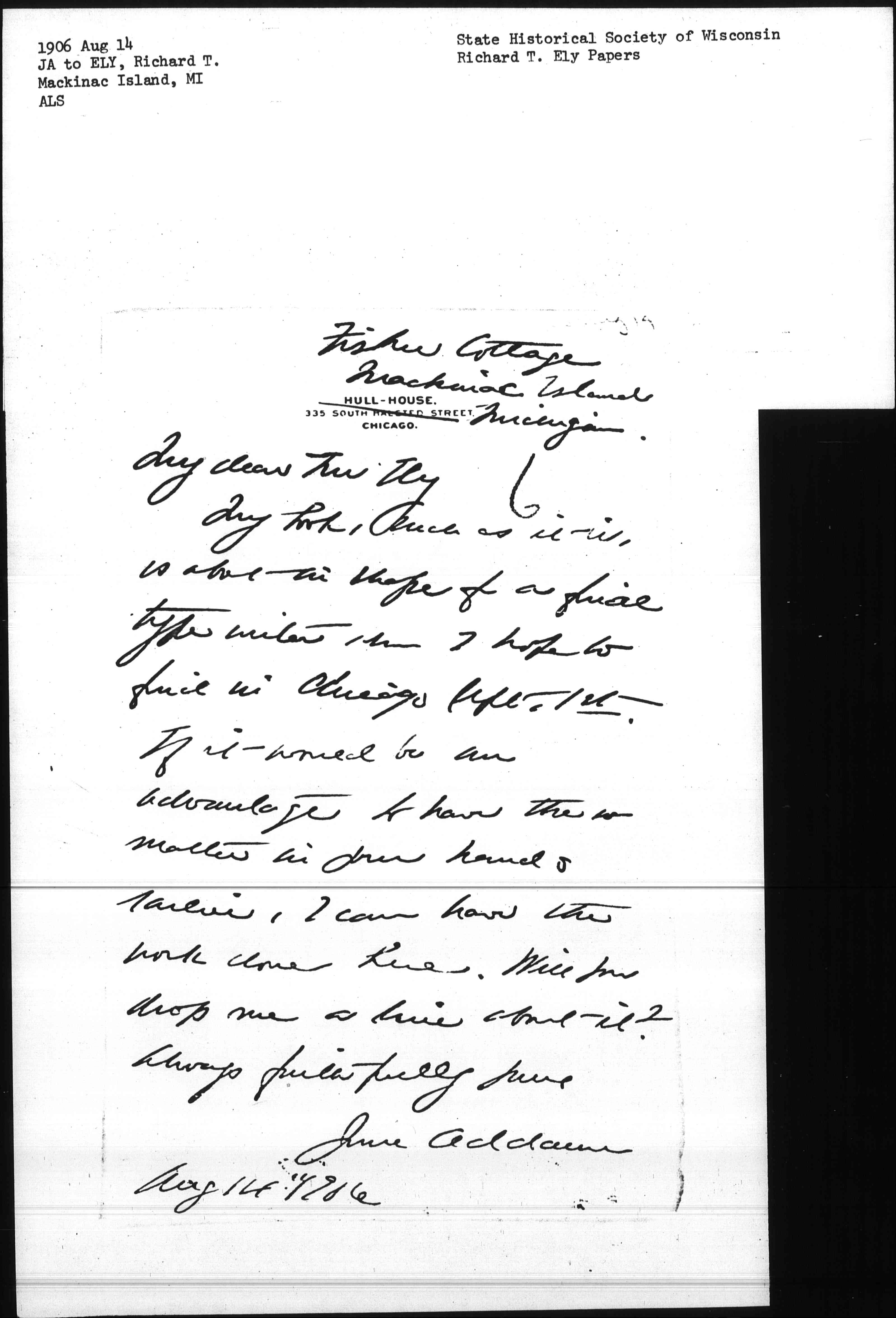My book, such as it is, is about in shape for a final type writer who I hope to find in Chicago Sept. 1st. If it would be an advantage to have the matter in your hands earlier, I can have the work done here. Will you drop me a line about it?
