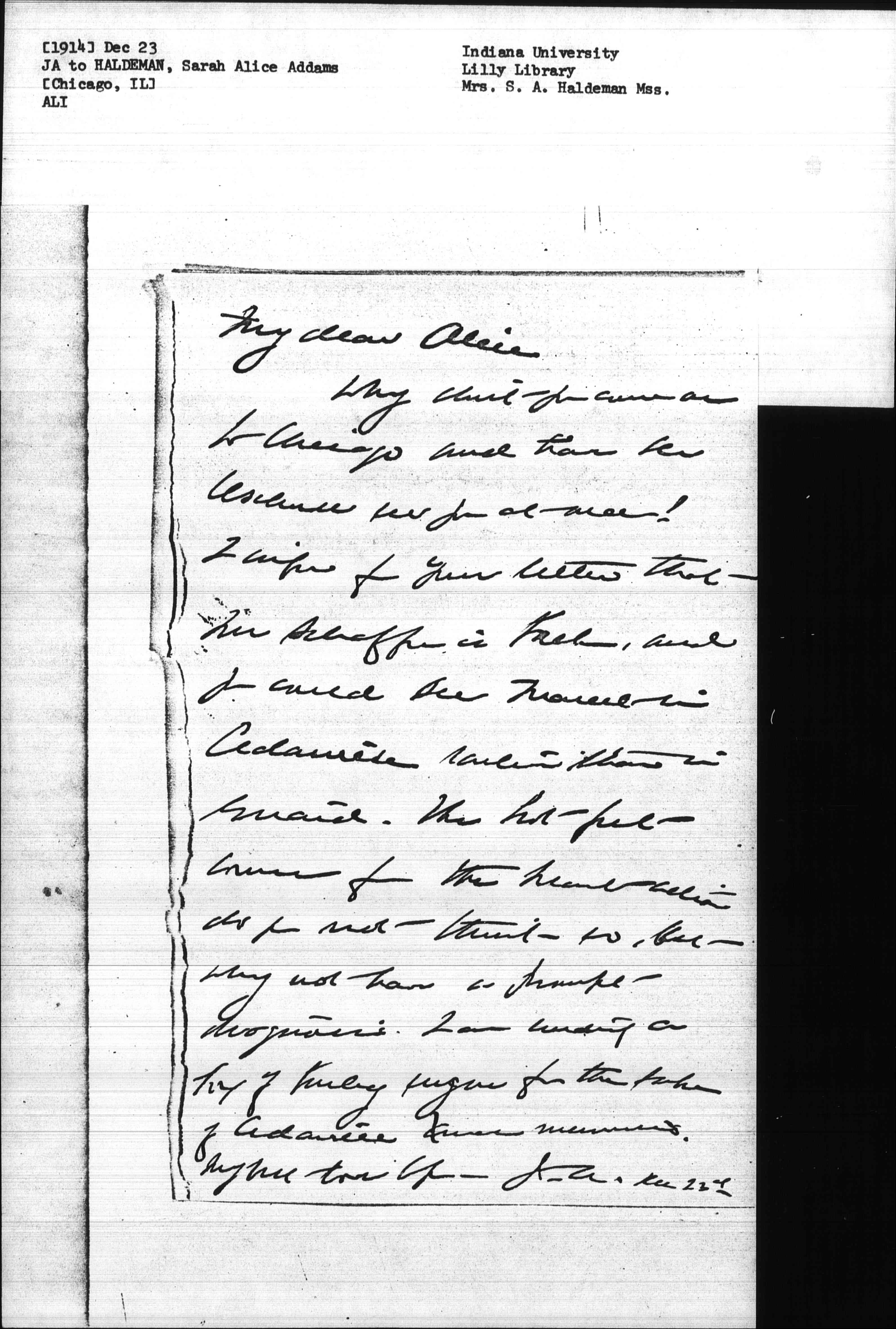 Why don't you come on to Chicago and have Dr [Ochsner] see you at once? I infer from your letter that Mr Schaffer is back, and you could see Marcet in Cedarville earlier than in Girard. The [hot feet] comes from the heart action do you not think so, but why not have a prompt diagnosis. I am sending a box of [illegible] sugar for the sake of Cedarville Xmas memories.