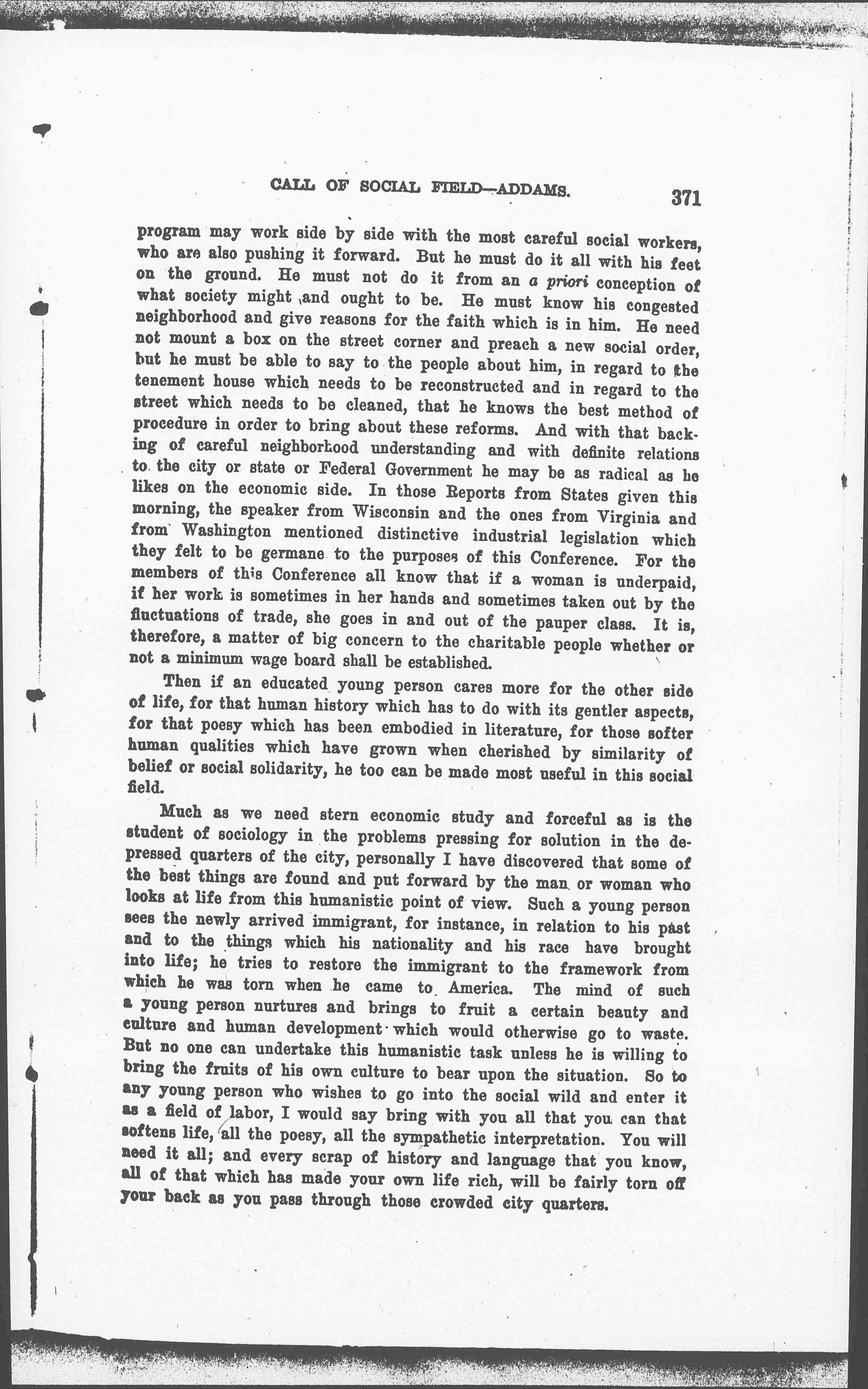 A young person possessed with a fine enthusiasm for a new social [page 2] program may work side by side with the most careful social workers, who are also pushing it forward. But he must do it all with his feet on the ground. He must not do it from an a priori conception of what society might and ought to be. He must know his congested neighborhood and give reasons for the faith which is in him. He need not mount a box on the street corner and preach a new social order, but he must be able to say to the people about him, in regard to the tenement house which needs to be reconstructed and in regard to the street which needs to be cleaned, that he knows the best method of procedure in order to bring about these reforms. And with that backing of careful neighborhood understanding and with definite relations to the city or state or Federal Government he may be as radical as he likes on the economic side. In those Reports from States given this morning, the speaker from Wisconsin and the ones from Virginia and from Washington mentioned distinctive industrial legislation which they felt to be germane to the purposes of this Conference. For the members of this Conference all know that if a woman is underpaid, if her work is sometimes in her hands and sometimes taken out by the fluctuations of trade, she goes in and out of the pauper class. It is, therefore, a matter of big concern to the charitable people whether or not a minimum wage board shall be established.