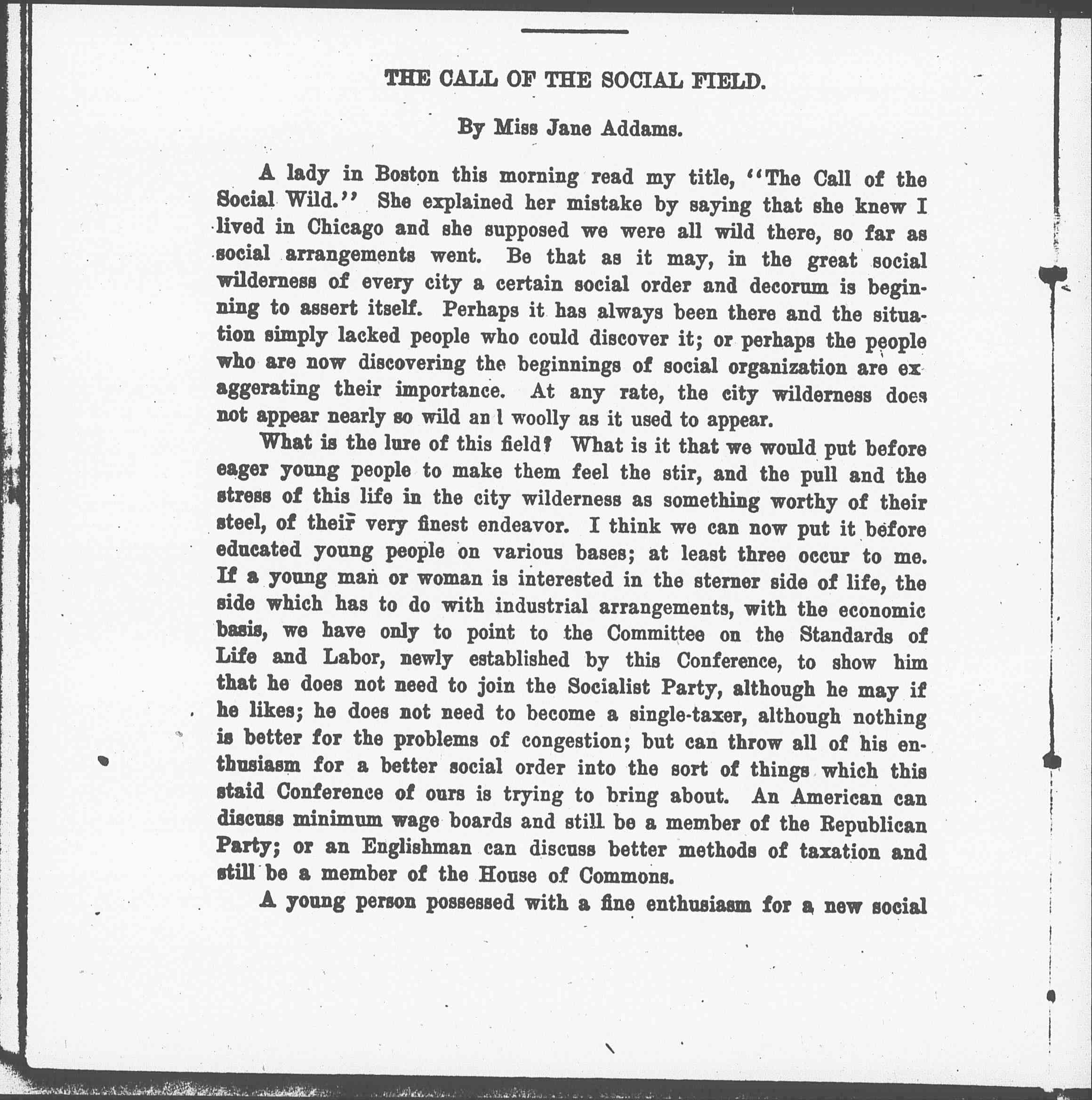 Much as we need stern economic study and forceful as is the student of sociology in the problems pressing for solution in the depressed quarters of the city, personally I have discovered that some of the best things are found and put forward by the man or woman who looks at life from this humanistic point of view. Such a young person sees the newly arrived immigrant, for instance, in relation to his past and to the things which his nationality and his race have brought into life; he tries to restore the immigrant to the framework from which he was torn when he came to America. The mind of such a young person nurtures and brings to fruit a certain beauty and culture and human development which would otherwise go to waste. But no one can undertake this humanistic task unless he is willing to bring the fruits of his own culture to bear upon the situation. So to any young person who wishes to go into the social wild and enter it as a field of labor, I would say bring with you all that you can that softens life, all the [poetry], all the sympathetic interpretation. You will need it all; and every scrap of history and language that you know, all of that which has made your own life rich, will be fairly torn off your back as you pass through those crowded city quarters. [page 3]