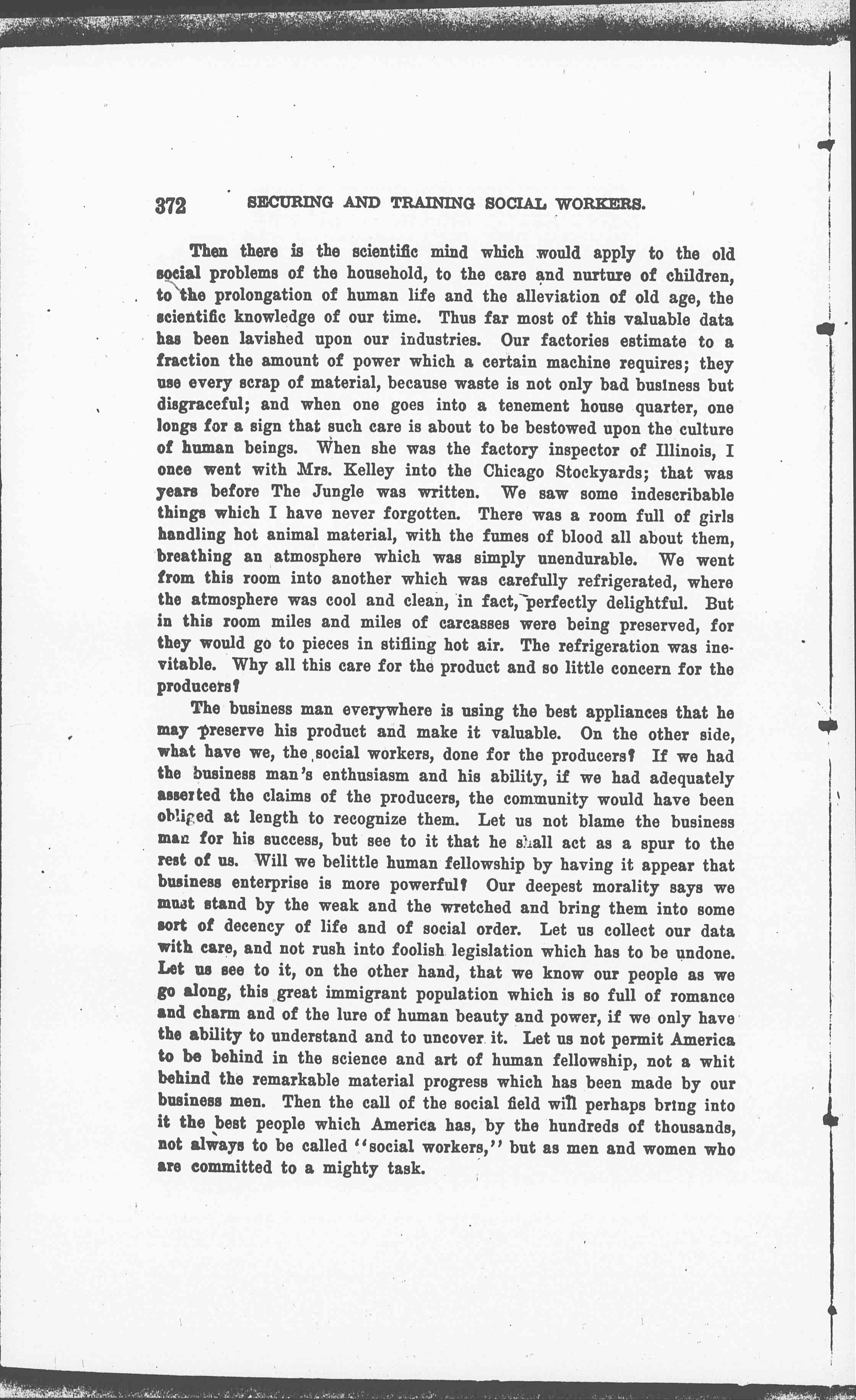 The business man everywhere is using the best appliances that he may preserve his product and make it valuable. On the other side, what have we, the social workers, done for the producers? If we had the business man's enthusiasm and his ability, if we had adequately asserted the claims of the producers, the community would have been obliged at length to recognize them. Let us not blame the business man for his success, but see to it that he shall act as a spur to the rest of us. Will we belittle human fellowship by having it appear that business enterprise is more powerful? Our deepest morality says we must stand by the weak and the wretched and bring them into some sort of decency of life and of social order. Let us collect our data with care, and not rush into foolish legislation which has to be undone. Let us see to it, on the other hand, that we know our people as we go along, this great immigrant population which is so full of romance and charm and of the lure of human beauty and power, if we only have the ability to understand and to uncover it. Let us not permit America to be behind in the science and art of human fellowship, not a whit behind the remarkable material progress which has been made by our business men. Then the call of the social field will perhaps bring into it the best people which America has, by the hundreds of thousands, not always to be called "social workers," but as men and women who are committed to a mighty task.