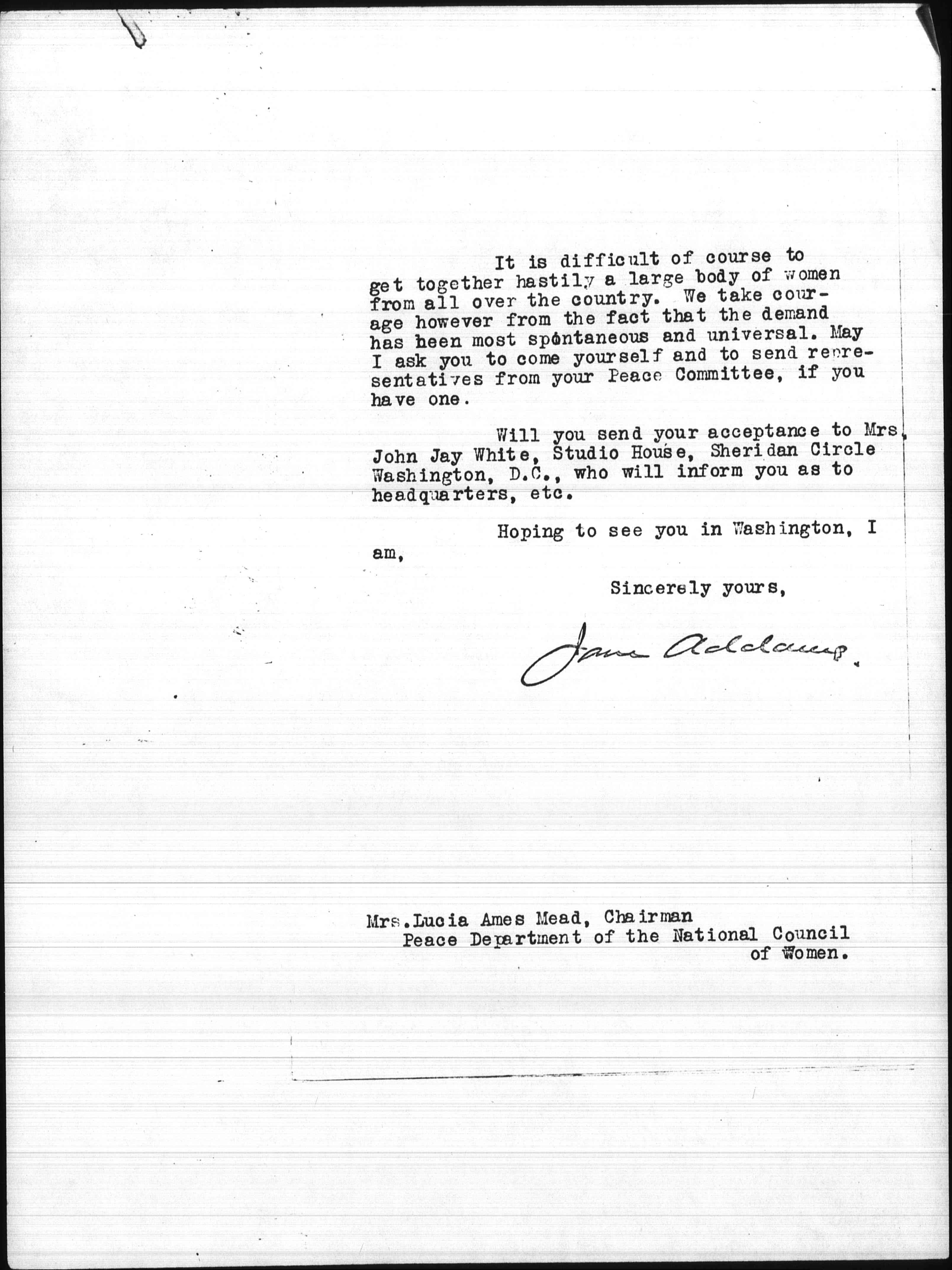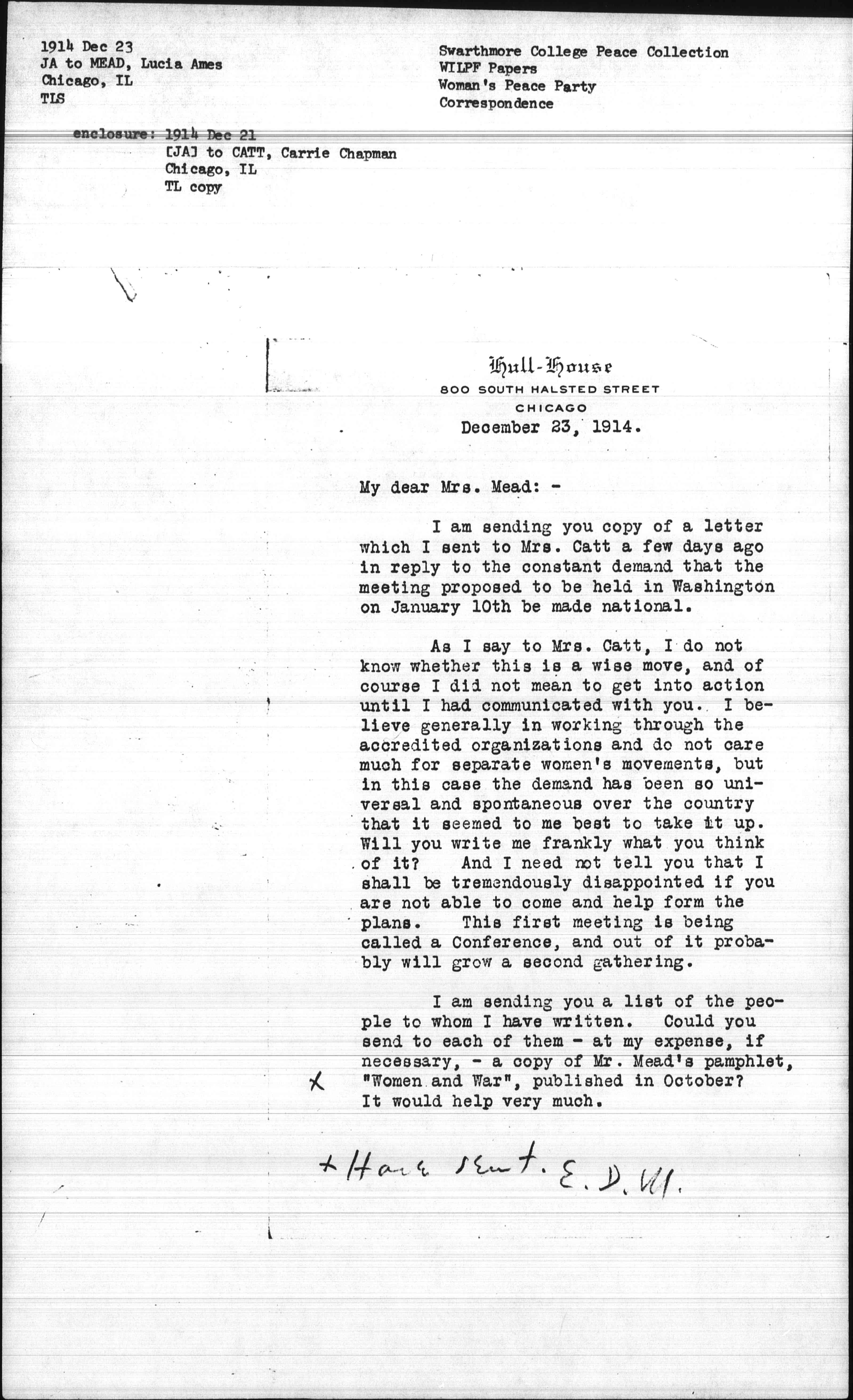 I am sending you a list of the people to whom I have written. Could you send to each of them -- at my expense, if necessary, -- a copy of Mr. Mead's pamphlet, "Women and War", published in October? It would help very much. [page 2]