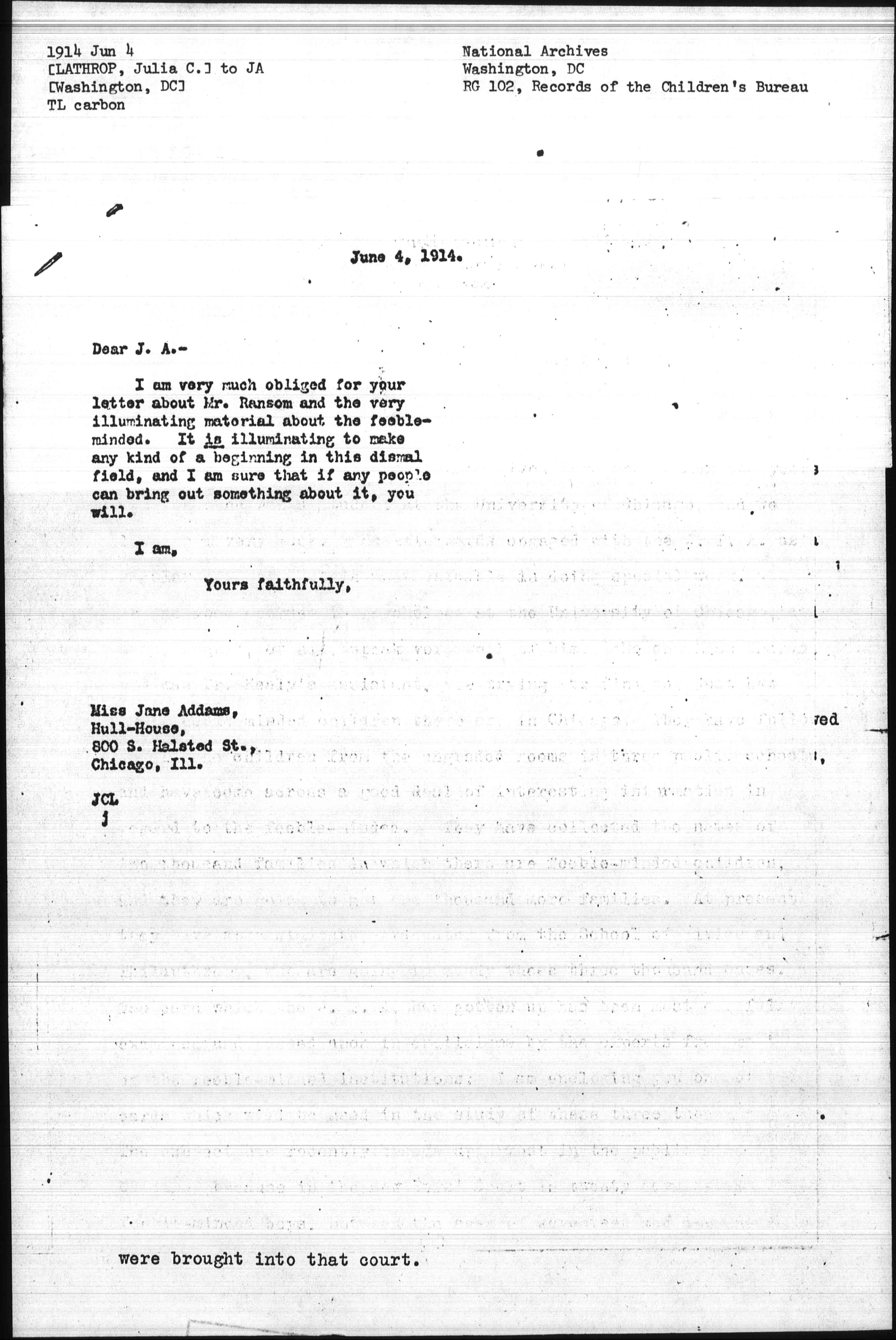 I am very much obliged for your letter about Mr. Ransom and the very illuminating material about the feeble-minded. It is illuminating to make any kind of a beginning in this dismal field, and I am sure that if any people can bring out something about it, you will.