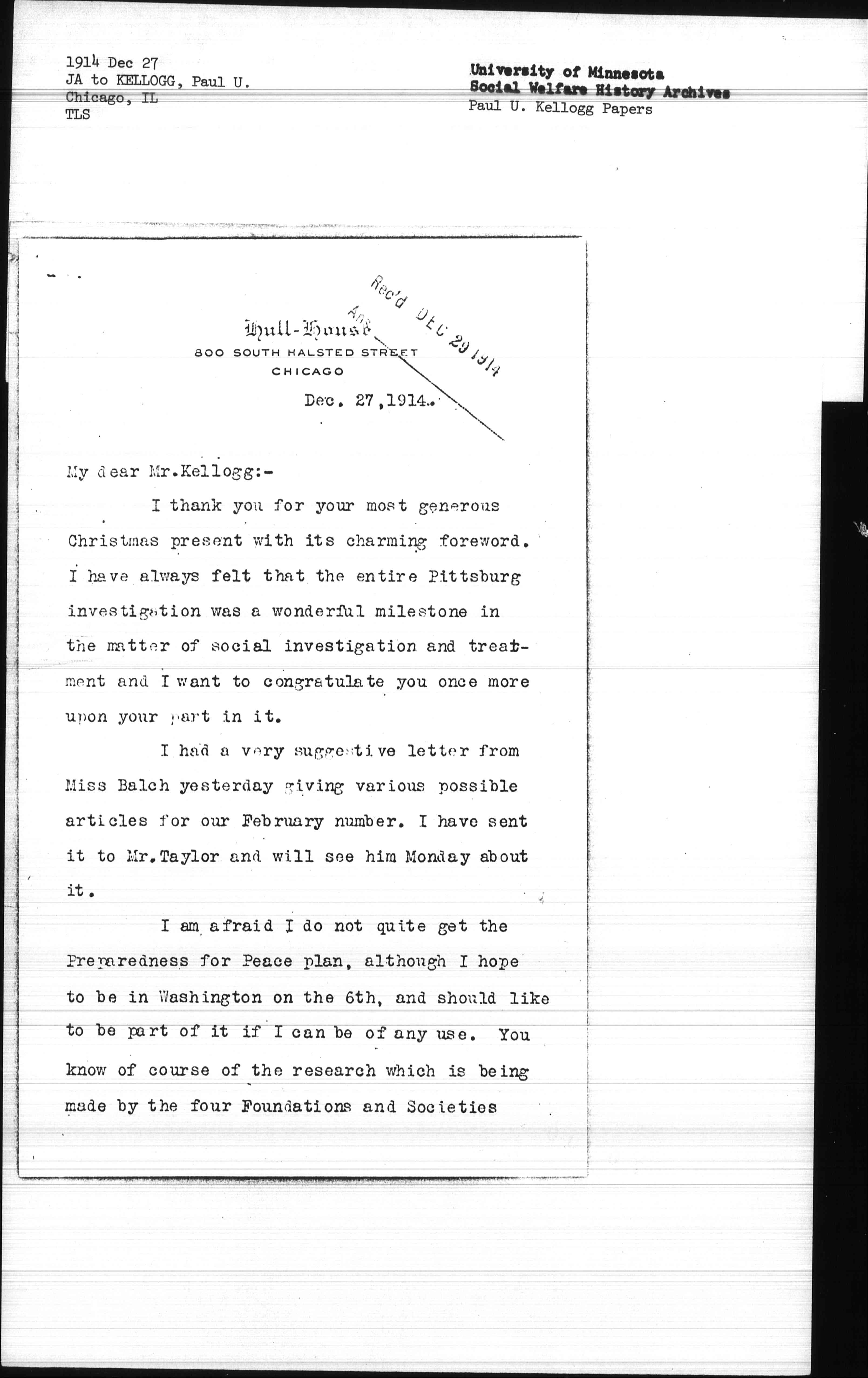 I thank you for your most generous Christmas present with its charming foreward. I have always felt that the entire [Pittsburgh] investigation was a wonderful milestone in the matter of social investigation and treatment and I want to congratulate you once more upon your part in it.
