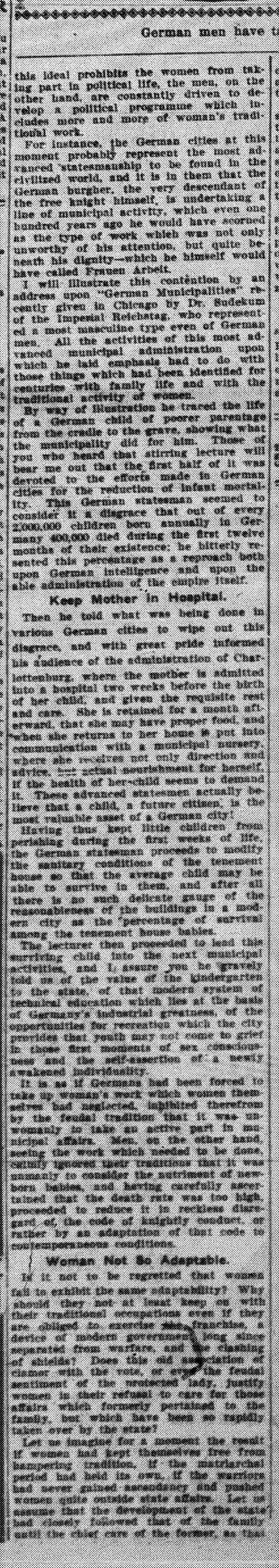 I will illustrate this contention by an address upon "German Municipalities" recently given in Chicago by Dr. Südekum, of the Imperial Reichstag, who represented a most masculine type even of German men. All the activities of this most advanced municipal administration upon which he laid emphasis had to do with those things which have been identified for centuries with family life and with the traditional activity of women.