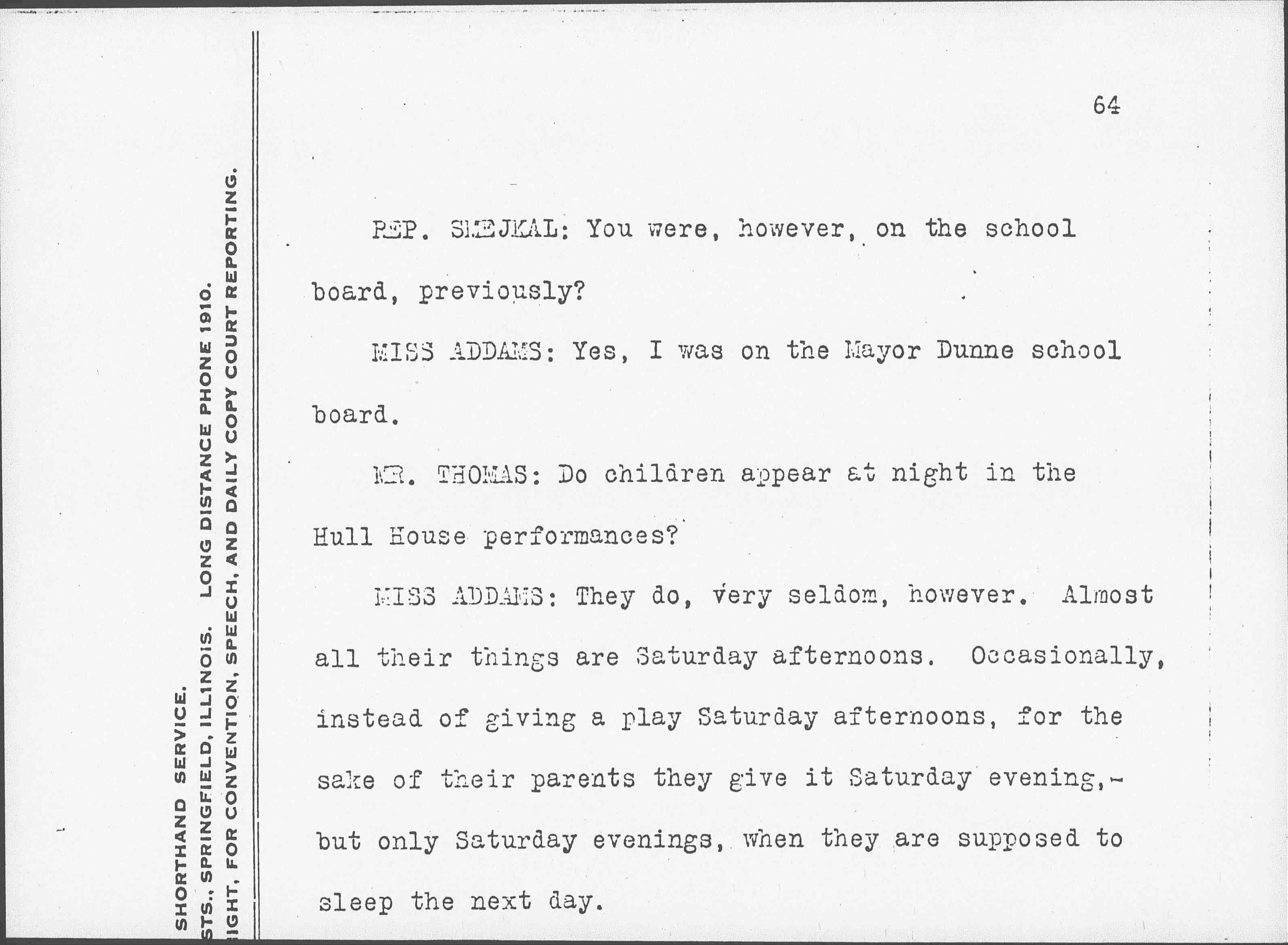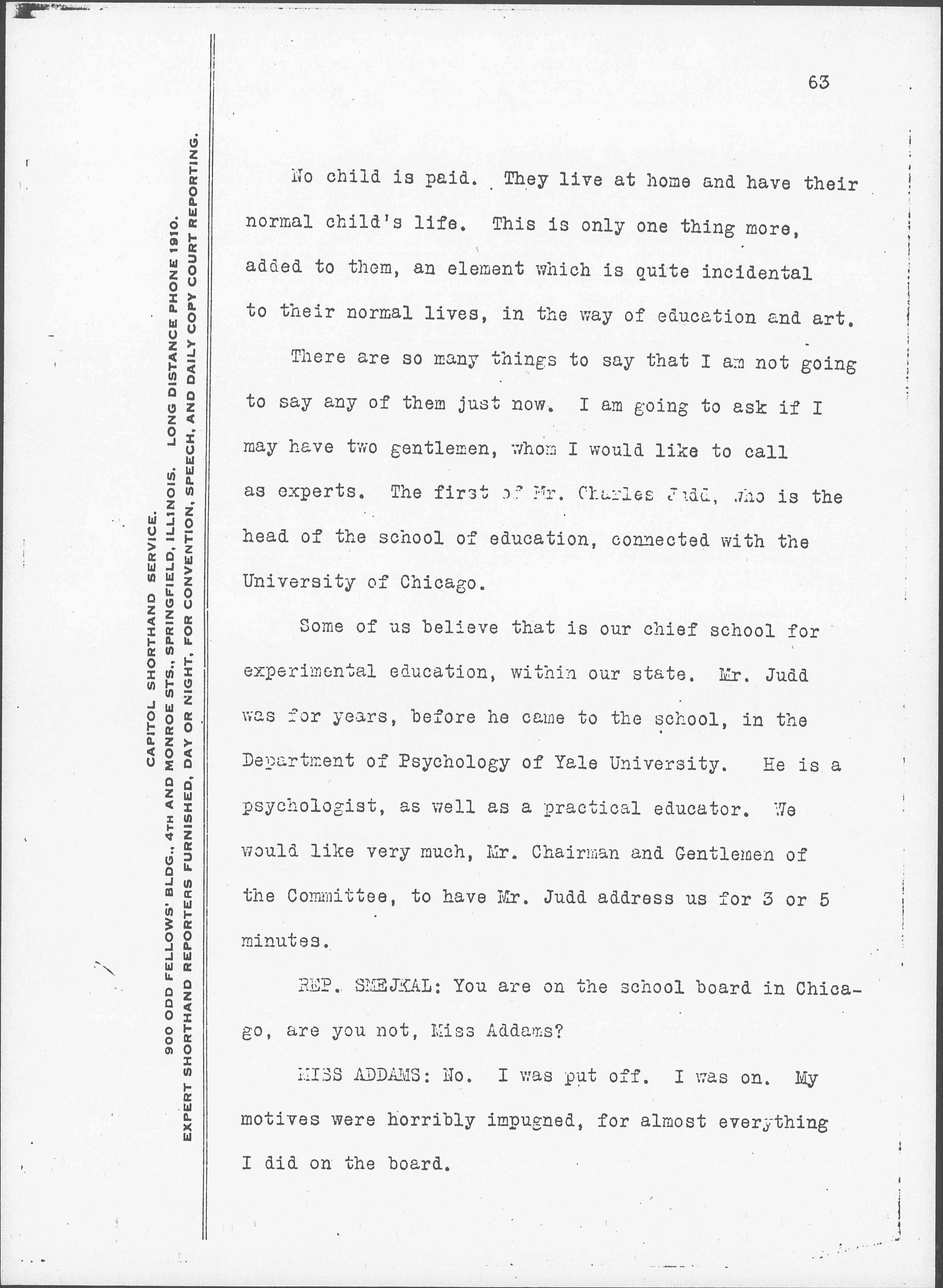 REP. SMEJKAL: You are on the school board in Chicago, are you not, Miss Addams?