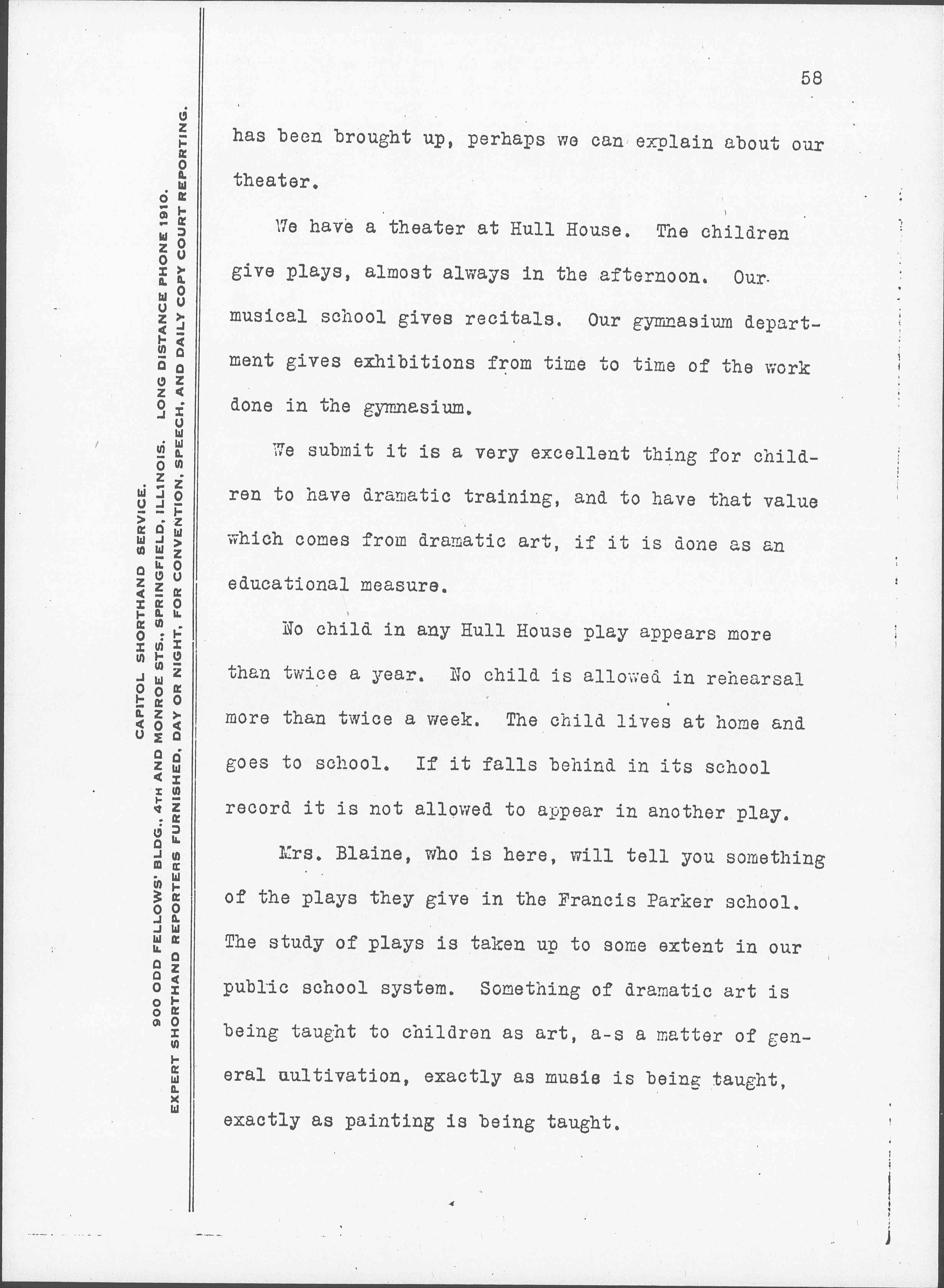 Mrs. Blaine, who is here, will tell you something of the plays they give in the Francis Parker school. The study of plays is taken up to some extent in our public school system. Something of dramatic art is being taught to children as art, as a matter of general cultivation, exactly as music is being taught, exactly as painting is being taught. [page 3]