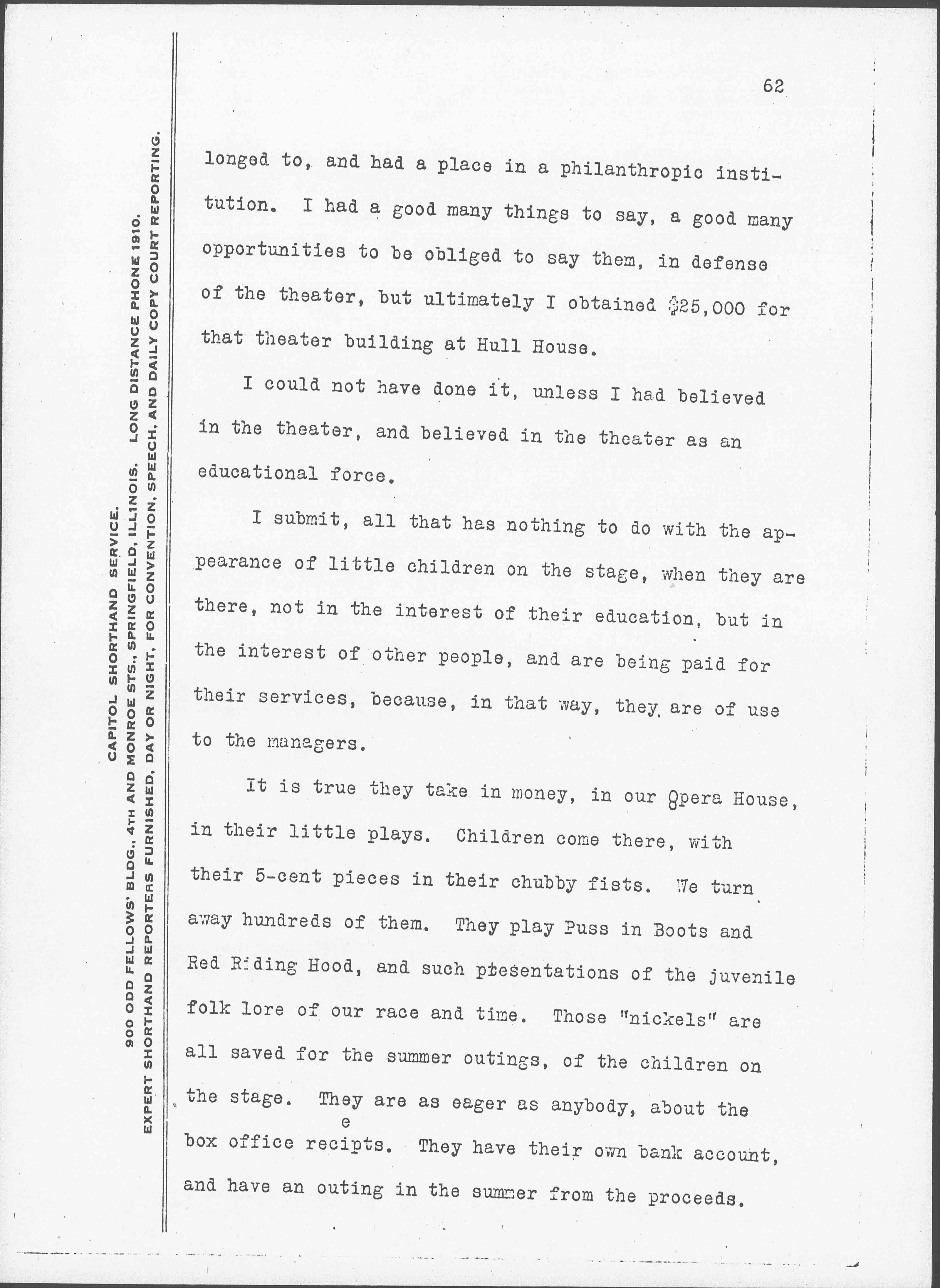 One of the first buildings we had at Hull house was a theater. It was no easy task to go around and endeavor to persuade the hard headed, -- not hard hearted -- business men of Chicago, that a theater belonged [page 6] to, and had a place in a philanthropic institution. I had a good many things to say, a good many opportunities to be obliged to say them, in defense of the theater, but ultimately I obtained $25,000 for that theater building at Hull House.