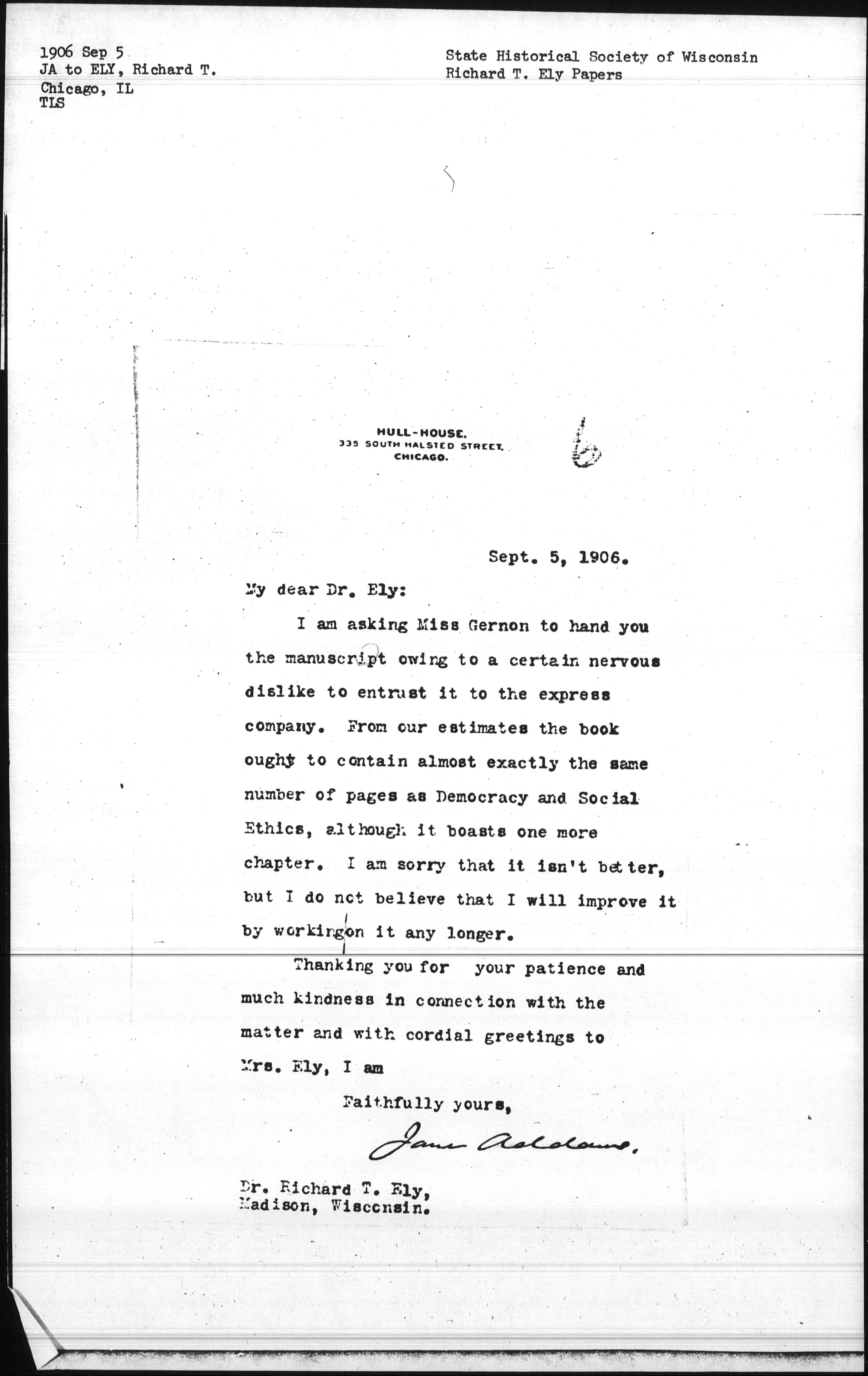 I am asking Miss Gernon to hand you the manuscript owing to a certain nervous dislike to entrust it to the express company. From our estimates the book ought to contain almost exactly the same number of pages as Democracy and Social Ethics, although it boasts one more chapter. I am sorry that it isn't better, but I do not believe that I will improve it by working on it any longer.