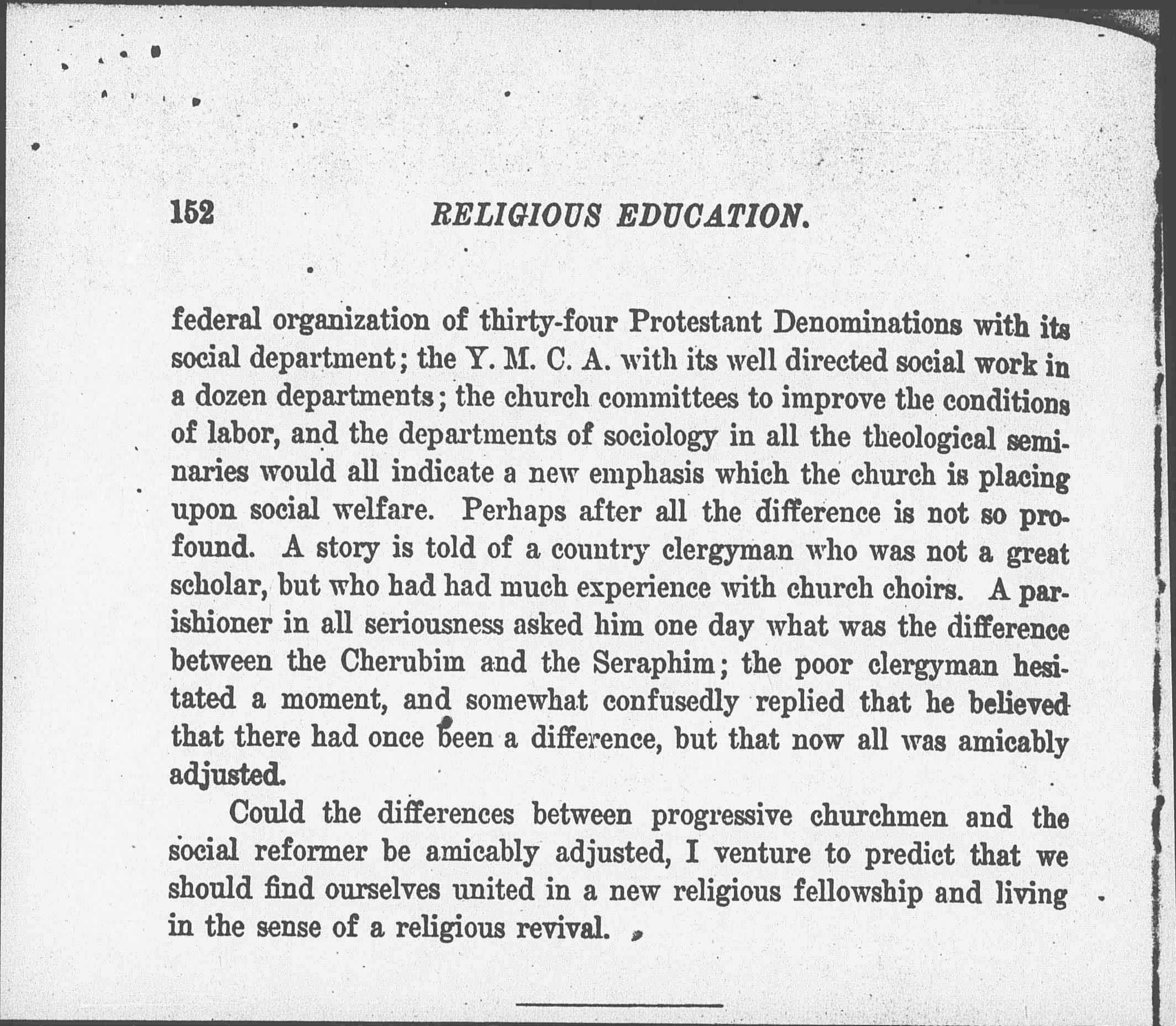 No one in considering this subject could for a moment ignore the great social awakening at present going forward in the churches. The [page 8] federal organization of thirty-four Protestant Denominations with its social department; the Y.M.C.A. with its well directed social work in a dozen departments; the church committees to improve the conditions of labor, and the departments of sociology in all the theological seminaries would all indicate a new emphasis which the church is placing upon social welfare. Perhaps after all the difference is not so profound. A story is told of a country clergyman who was not a great scholar, but who had had much experience with church choirs. A parishioner in all seriousness asked him one day what was the difference between the Cherubim and the Seraphim; the poor clergyman hesitated a moment, and somewhat confusedly replied that he believed that there had once been a difference, but that now all was amicably adjusted.