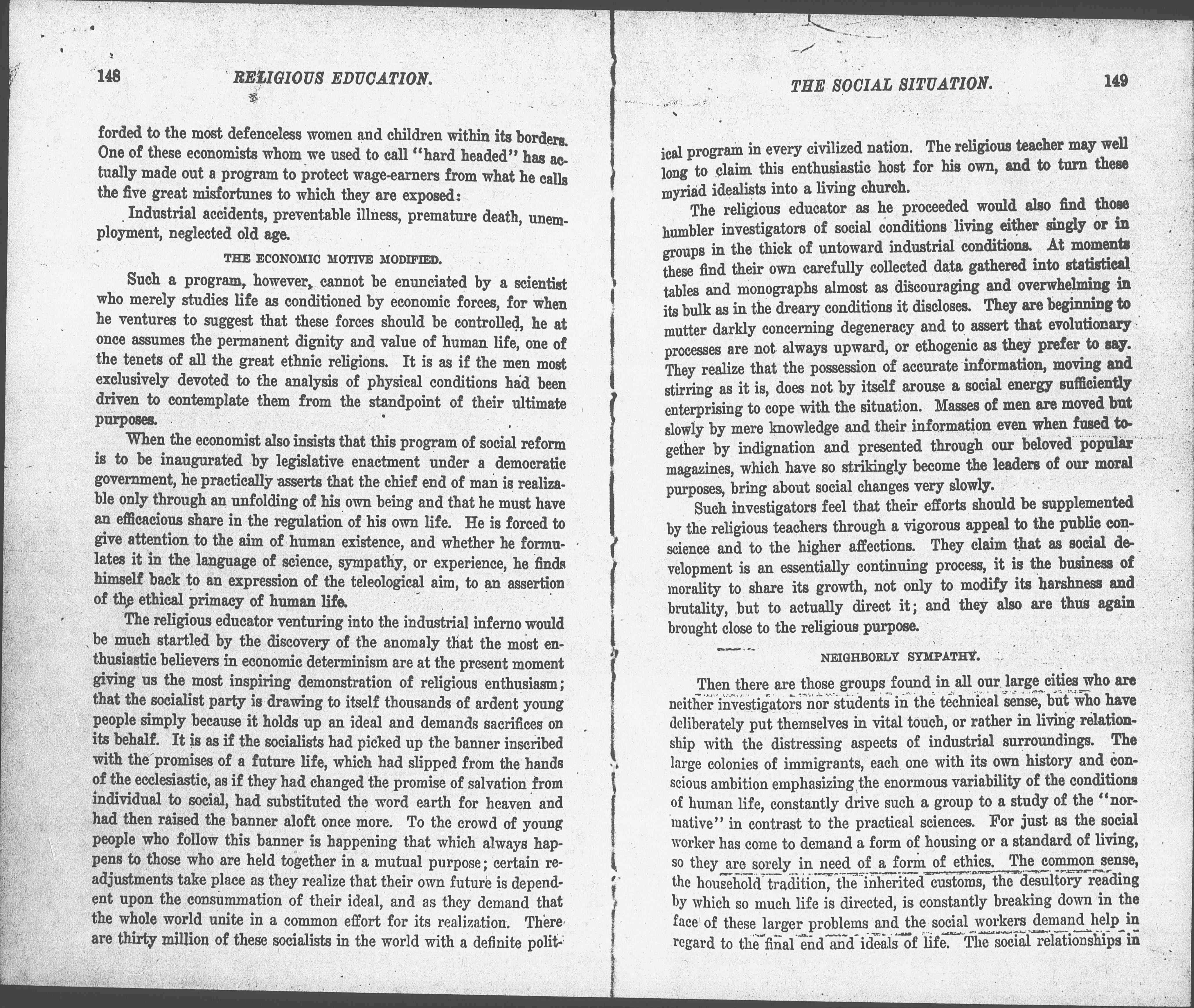 The religious educator venturing into the industrial inferno would be much startled by the discovery of the anomaly that the most enthusiastic believers in economic determinism are at the present moment giving us the most inspiring demonstration of religious enthusiasm; that the socialist party is drawing to itself thousands of ardent young people simply because it holds up an ideal and demands sacrifices on its behalf. It is as if the socialists had picked up the banner inscribed with the promises of a future life, which had slipped from the hands of the ecclesiastic, as if they had changed the promise of salvation from individual to social, had substituted the word earth for heaven and had then raised the banner aloft once more. To the crowd of young people who follow this banner is happening that which always happens to those who are held together in a mutual purpose; certain readjustments take place as they realize that their own future is dependent upon the consummation of their ideal, and as they demand that the whole world unite in a common effort for its realization. There are thirty million of these socialists in the world with a definite political [page 5] program in every civilized nation. The religious teacher may well long to claim this enthusiastic host for his own, and to turn these myriad idealists into a living church.