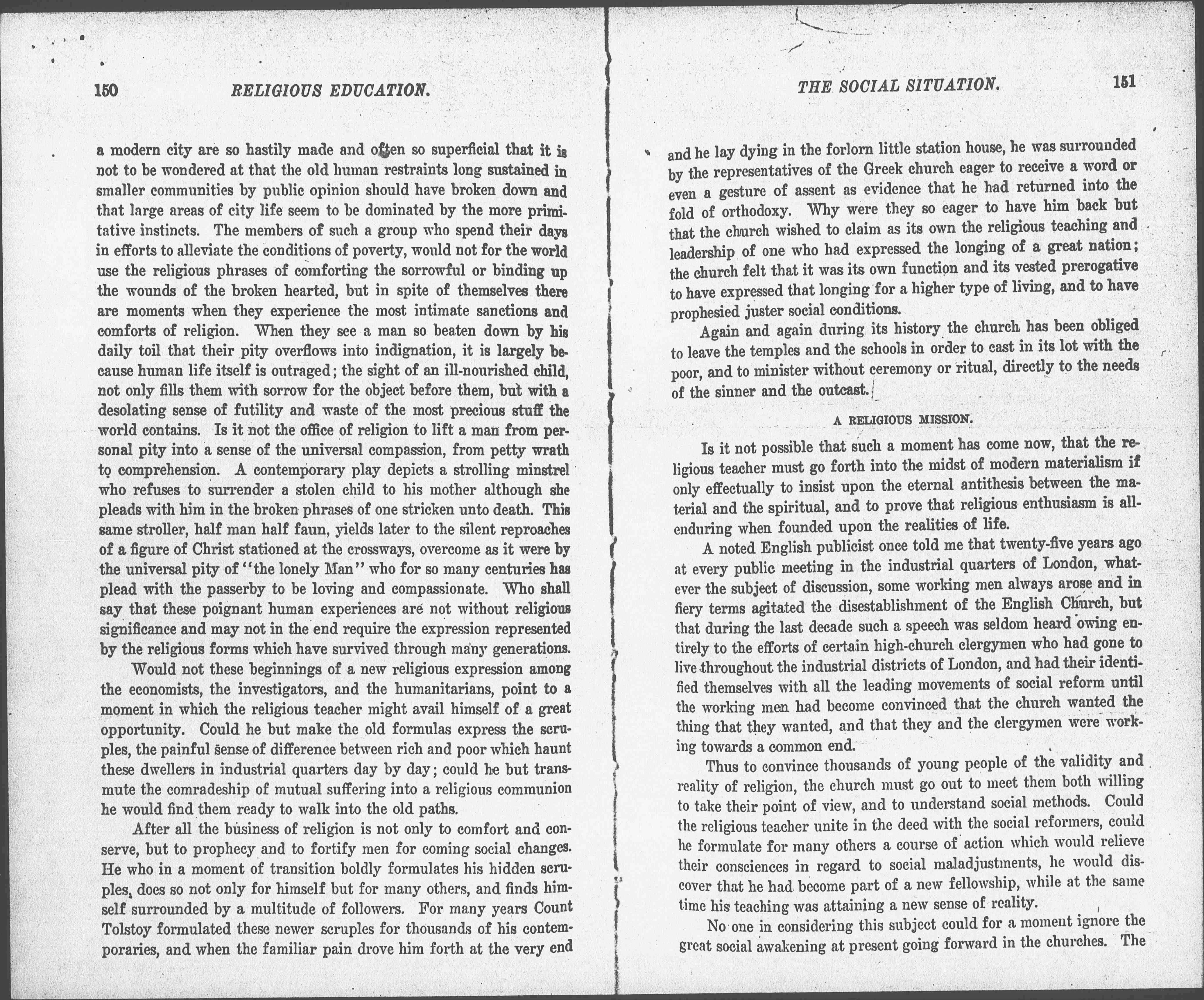 Then there are those groups found in all our large cities who are neither investigators nor students in the technical sense, but who have deliberately put themselves in vital touch, or rather in living relationship with the distressing aspects of industrial surroundings. The large colonies of immigrants, each one with its own history and conscious ambition emphasizing the enormous variability of the conditions of human life, constantly drive such a group to a study of the "normative" in contrast to the practical sciences. For just as the social worker has come to demand a form of housing or a standard of living, so they are sorely in need of a form of ethics. The common sense, the household tradition, the inherited customs, the desultory reading by which so much life is directed, is constantly breaking down in the face of those larger problems and the social workers demand help in regard to the final end and ideals of life. The social relationships in [page 6] a modern city are so hastily made and often so superficial that it is not to be wondered at that the old human restraints long sustained in smaller communities by public opinion should have broken down and that large areas of city life seem to be dominated by the more [primitive] instincts. The members of such a group who spend their days in efforts to alleviate the conditions of poverty, would not for the world use the religious phrases of comforting the sorrowful or binding up the wounds of the broken hearted, but in spite of themselves there are moments when they experience the most intimate sanctions and comforts of religion. When they see a man so beaten down by his daily toil that their pity overflows into indignation, it is largely because human life itself is outraged; the sight of an ill-nourished child, not only fills them with sorrow for the object before them, but with a desolating sense of futility and waste of the most precious stuff the world contains. Is it not the office of religion to lift a man from personal pity into a sense of the universal compassion, from petty wrath to comprehension. A contemporary play depicts a strolling minstrel who refuses to surrender a stolen child to his mother although she pleads with him in the broken phrases of one stricken unto death. This same stroller, half man half faun, yields later to the silent reproaches of a figure of Christ stationed at the crossways, overcome as it were by the universal pity of "the lonely Man" who for so many centuries has plead with these poignant human experiences are not without religious significance and may not in the end require the expression represented by the religious forms which have survived through many generations.