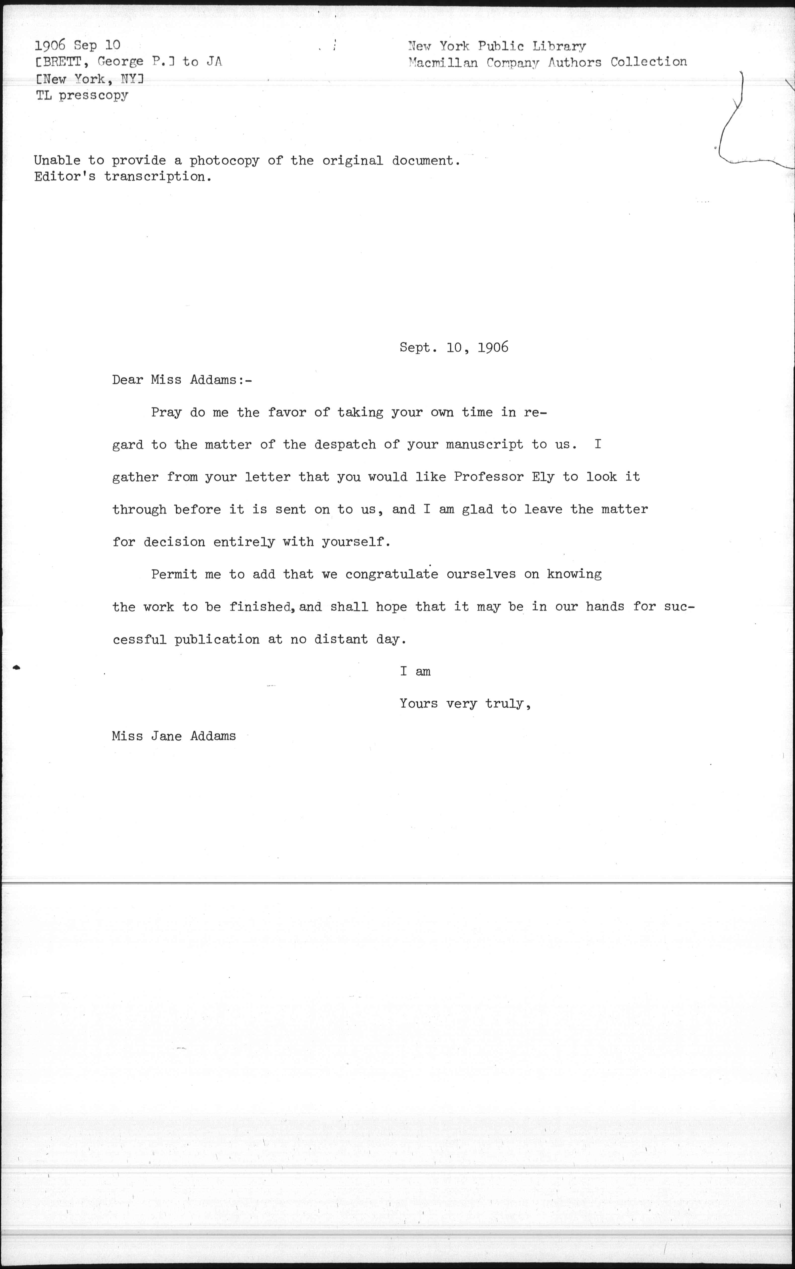 Pray do me the favor of taking your own time in regard to the matter of the dispatch of your manuscript to us. I gather from your letter that you would like Professor Ely to look it through before it is sent on to us, and I am glad to leave the matter for decision entirely with yourself.