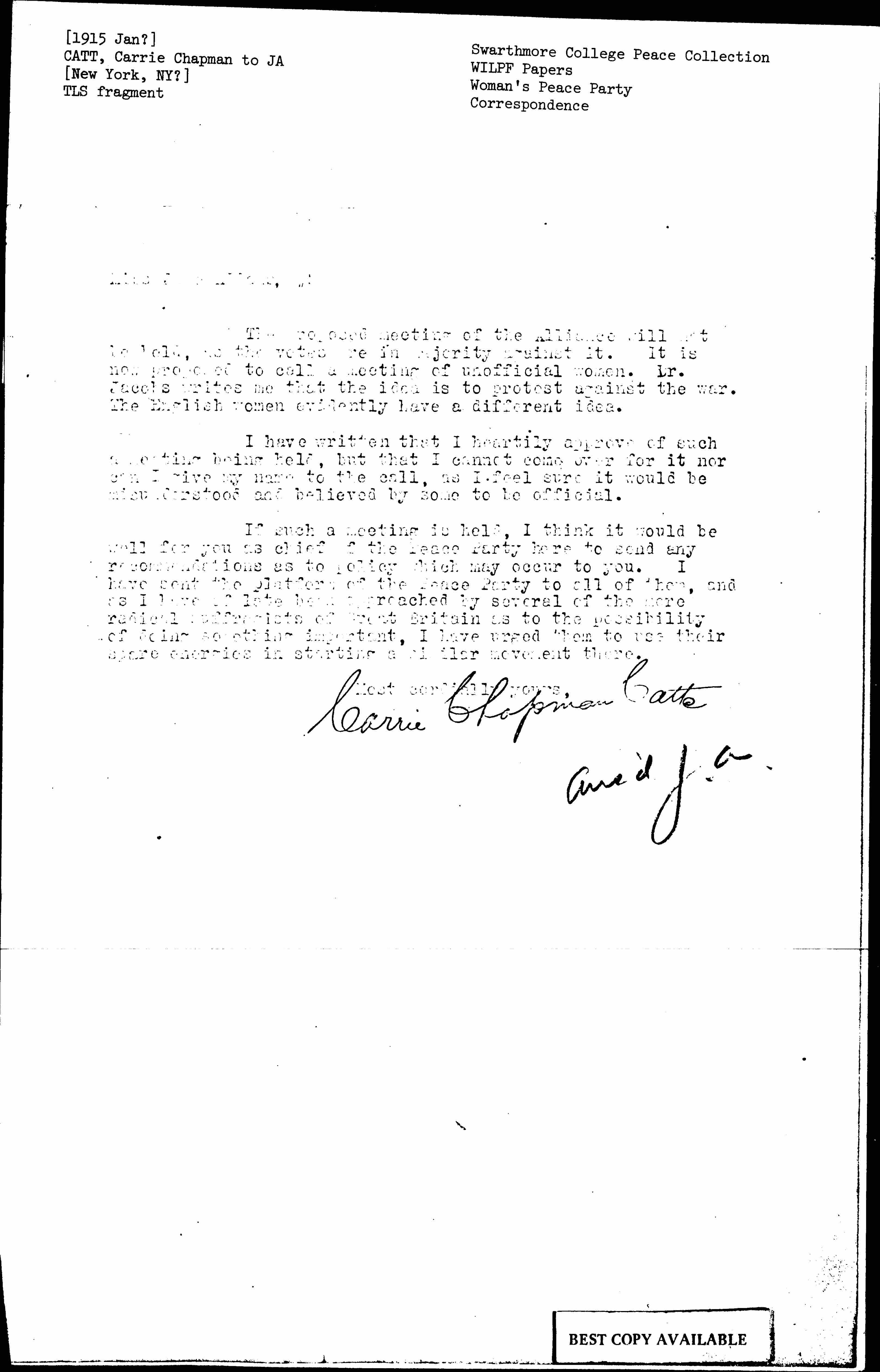 If such a meeting is held, I think it would be well for you as chief of the Peace Party here to send any recommendations as to policy which may occur to you. I have sent the platform of the Peace Party to all of them, and as I have of late been approached by several of the more radical suffragists of Great Britain as to the possibility of doing something important, I have urged them to use their spare energies in starting a similar movement there.