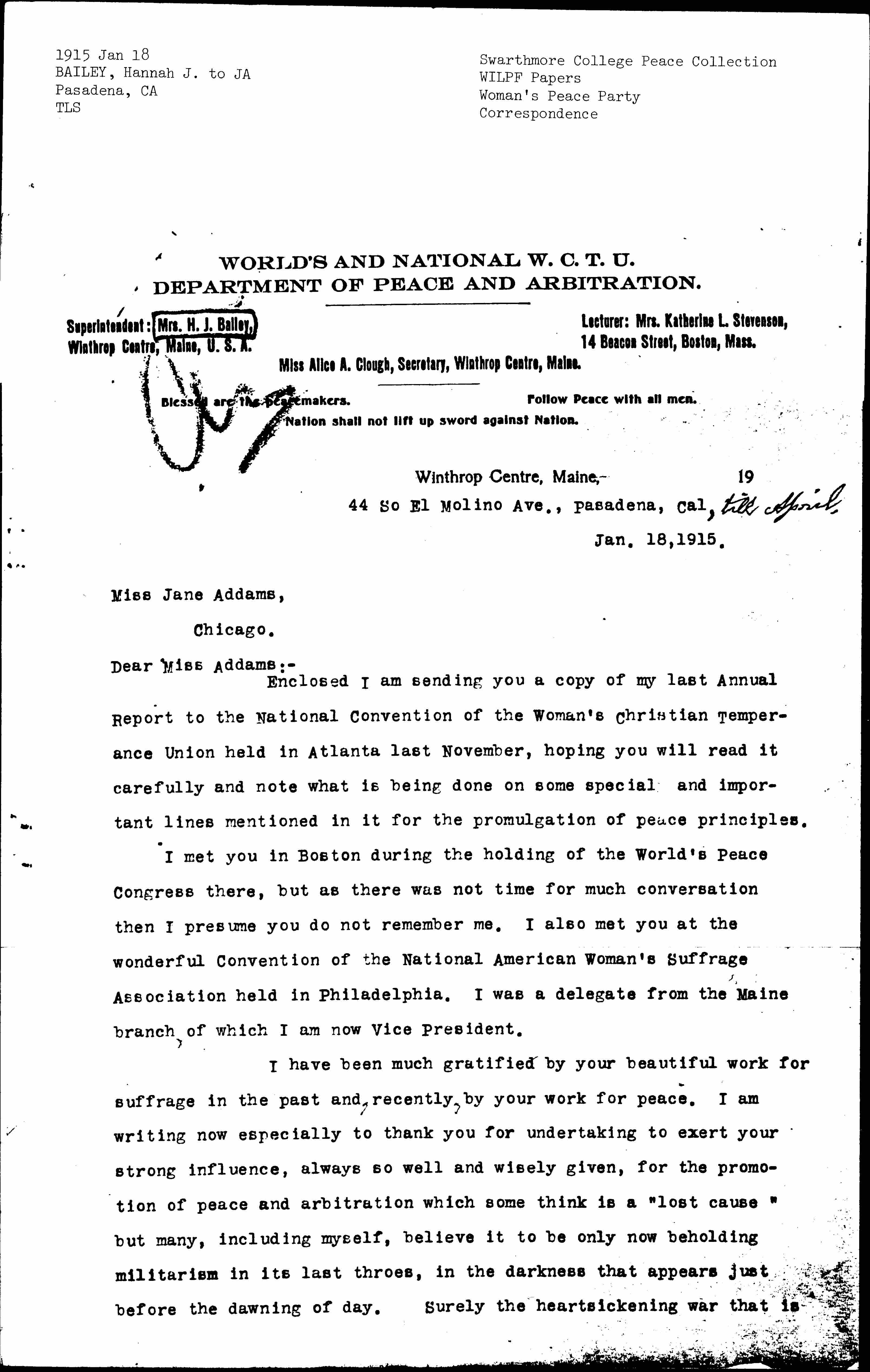 Enclosed I am sending you a copy of my last Annual Report to the National Convention of the Woman's Christian Temperance Union held in Atlanta last November, hoping you will read it carefully and note what is being done on some special and important lines mentioned in it for the promulgation of peace principles.