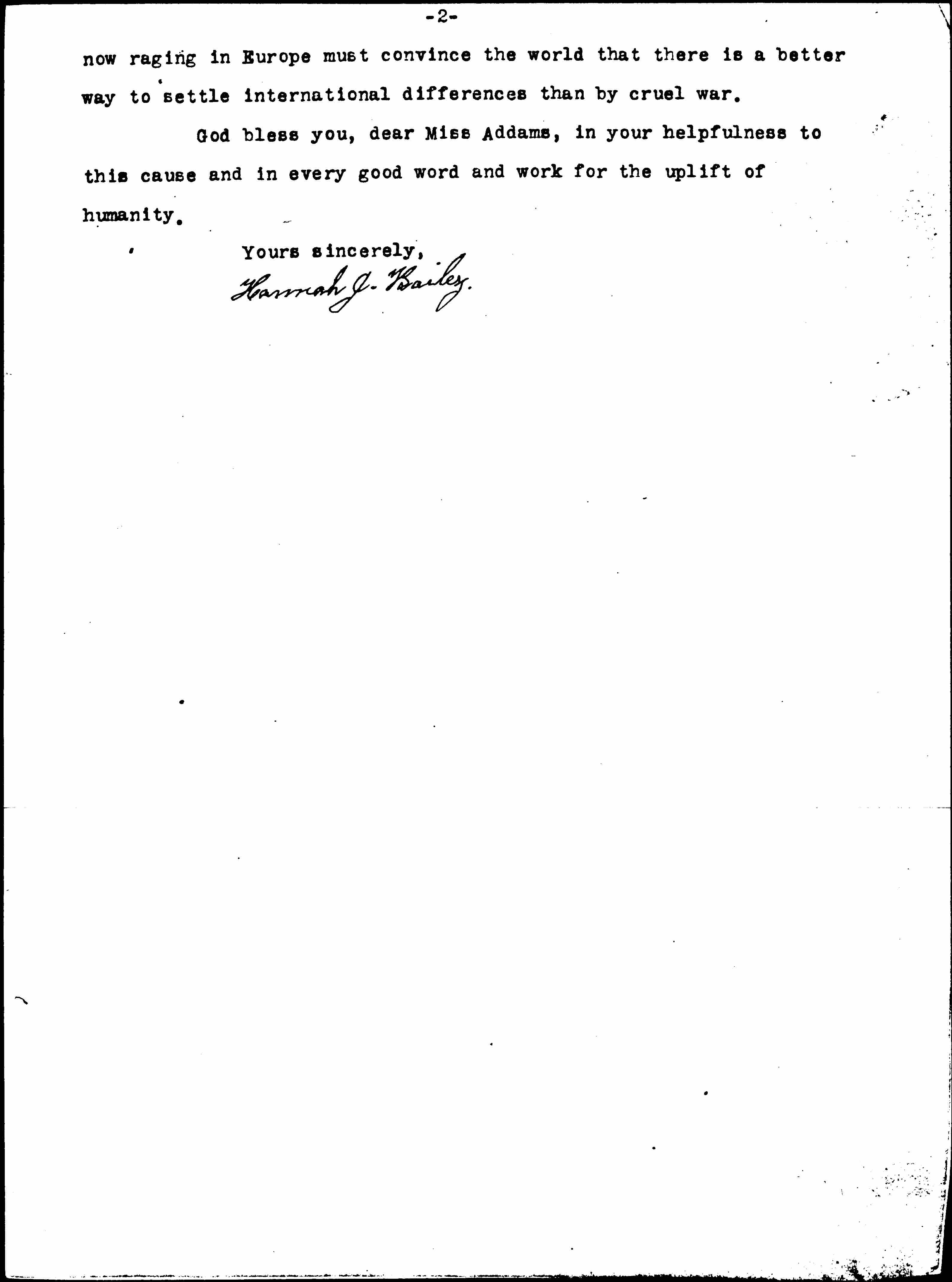 I have been much gratified by your beautiful work for suffrage in the past and, recently, by your work for peace. I am writing now especially to thank you for undertaking to exert your strong influence, always so well and wisely given, for the promotion of peace and arbitration which some think is a "lost cause" but many, including myself, believe it to be only now beholding militarism in its last throes, in the darkness that appears just before the dawning of day. Surely the heartsickening war that is [page 2] now raging in Europe must convince the world that there is a better way to settle international differences than by cruel war.