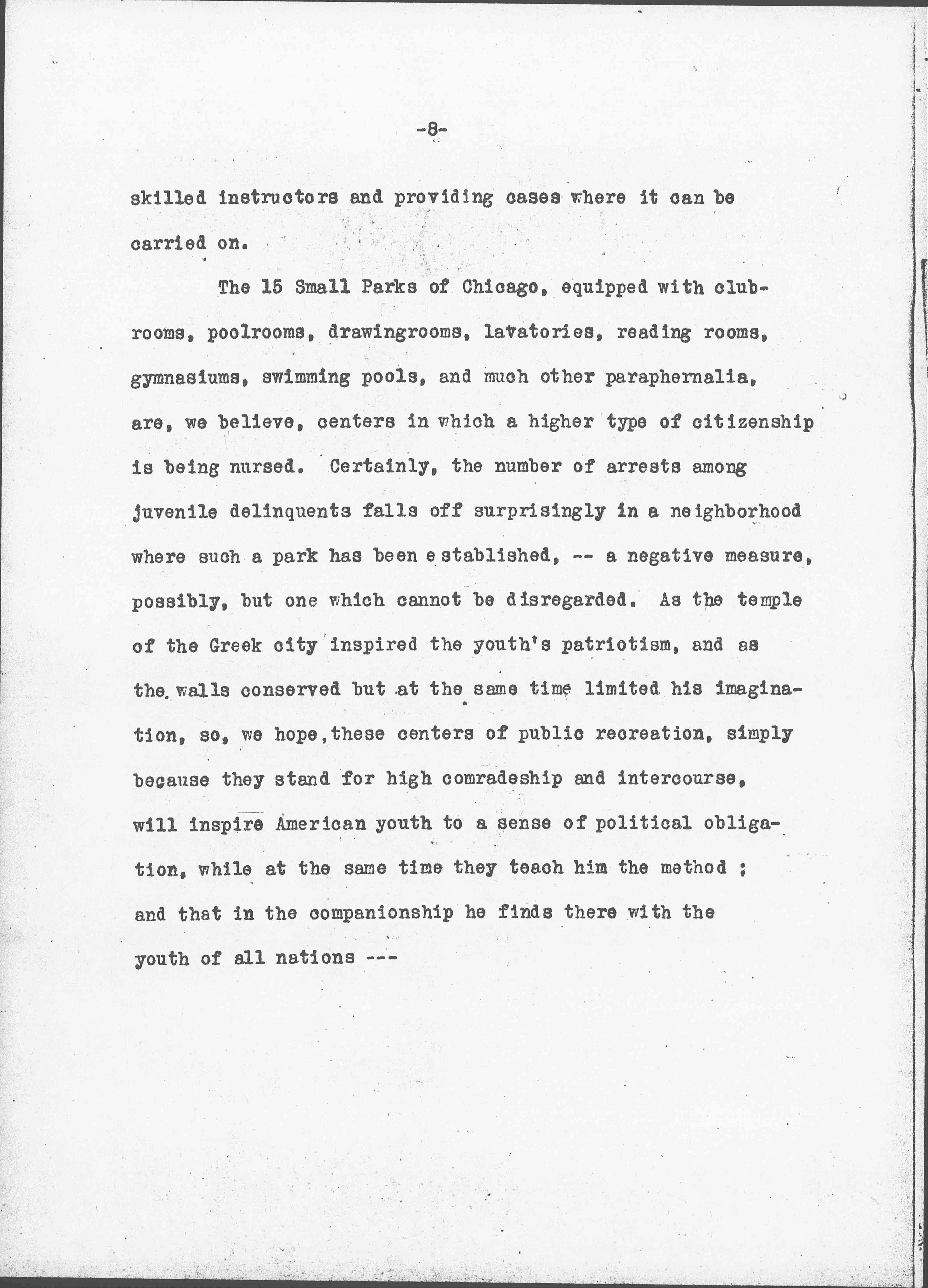 The 15 Small Parks of Chicago, equipped with clubrooms, poolrooms, [drawing rooms], lavatories, reading rooms, gymnasiums, swimming pools, and much other paraphernalia, are, we believe, centers in which a higher type of citizenship is being nursed. Certainly, the number of arrests among juvenile delinquents falls off surprisingly in a neighborhood where such a park has been established, -- a negative measure, possibly, but one which cannot be disregarded. As the temple of the Greek city inspired the youth's patriotism, and as the walls conserved but at the same time limited his imagination, so, we hope, these centers of public recreation, simply because they stand for high comradeship and intercourse, will inspire American youth to a sense of political obligation, while at the same time they teach him the method; and that in the companionship he finds there with the youth of all nations ---