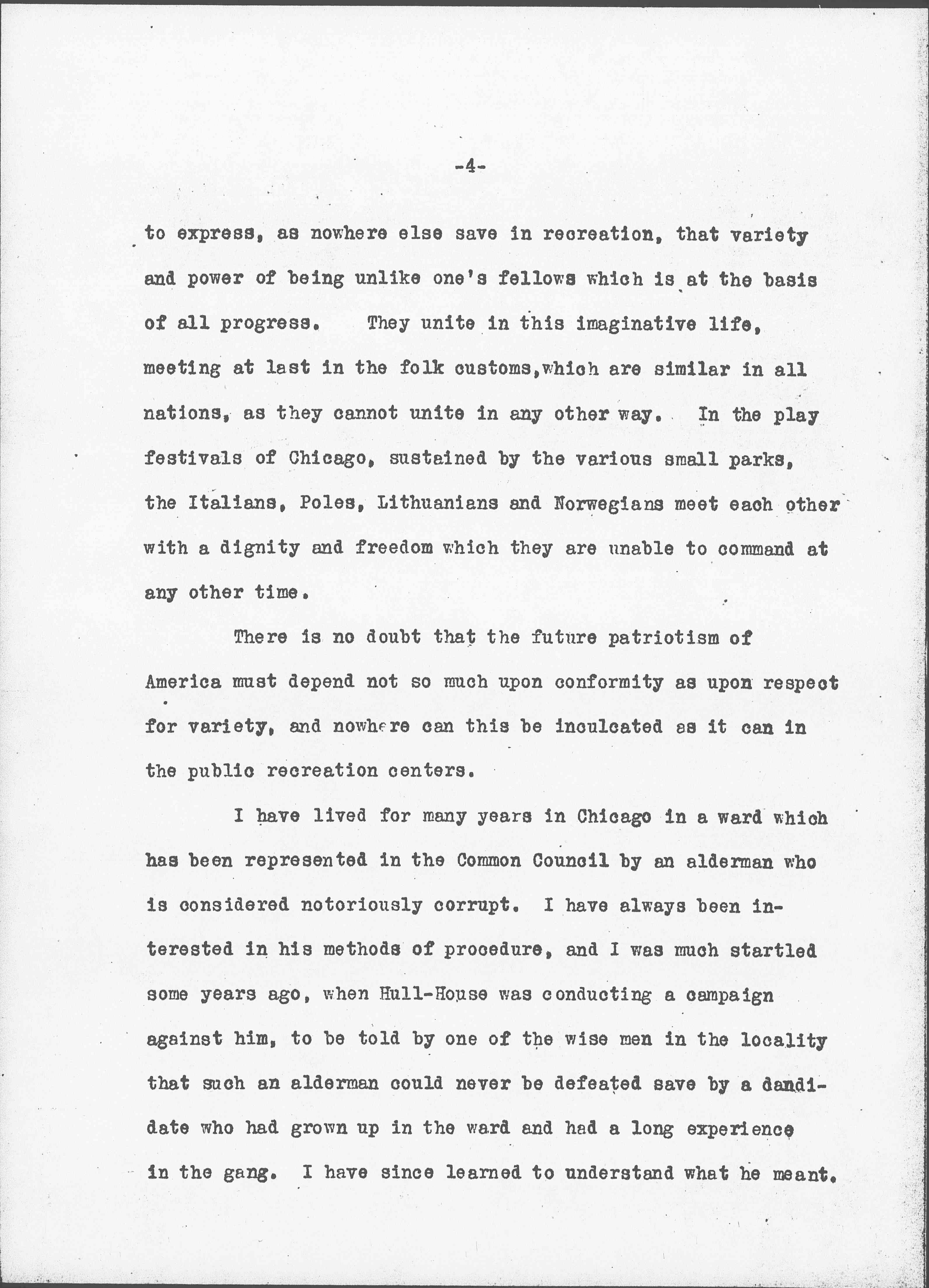 The scientists [tell] us that the imaginative powers, the variety and color of life, are realized most easily in moments of pleasure and recreation. Social intercourse must still be depended upon that men may be brought together into comradeship and may discover and respect this quality of difference. As the members of the various nations work together in factories every effort is made that they should conform to a common standard; as they walk upon the street they make painful exertion to approach a prevailing mode in dress. Only on the playground or in the recreation center do they find that variety is prized, that distinctive folklore and national customs are at a premium. They meet together and enjoy each other's national dances and costumes. As the sense of comradeship and pleasure grows, they are able [page 4] to express, as nowhere else save in recreation, that variety and power of being unlike one's fellows which is at the basis of all progress. They unite in this imaginative life, meeting at last in the folk costumes, which are similar in all nations, as they cannot unite in any other way. In the play festivals of Chicago, sustained by the various small parks, the Italians, Poles, Lithuanians and Norwegians meet each other with a dignity and freedom which they are unable to command at any other time.