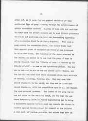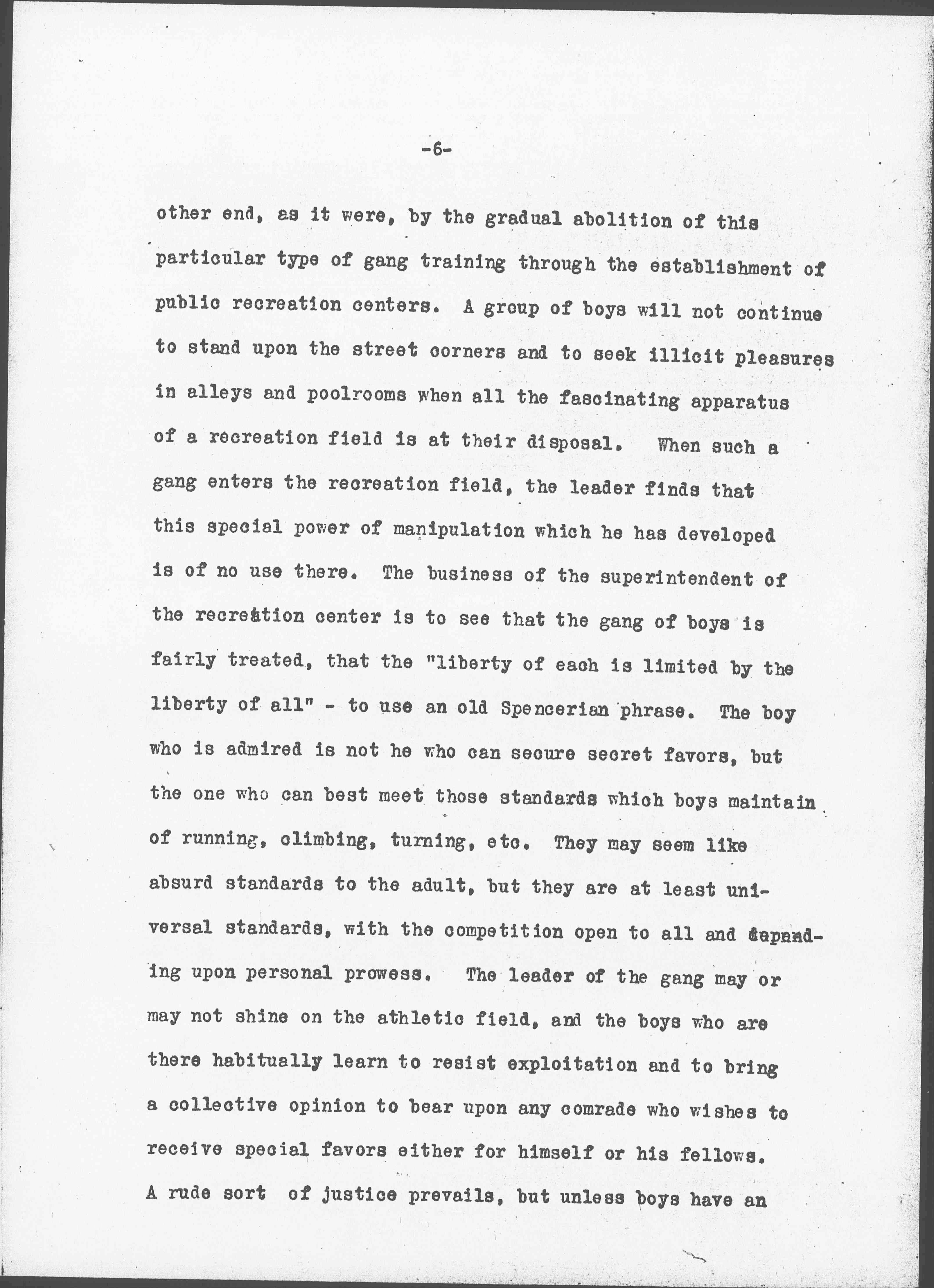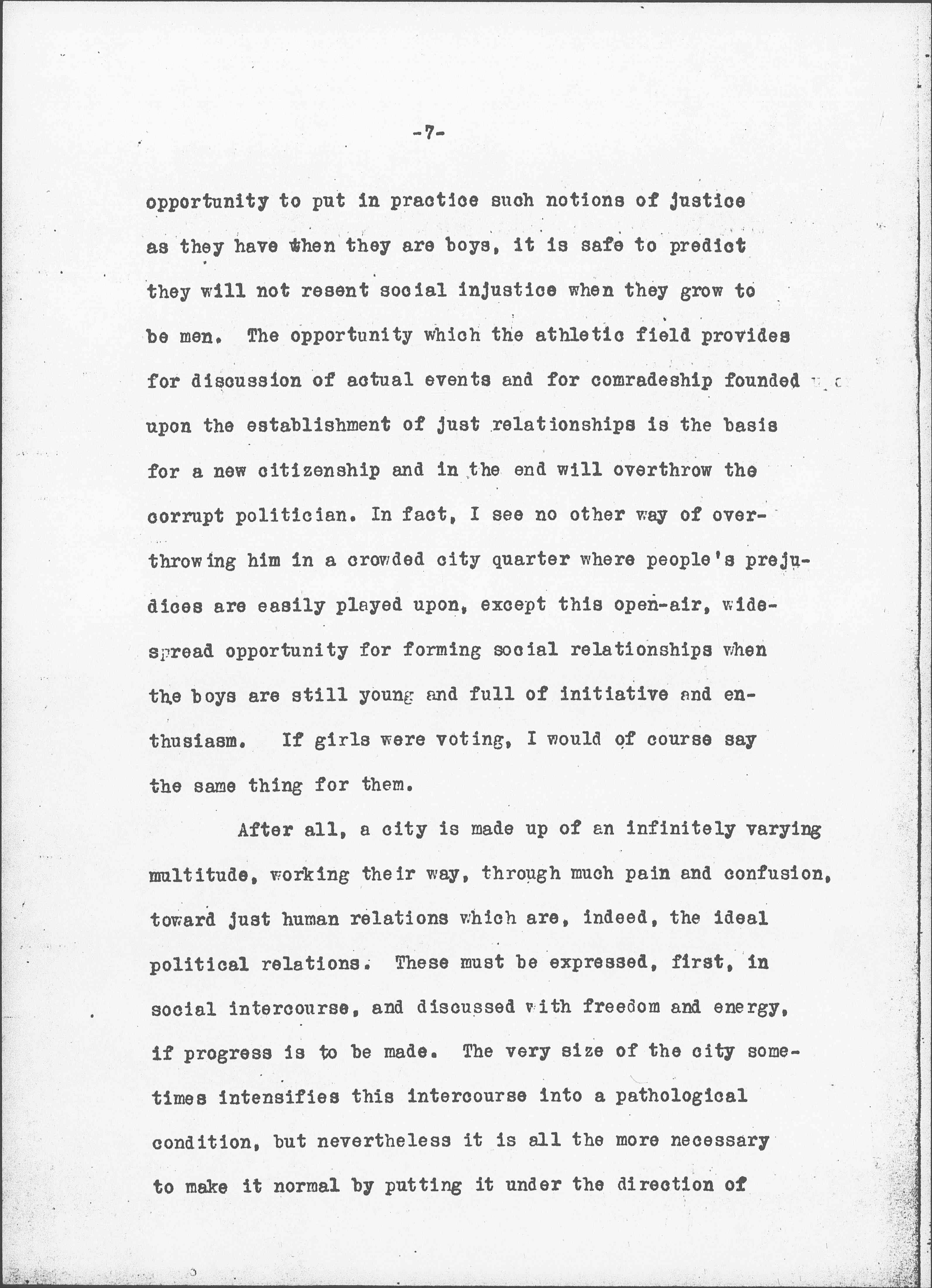 While the power of a politician of this type is being rapidly abridged by the establishment of civil service in cities as well as by the operations of the various official bureaus, to my mind it is being broken more rapidly from the [page 6] other end, as it were, by the gradual abolition of this particular type of gang training through the establishment of public recreation centers. A group of boys will not continue to stand upon the street corners and to seek illicit pleasures in alleys and poolrooms when all the fascinating apparatus of a recreation field is at their disposal. When such a gang enters the recreation field, the leader finds that this special power of manipulation which he has developed is of no use there. The business of the superintendent of the recreation center is to see that the gang of boys is fairly treated, that the "liberty of each is limited by the liberty of all" -- to use an old Spencerian phrase. The boy who is admired is not he who can secure secret favors, but the one who can best meet those standards which boys maintain of running, climbing, turning, etc. They may seem like absurd standards to the adult, but they are at least universal standards, with the competition open to all and depending upon personal prowess. The leader of the gang may or may not shine on the athletic field, and the boys who are there habitually learn to resist exploitation and to bring a collective opinion to bear upon any comrade who wishes to receive special favors either for himself or his fellows. A rude sort of justice prevails, but unless boys have an [page 7] opportunity to put in practice such notions of justice as they have when they are boys, it is safe to predict they will not resent social injustice when they grow to be men. The opportunity which the athletic field provides for discussion of actual events and for comradeship founded upon the establishment of just relationships is the basis for a new citizenship and in the end will overthrow the corrupt politician. In fact, I see no other way of overthrowing him in a crowded city quarter where people's prejudices are easily played upon, except this open-air, widespread opportunity for forming social relationships when the boys are still young and full of initiative and enthusiasm. If girls were voting, I would of course say the same thing for them.