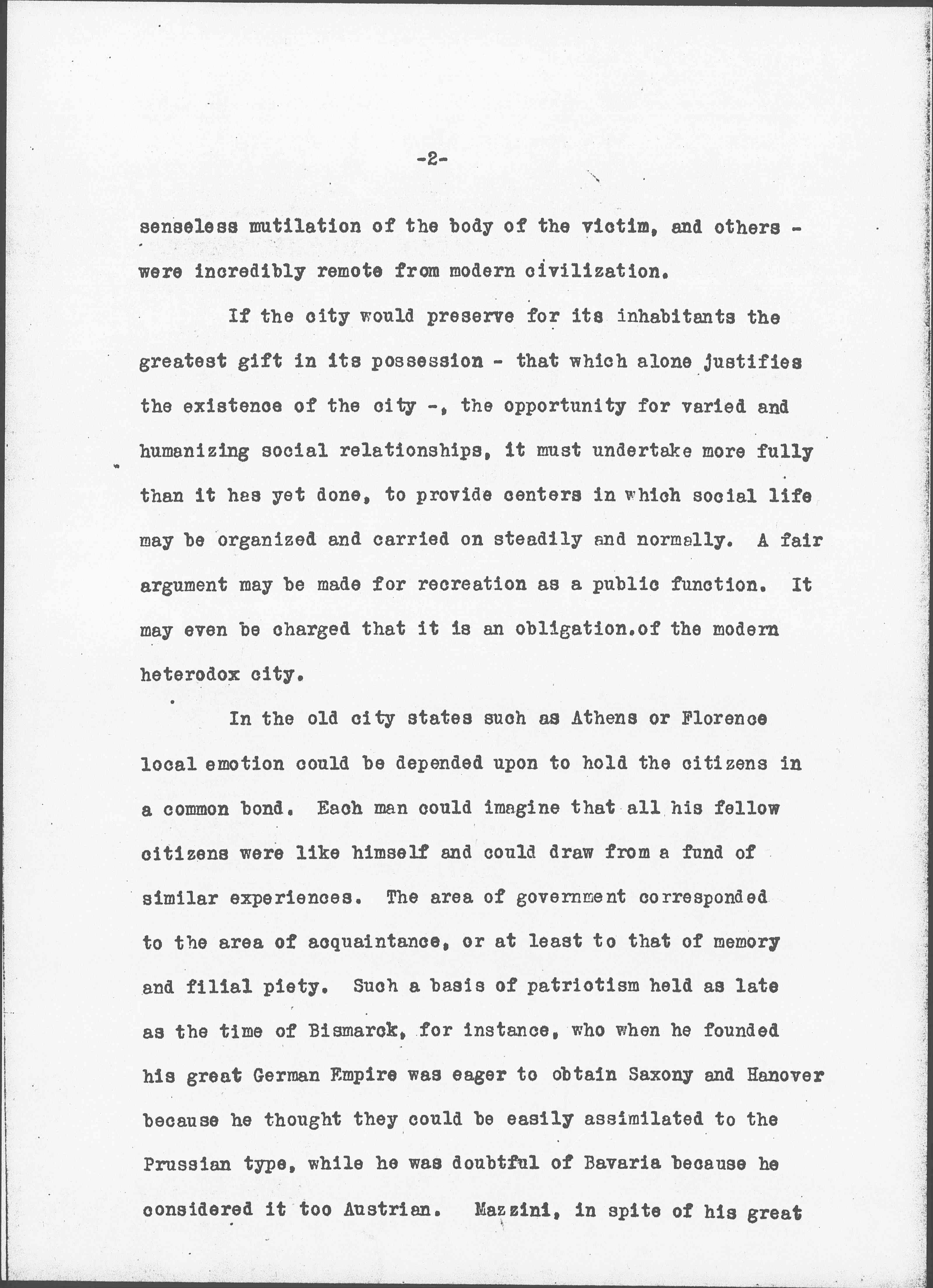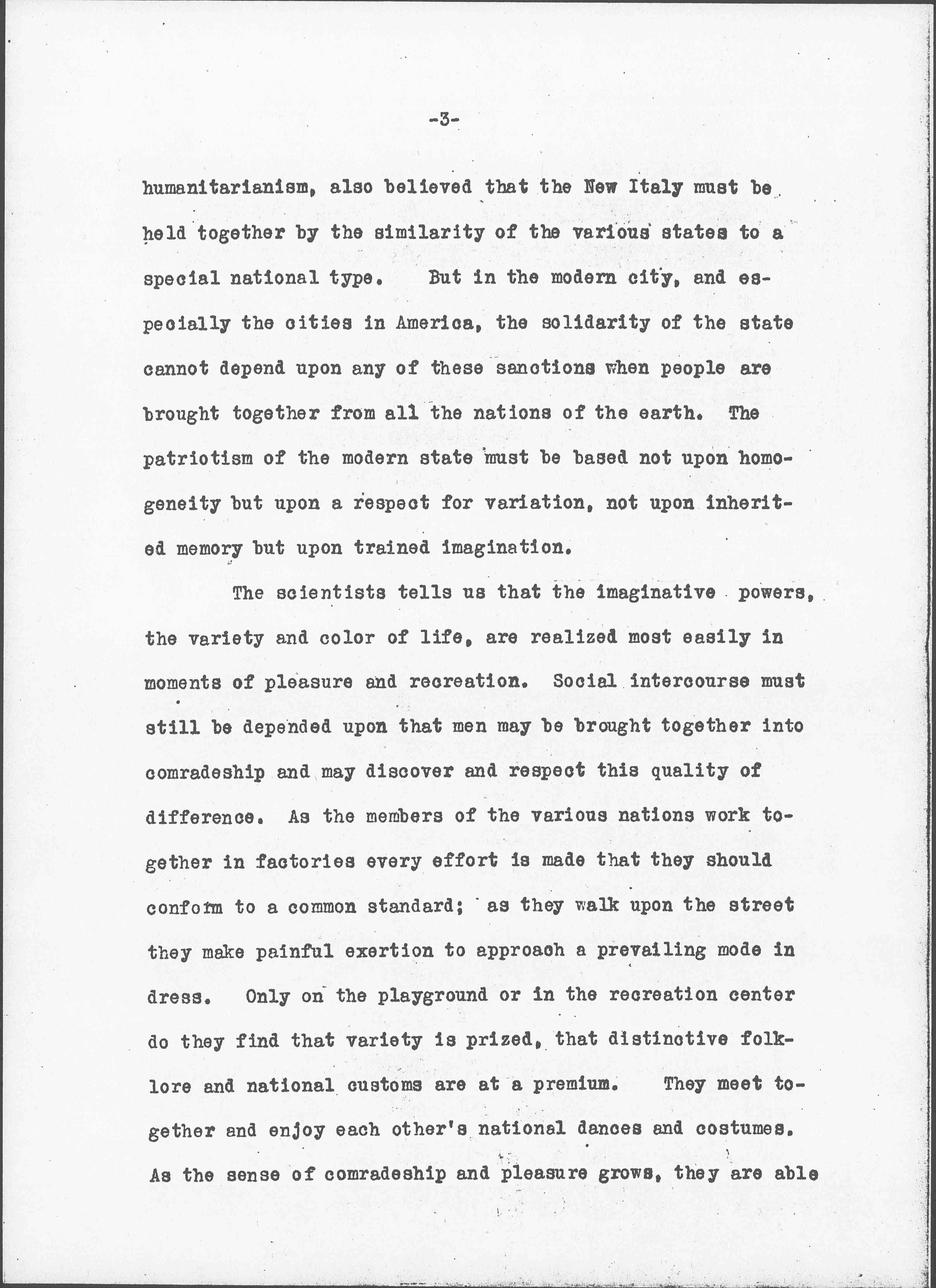 In the old city states such as Athens or Florence local emotion could be depended upon to hold the citizens in a common bond. Each man could imagine that all his fellow citizens were like himself and could draw from a fund of similar experiences. The area of government corresponded to the area of acquaintance, or at least to that of memory and filial piety. Such a basis of patriotism held as late as the time of Bismarck, for instance, who when he founded his great German Empire was eager to obtain Saxony and Hanover because he thought they could be easily assimilated to the Prussian type, while he was doubtful of Bavaria because he considered it too Austrian. Mazzini, in spite of his great [page 3] humanitarianism, also believed that the New Italy must be held together by the similarity of the various states to a special national type. But in the modern city, and especially the cities in America, the solidarity of the state cannot depend upon any of these sanctions when people are brought together from all the nations of the earth. The patriotism of the modern state must be based not upon homogeneity but upon a respect for variation, not upon inherited memory but upon trained imagination.