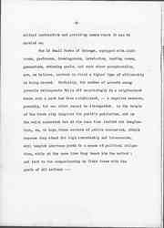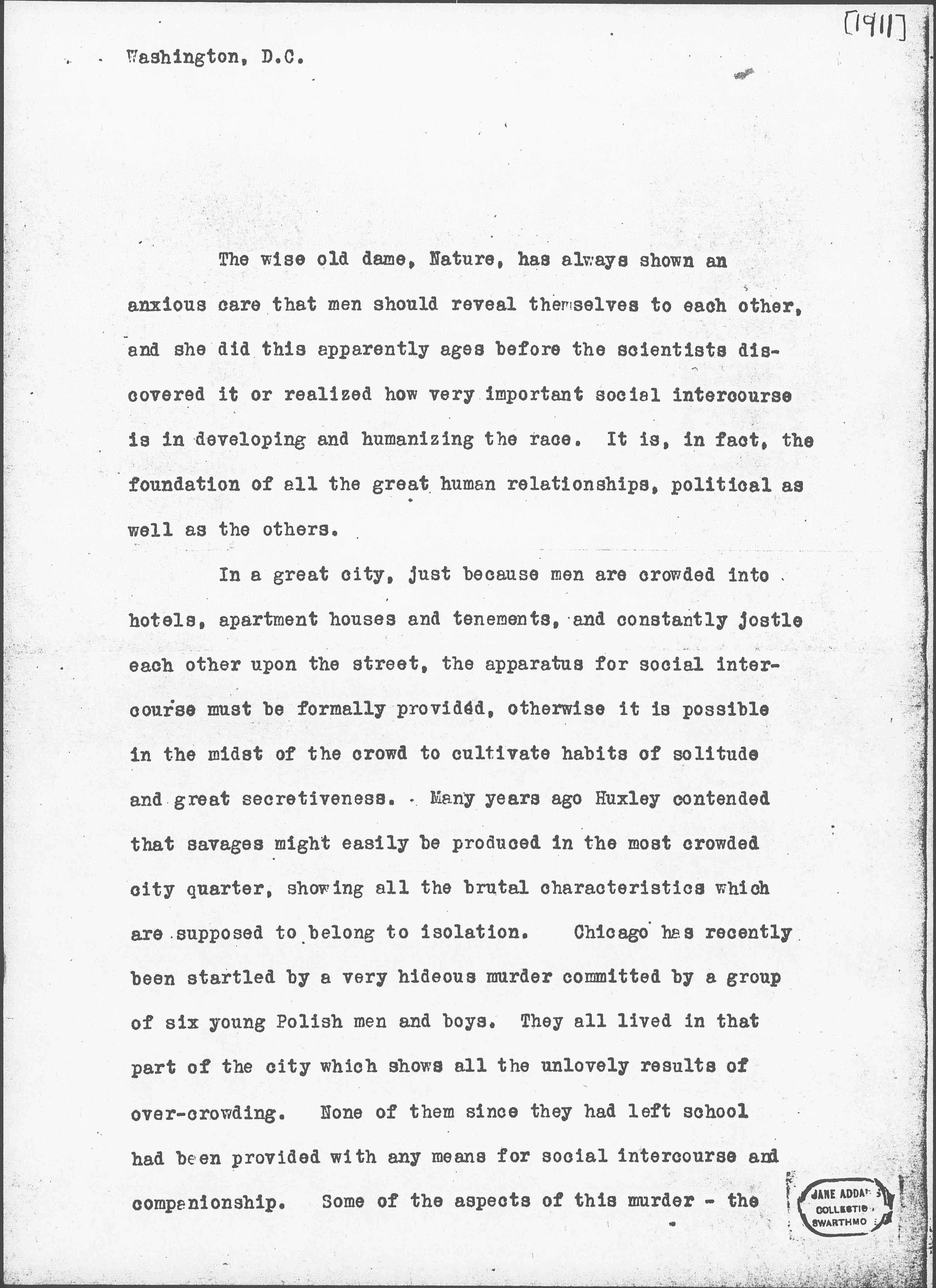 In a great city, just because men are crowded into hotels, apartment houses and tenements, and constantly jostle each other upon the street, the apparatus for social intercourse must be formally provided, otherwise it is possible in the midst of the crowd to cultivate habits of solitude and great secretiveness. Many years ago Huxley contended that savages might easily be produced in the most crowded city quarter, showing all the brutal characteristics which are supposed to belong to isolation. Chicago has recently been startled by a very hideous murder committed by a group of six young Polish men and boys. They all lived in that part of the city which shows all the unlovely results of over-crowding. None of them since they had left school has been provided with any means for social intercourse and companionship. Some of the aspects of this murder -- the [page 2] senseless mutilation of the body of the victim, and others -- were incredibly remote from modern civilization.