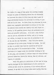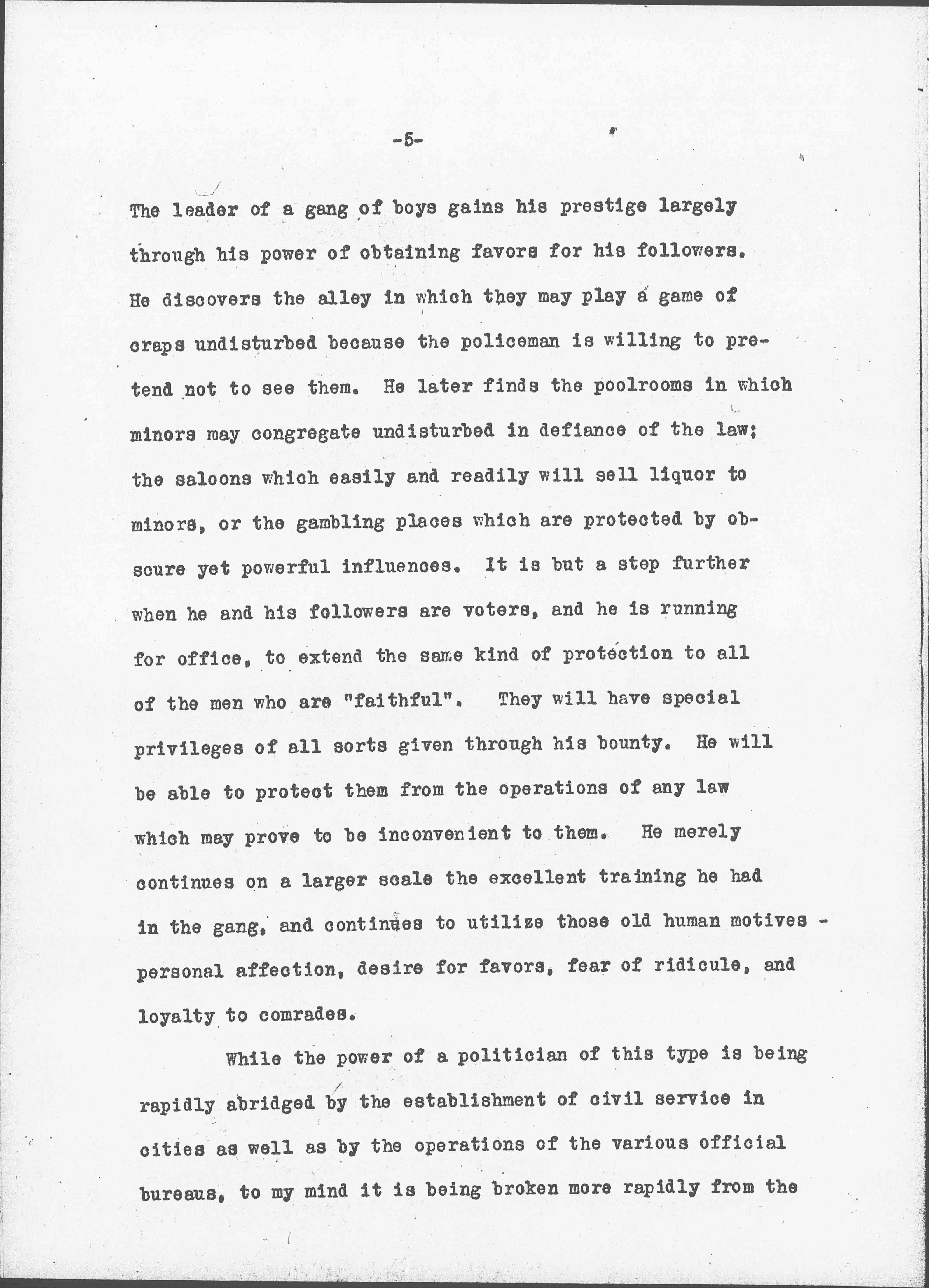 I have lived for many years in Chicago in a ward which has been represented in the Common Council by an alderman who is considered notoriously corrupt. I have always been interested in his methods of procedure, and I was much startled some years ago, when Hull-House was conducting a campaign against him, to be told by one of the wise men in the locality that such an alderman could never be defeated save by a candidate who had grown up in the ward and had a long experience in the gang. I have since learned to understand what he meant. [page 5] The leader of a gang of boys gains his prestige largely through his power of obtaining favors for his followers. He discovers the alley in which they may play a game of craps undisturbed because the policeman is willing to pretend not to see them. He later finds the poolrooms in which minors may congregate undisturbed in defiance of the law; the saloons which easily and readily will sell liquor to minors, or the gambling places which are protected by obscure yet powerful influences. It is but a step further when he and his followers are voters, and he is running for office, to extend the same kind of protection to all of the men who are "faithful". They will have special privileges of all sorts given through his bounty. He will be able to protect them from the operations of any law which may prove to be inconvenient to them. He merely continues on a larger scale the excellent training he had in the gang, and continues to utilize those old human motives -- personal affection, desire for favors, fear of ridicule, and loyalty to comrades.
