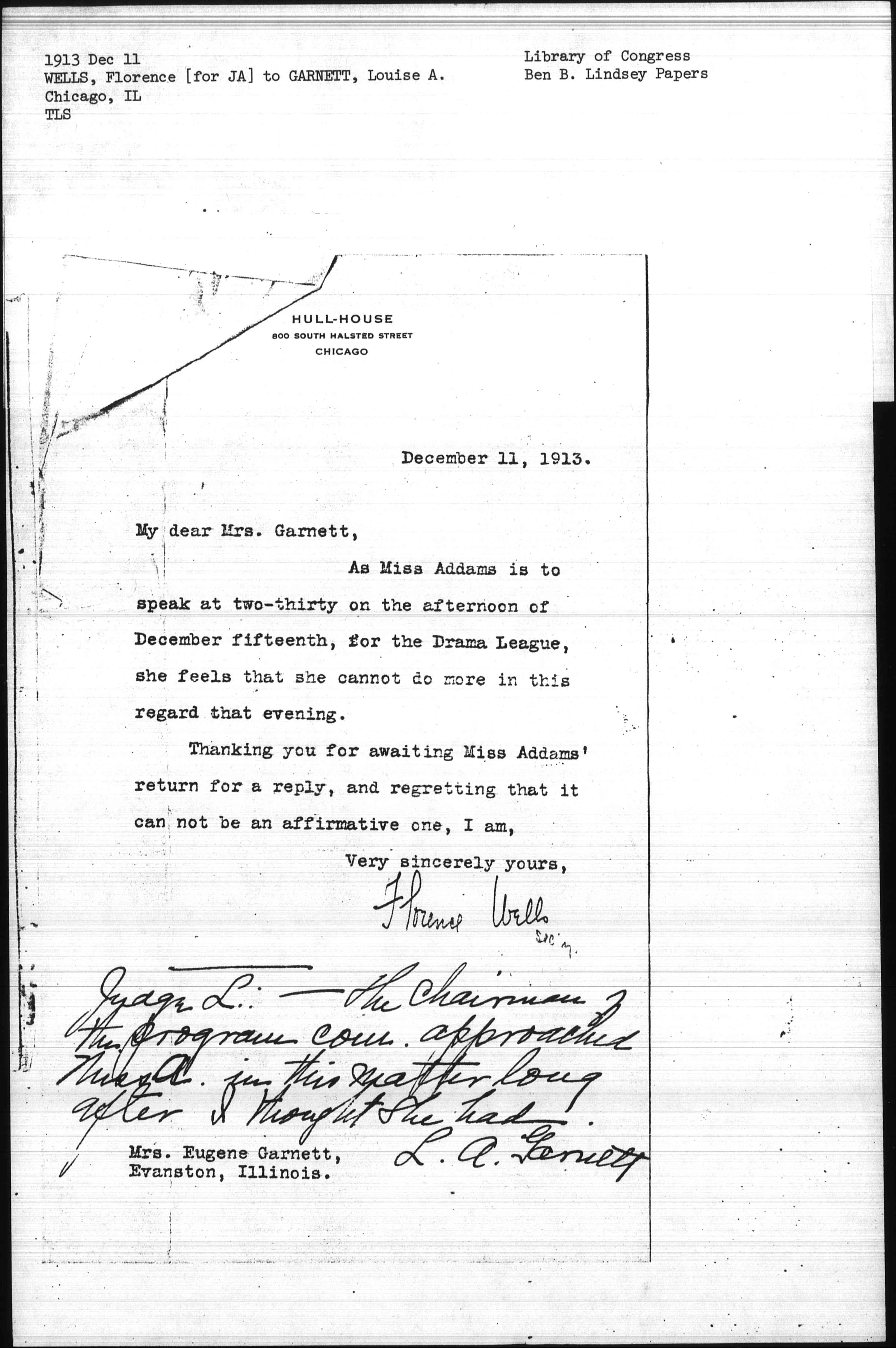 As Miss Addams is to speak at two-thirty on the afternoon of December fifteenth, for the Drama League, she feels that she cannot do more in this regard that evening.
