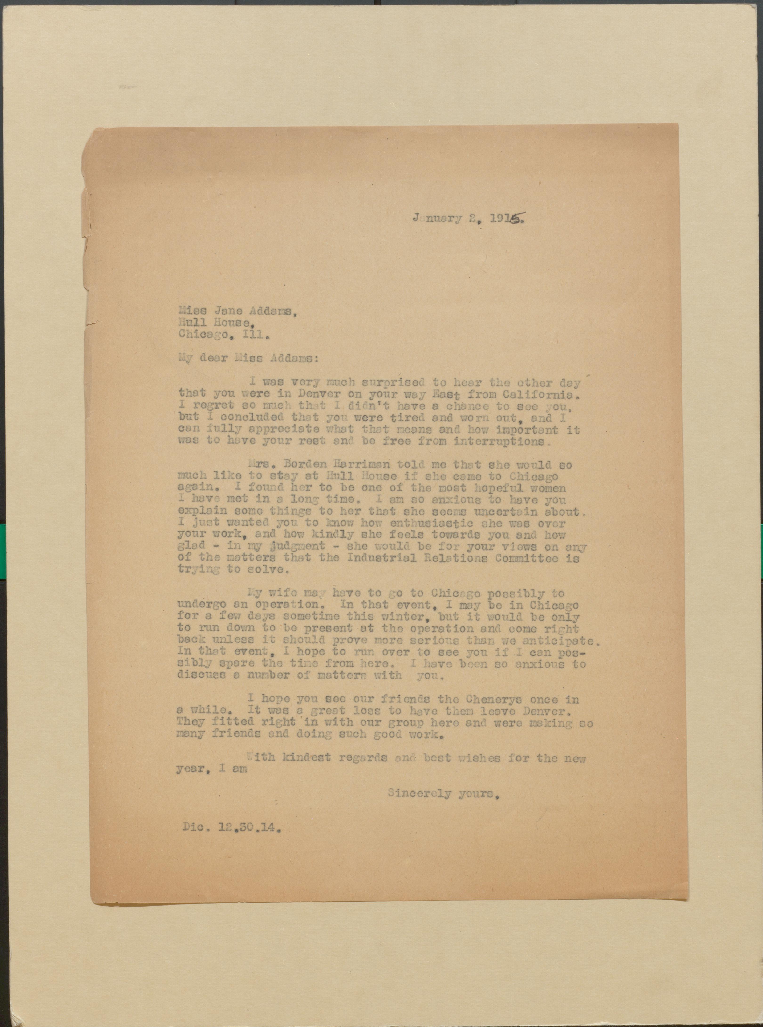 Mrs. Borden Harriman told me that she would so much like to stay at Hull House if she came to Chicago again. I found her to be one of the most hopeful women I have met in a long time. I am so anxious to have you explain some things to her that she seems uncertain about. I just wanted you to know how enthusiastic she was over your work, and how kindly she feels towards you and how glad -- in my judgment -- she would be for your views on any of the matters that the Industrial Relations Committee is trying to solve.