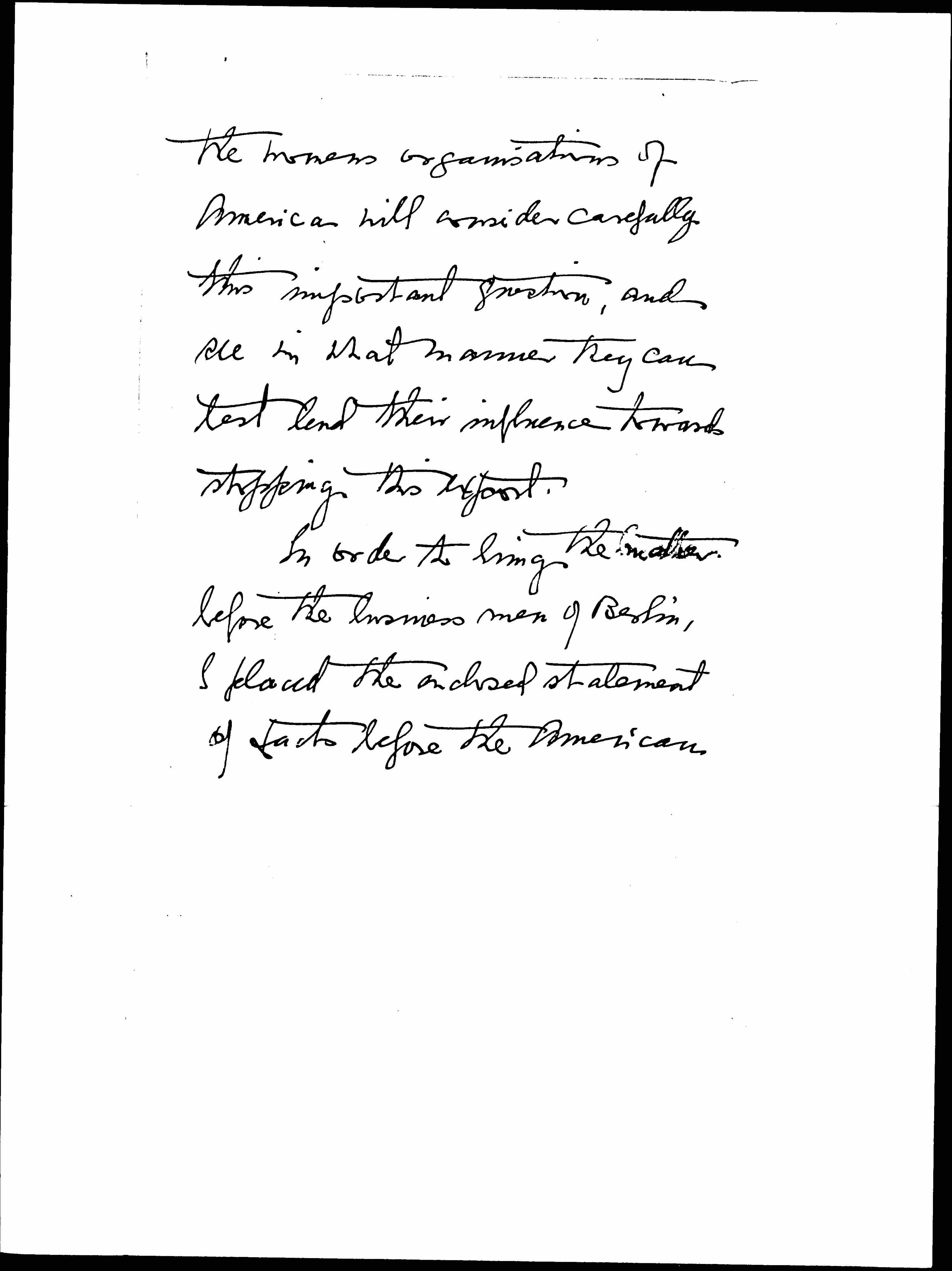In order to bring the matter before the business men of Berlin, I placed the enclosed statement of facts before the American [page 3] Association of Commerce and Trade. I send you this paper, as it may, in some way, aid your efforts in our country. It is, of course, only of private nature and interest.