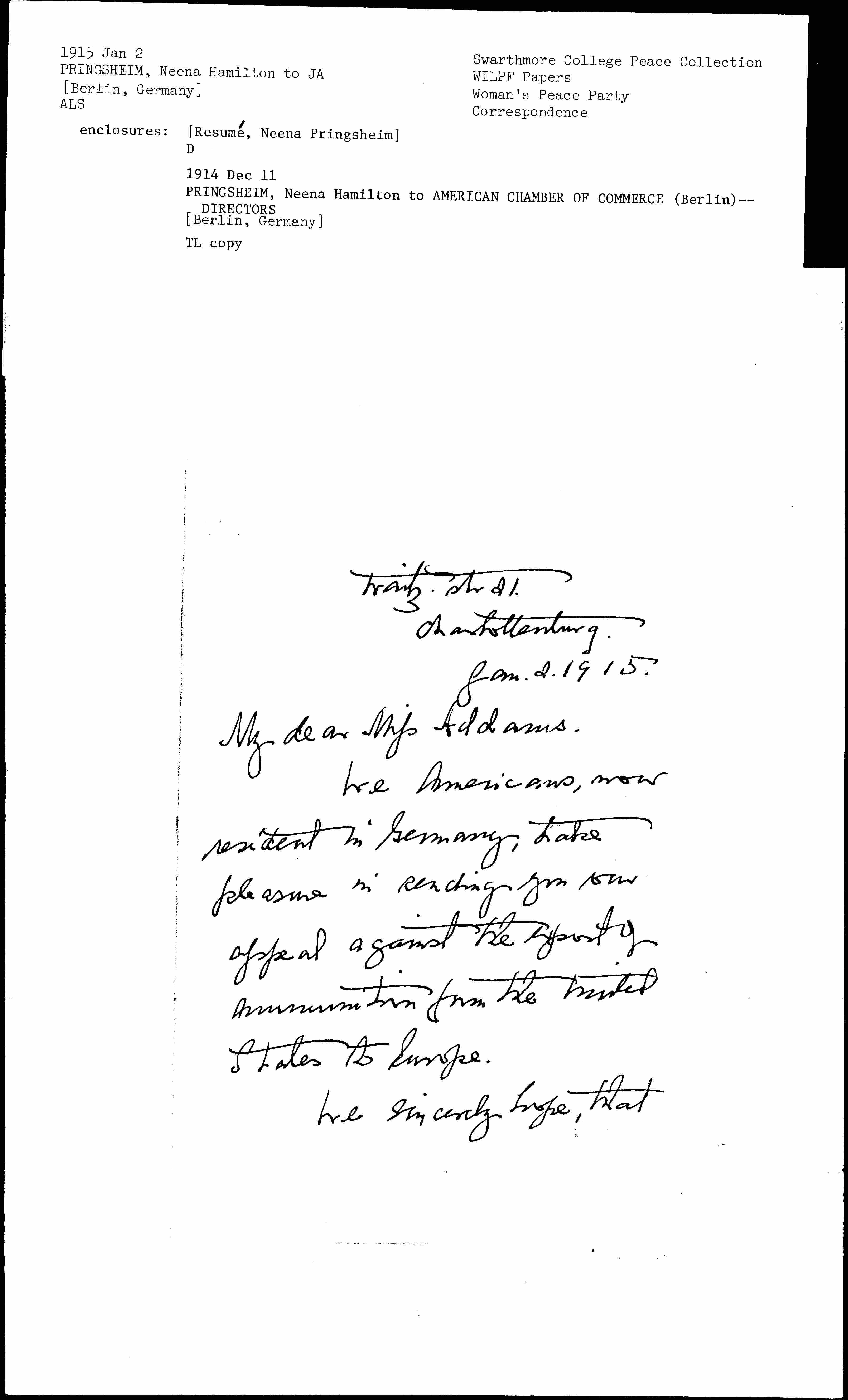 We Americans, now resident in Germany, take pleasure in sending you our appeal against the export of ammunition from the United States to Europe.