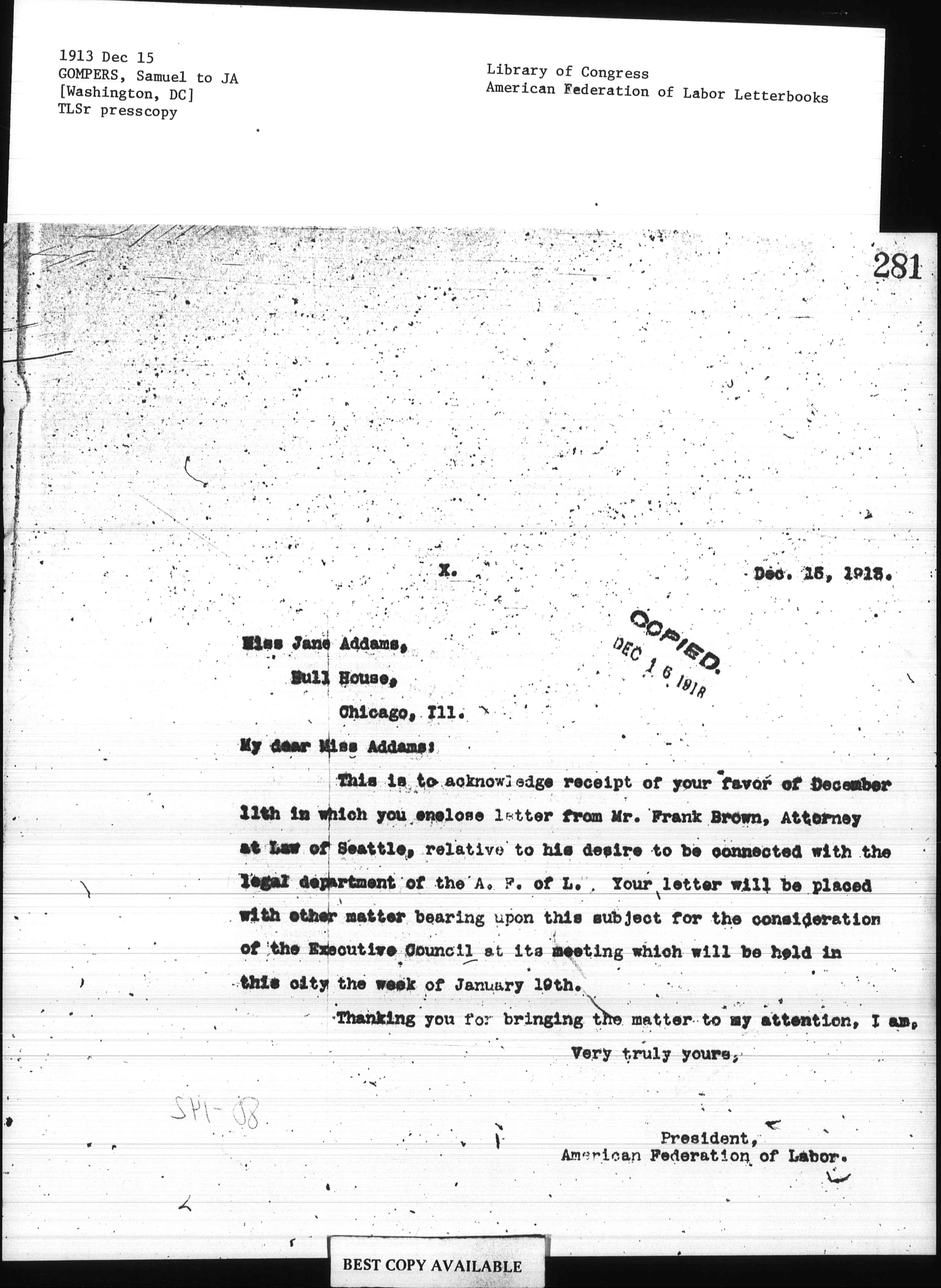 This is to acknowledge receipt of your favor of December 11th in which you enclose letter from Mr. Frank Brown, Attorney at Law of Seattle, relative to his desire to be connected with the legal department of the A. F. of L. Your letter will be placed with other matter bearing upon this subject for the consideration of the Executive Council at its meeting which will be held in this city the week of January 19th.