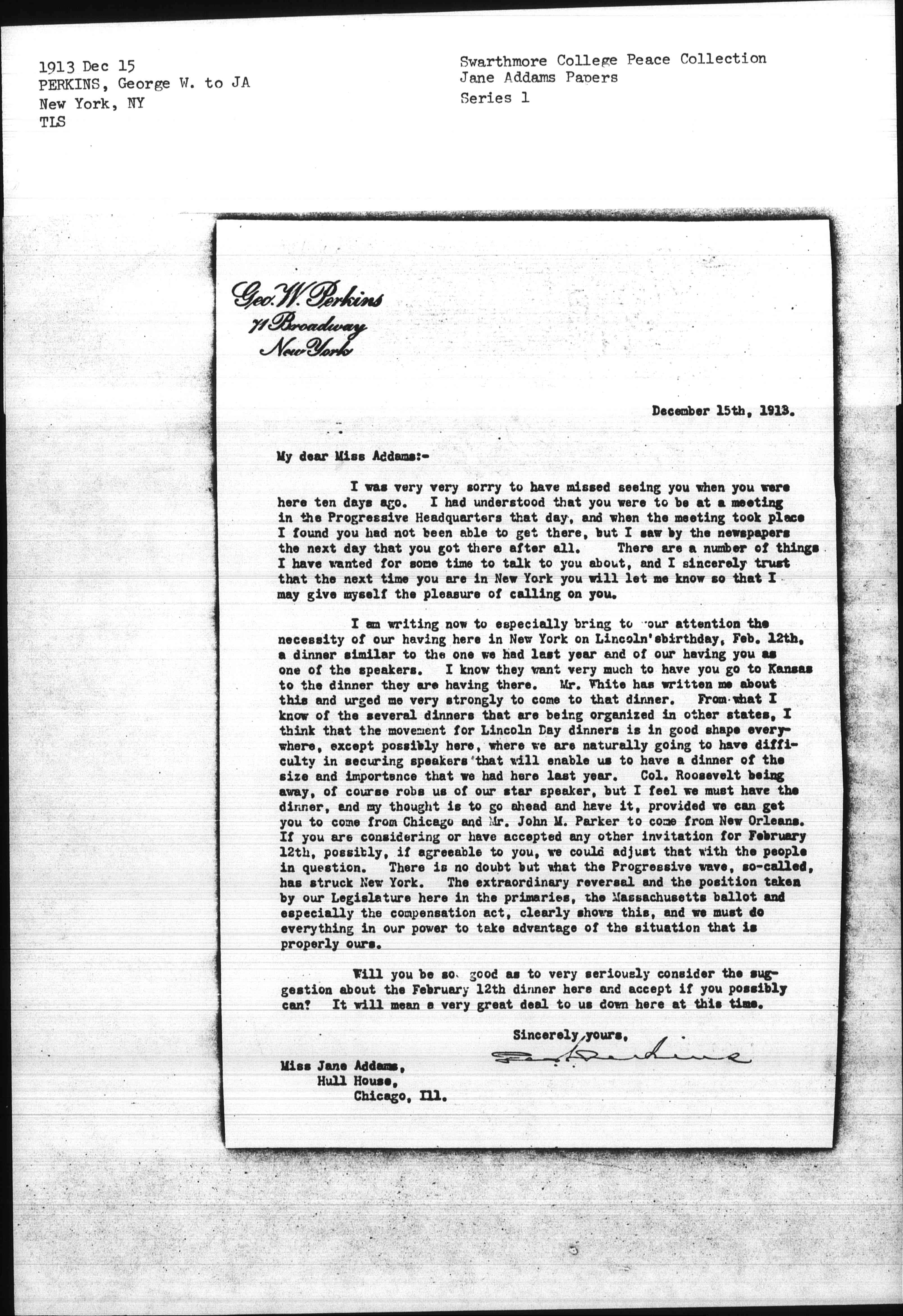 I am writing now to especially bring to your attention the necessity of our having here in New York on Lincoln's birthday, Feb. 12th, a dinner similar to the one we had last year and of our having you as one of the speakers. I know they want very much to have you go to Kansas to the dinner they are having there. Mr. White has written me about this and urged me very strongly to come to that dinner. From what I know of the several dinners that are being organized in other states, I think that the movement for Lincoln Day dinners is in good shape everywhere, except possibly here, where we are naturally going to have difficulty in securing speakers that will enable us to have a dinner of the size and importance that we had here last year. Col. Roosevelt being away, of course robs us of our star speaker, but I feel we must have the dinner, and my thought is to go ahead and have it, provided we can get you to come from Chicago and Mr. John M. Parker to come from New Orleans. If you are considering or have accepted any other invitation for February 12th, possibly, if agreeable to you, we could adjust that with the people in question. There is no doubt but what the Progressive wave, so-called, has struck New York. The extraordinary reversal and the position taken by our Legislature here in the primaries, the Massachusetts ballot and especially the compensation act, clearly shows this, and we must do everything in our power to take advantage of the situation that is properly ours.