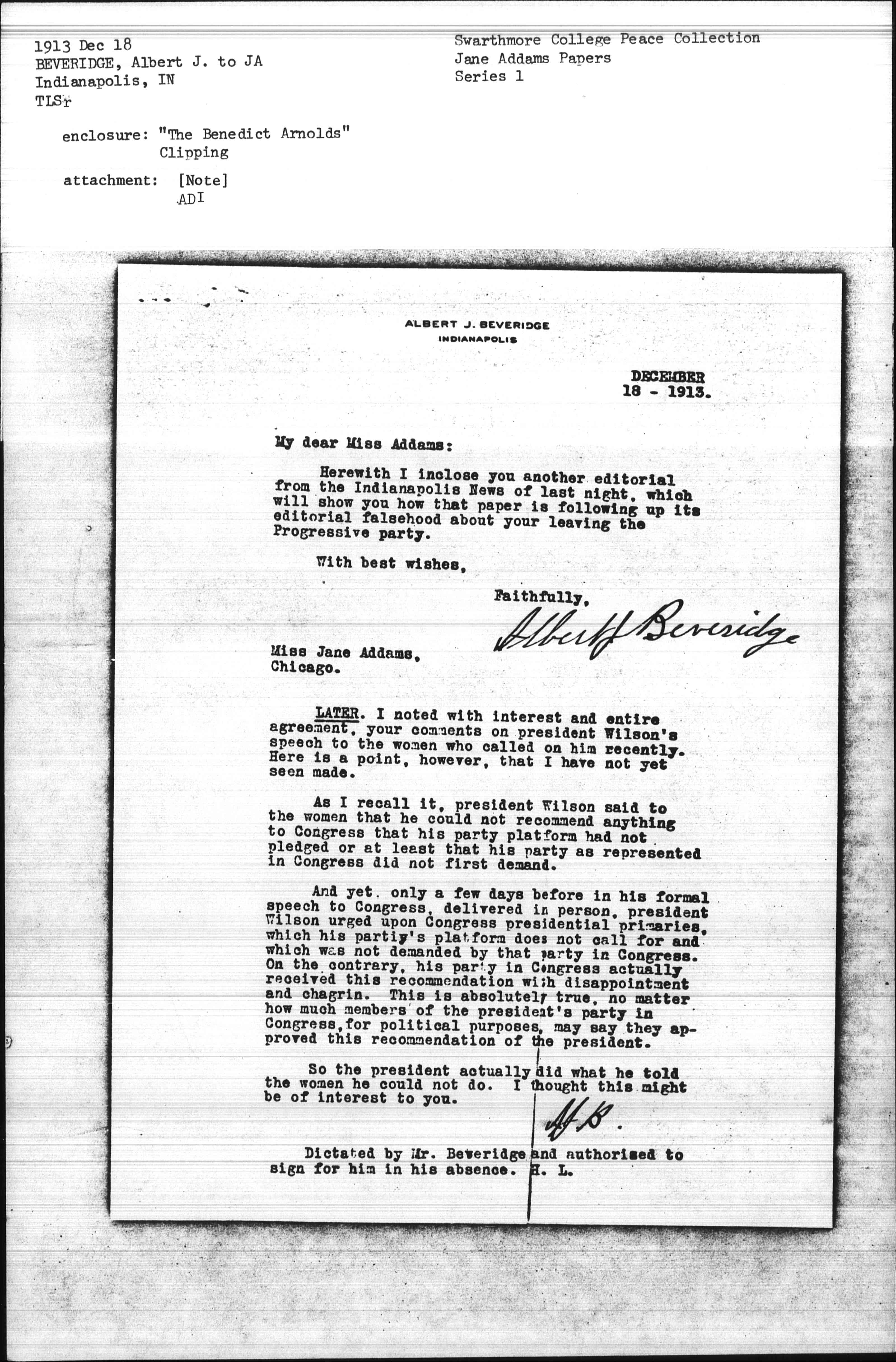 Dictated by Mr. Beveridge and authorized to sign for him in his absence. H. L.