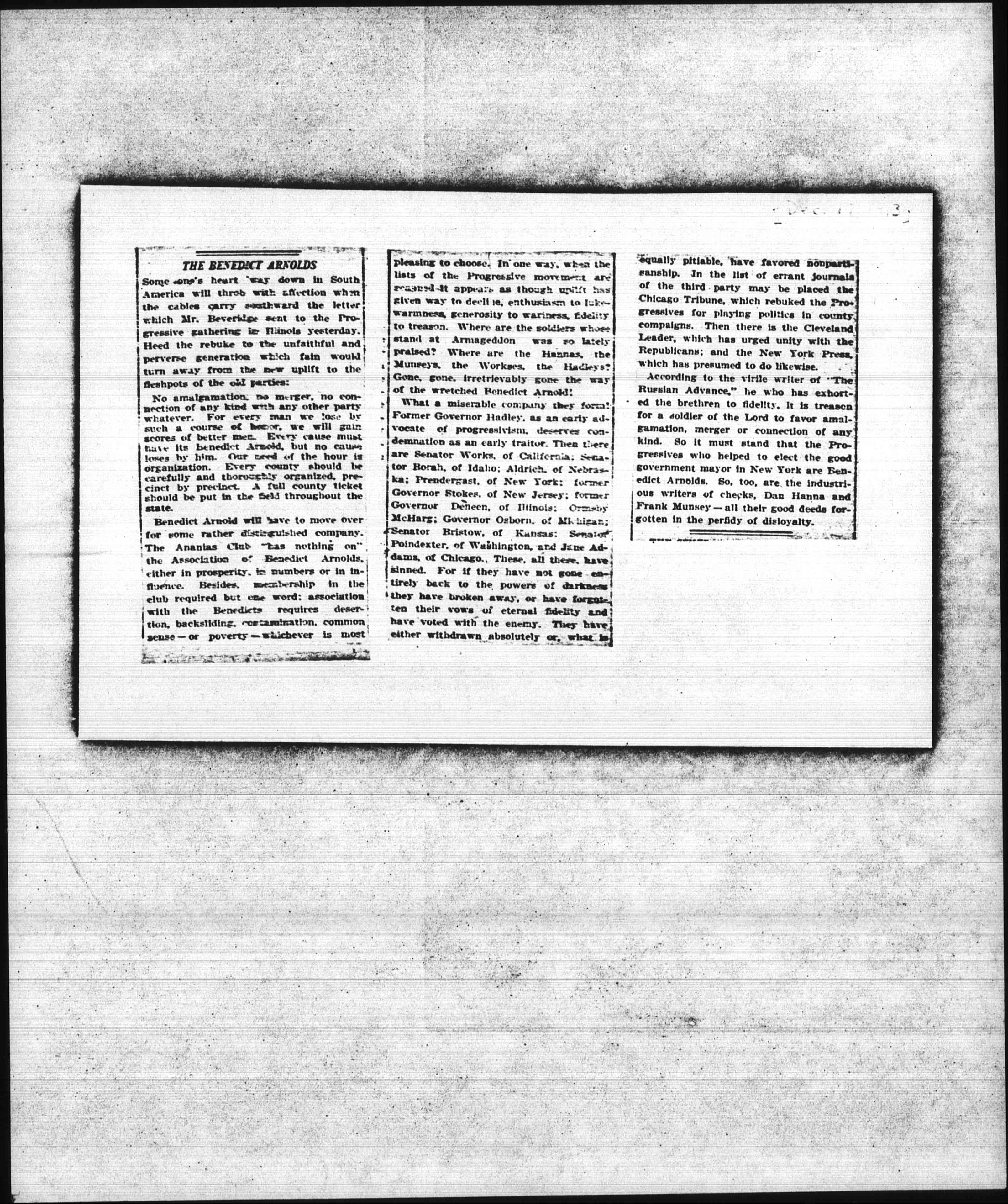 Benedict Arnold will have to move over for some rather distinguished company. The Ananias Club "has nothing on" the Association of Benedict Arnolds, either in prosperity, in numbers or in influence. Besides, membership in the club required but one word: association with the Benedicts requires desertion, backsliding, contamination, common sense -- or poverty -- whichever is most pleasing to choose. In one way, when the lists of the Progressive movement are [reared?] it appears as though uplift has given way to decline, enthusiasm to lukewarmness, generosity to wariness, fidelity to treason. Where are the soldiers whose stand at Armageddon was so lately praised? Where are the Hannas, the Munseys, the Workses, the Hadleys? Gone, gone, irretrievably gone the way of the wretched Benedict Arnold!
