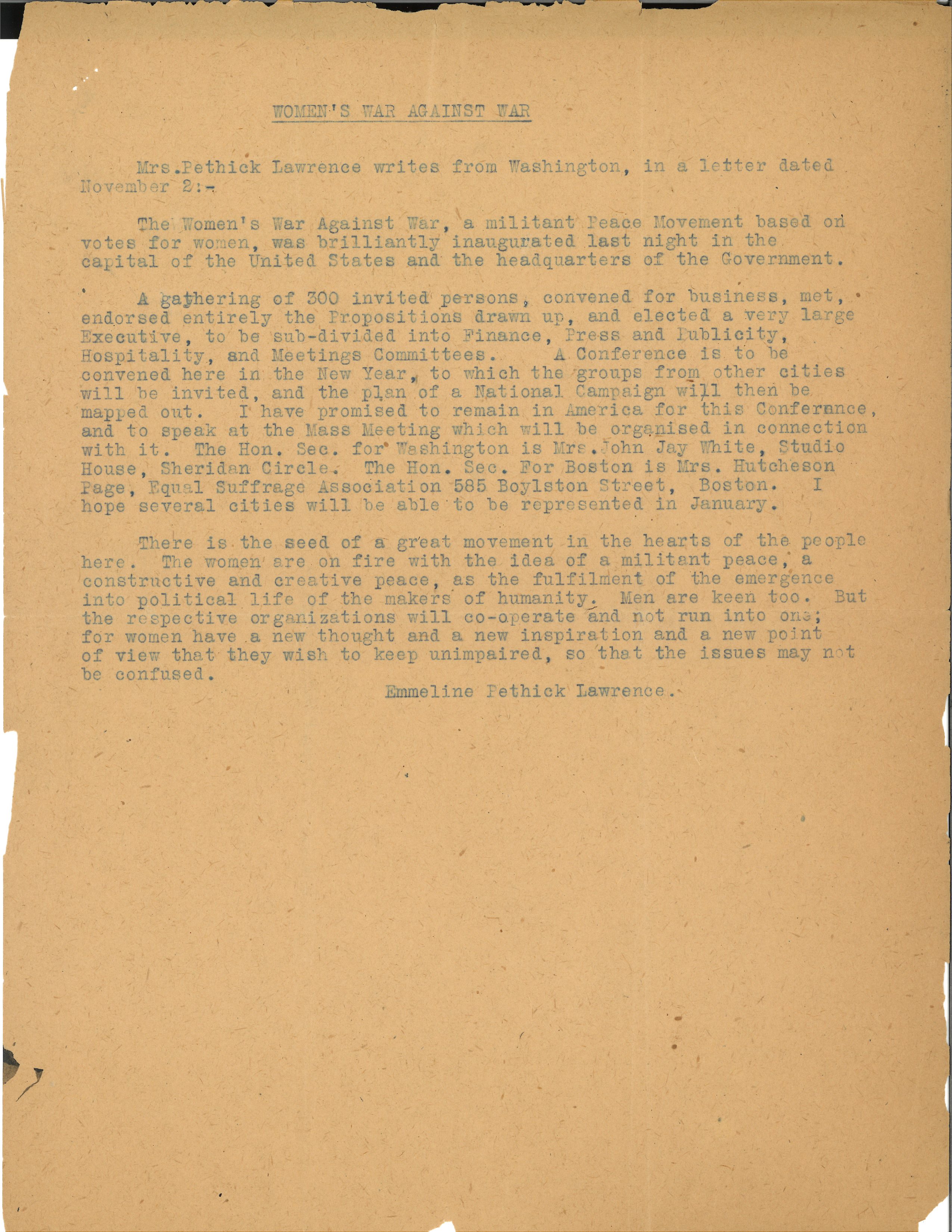 There is a seed of a great movement in the hearts of the people here. The women are on fire with the idea of a militant peace, a constructive and creative peace, as the fulfilment of the emergence into political life of the makers of humanity. Men are keen too. But the respective organizations will [cooperate] and not run into one; for women have a new thought and a new inspiration and a new point of view that they wish to keep unimpaired, so that the issues may not be confused.